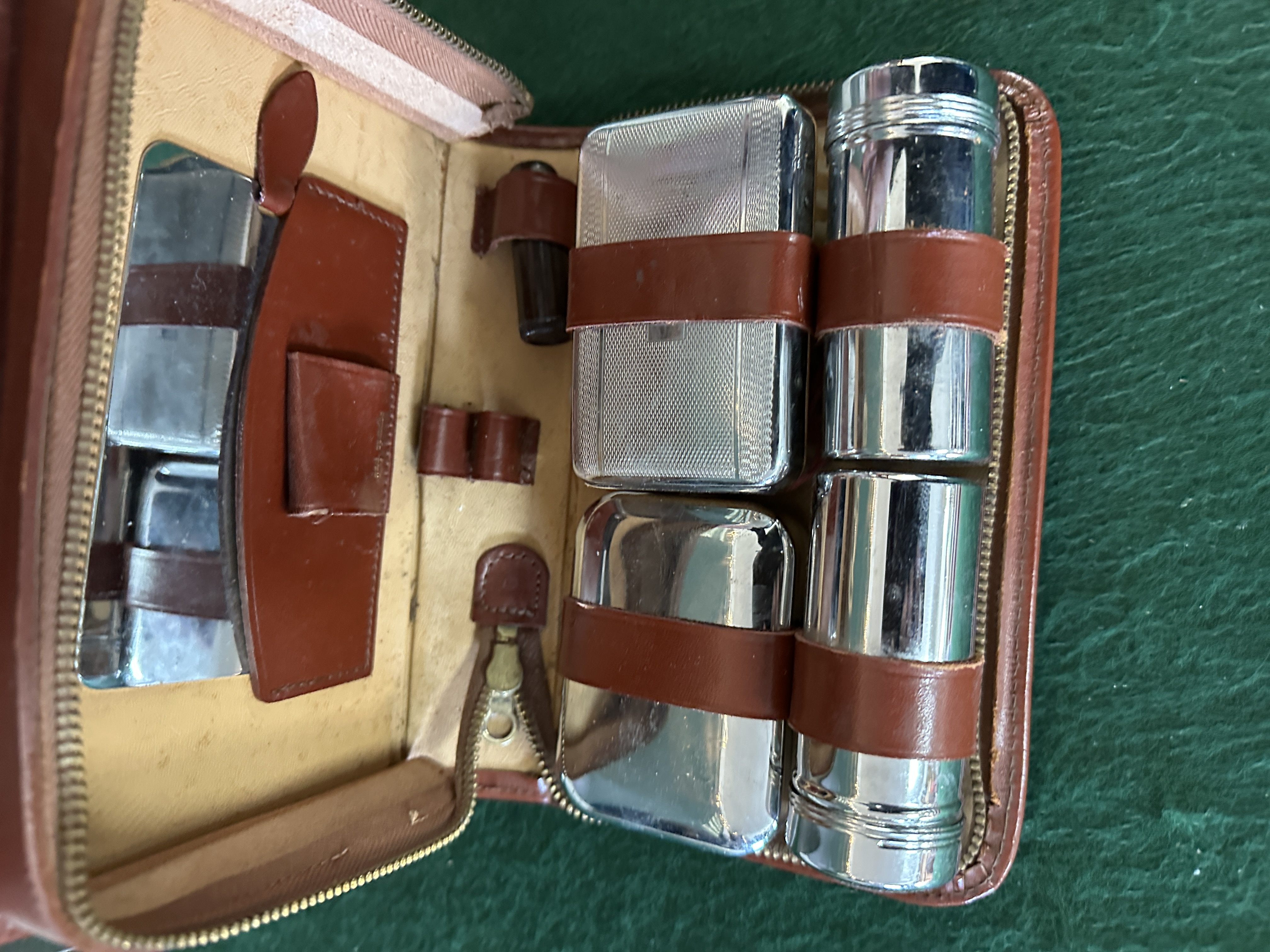 A mid-century men’s travel grooming kit housed in a brown leather zippered case. The rectangular case opens to reveal a buff-coloured interior lining with a group of chrome-plated metal accessories secured by leather straps. These components include cylindrical tubes, a rectangular case featuring an engine-turned guilloché pattern, and a plain polished rectangular container. The kit also features an integrated mirror on the inner lid and multiple leather loops for additional grooming implements. The exterior leather features stitched edges and a metal zip closure.