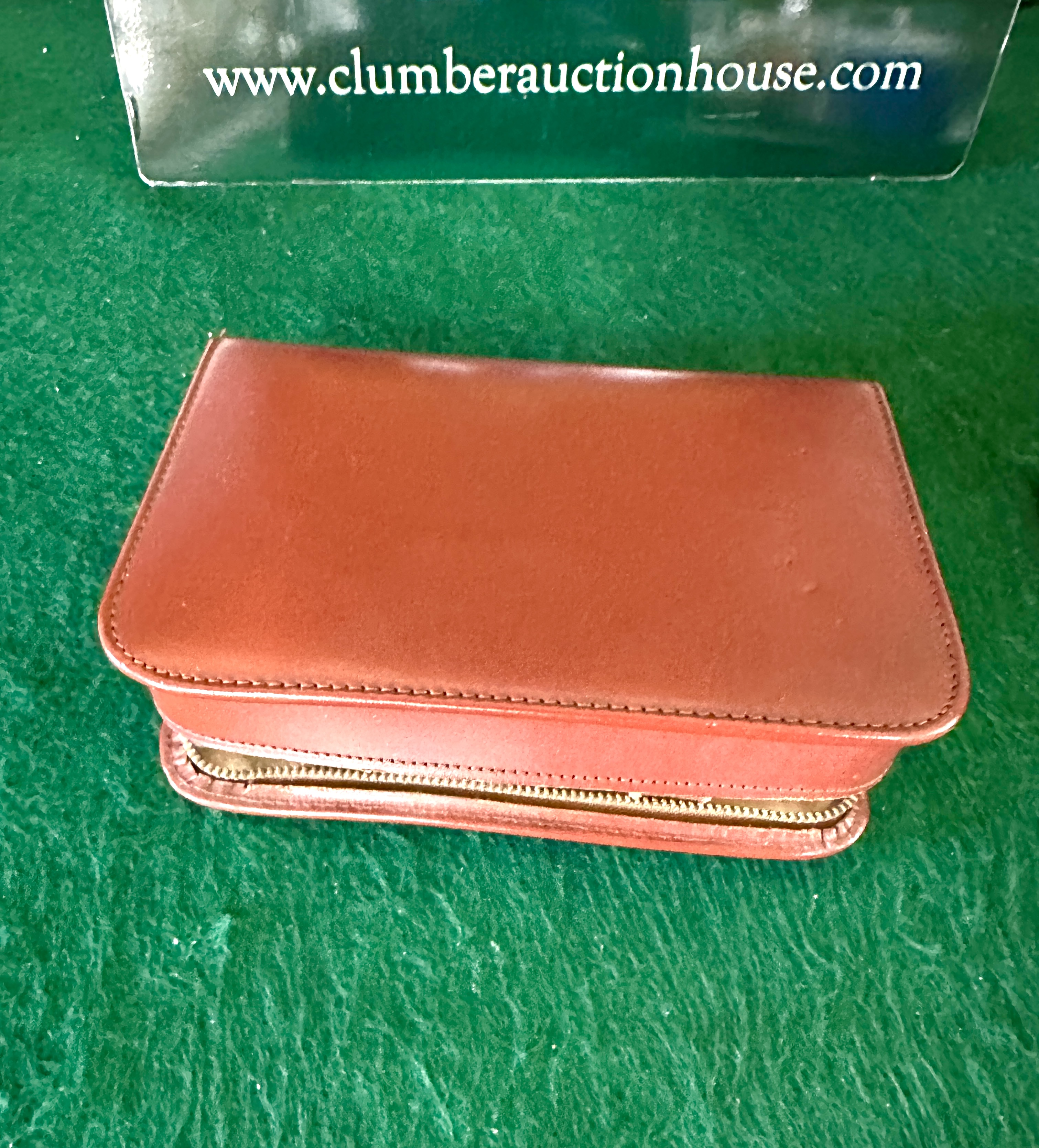 The set is in good vintage condition. The exterior leather shows minor scuffing and surface wear consistent with age and use. The metal components exhibit light surface scratches and minor tarnish. The interior lining shows light signs of use.