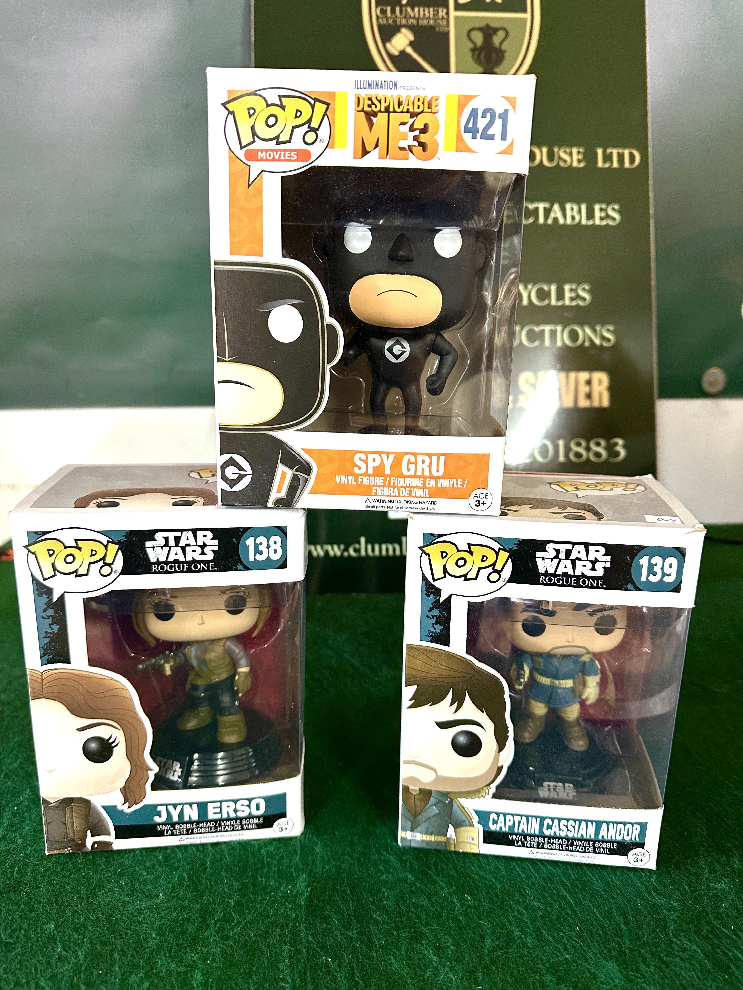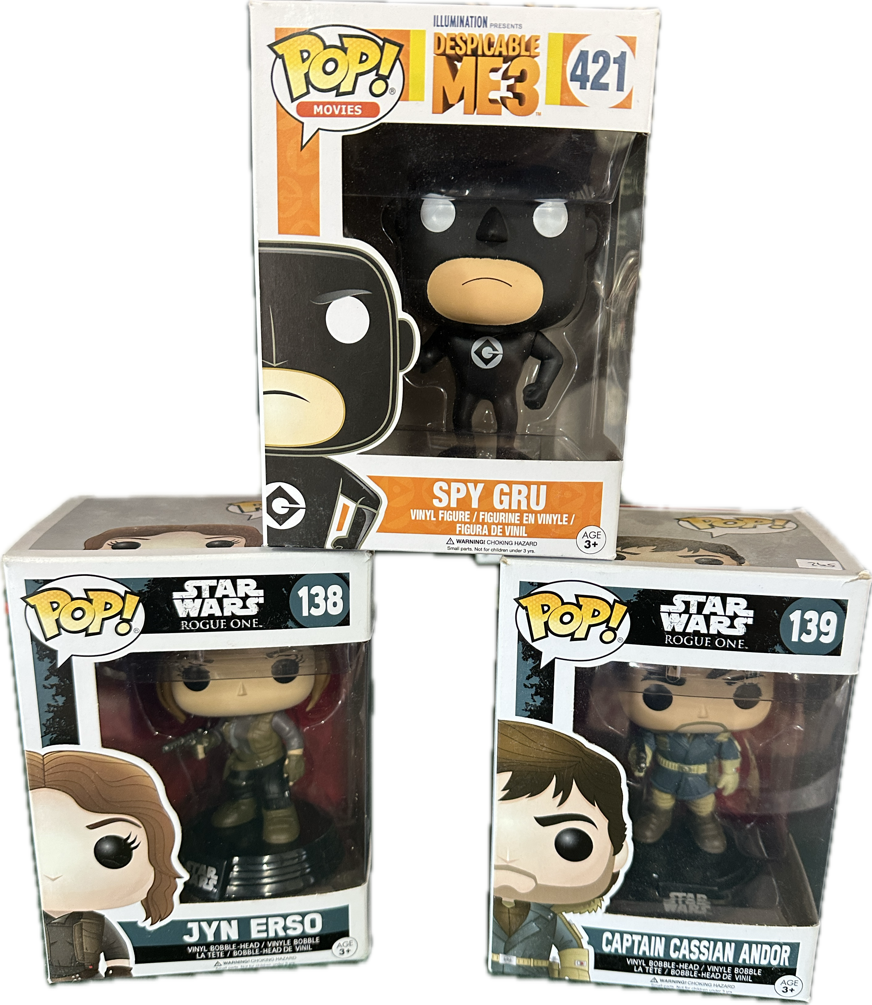 A trio of Funko Pop! vinyl collectible figures from the Movies and Star Wars series. The collection comprises Spy Gru from Despicable Me 3 (number 421), Jyn Erso from Star Wars: Rogue One (number 138), and Captain Cassian Andor from Star Wars: Rogue One (number 139). The Star Wars figures are constructed as vinyl bobble-heads on integrated display bases, whereas the Gru figure is a standard vinyl figure. All items are contained within their original manufacturer window box packaging featuring character illustrations and official logos.
