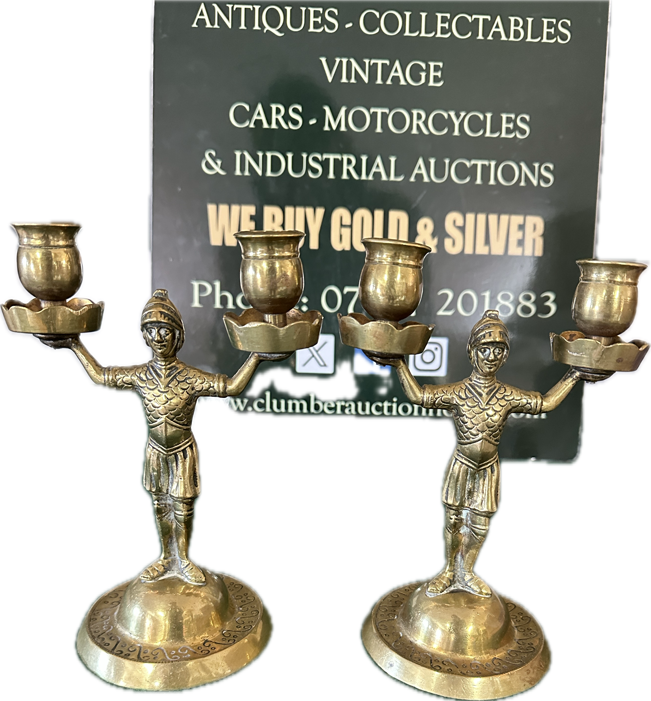 A pair of figural cast brass candelabra in the French Empire style, identified as the Lumière model. Each piece depicts a soldier in classical-style armour holding two candle cups aloft. The figures feature detailed relief work on the breastplates and helmets, standing upon circular domed bases with scrolled decorative borders. Each arm terminates in a scalloped bobeche and a flared candle cup. The items are constructed from cast brass with a natural aged finish.