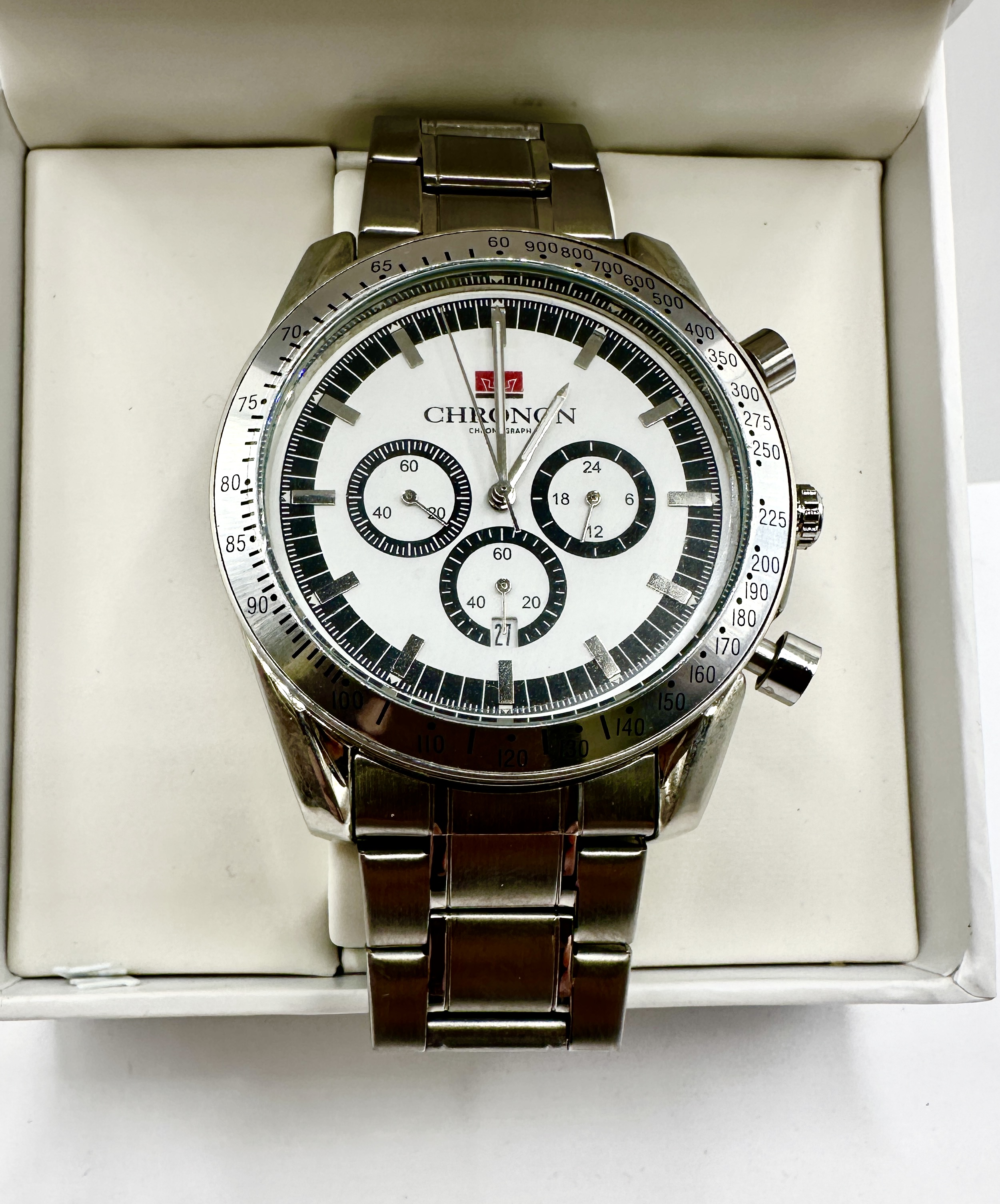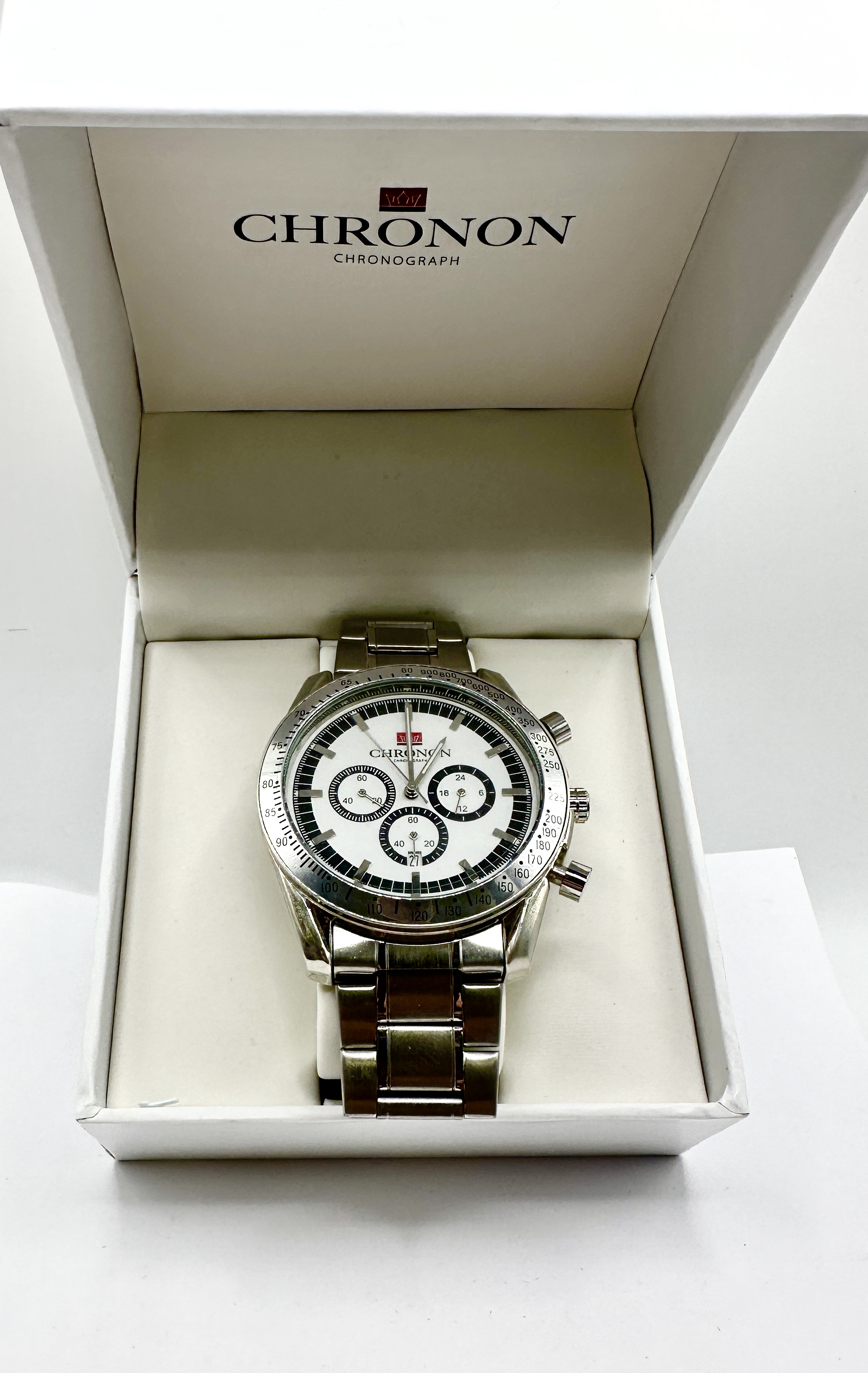 A Chronon chronograph wristwatch featuring a stainless steel case and matching three-link bracelet. The white dial is detailed with a black outer ring, three sub-dials positioned at the 3, 6, and 9 o’clock markers, and a date aperture at the 6 o’clock position. The brand name and a red crown logo are situated below the 12 o’clock marker. The watch is designed with a fixed tachymeter bezel, two side pushers, and a central winding crown. Presented in the original white presentation box with the brand logo to the interior lid.