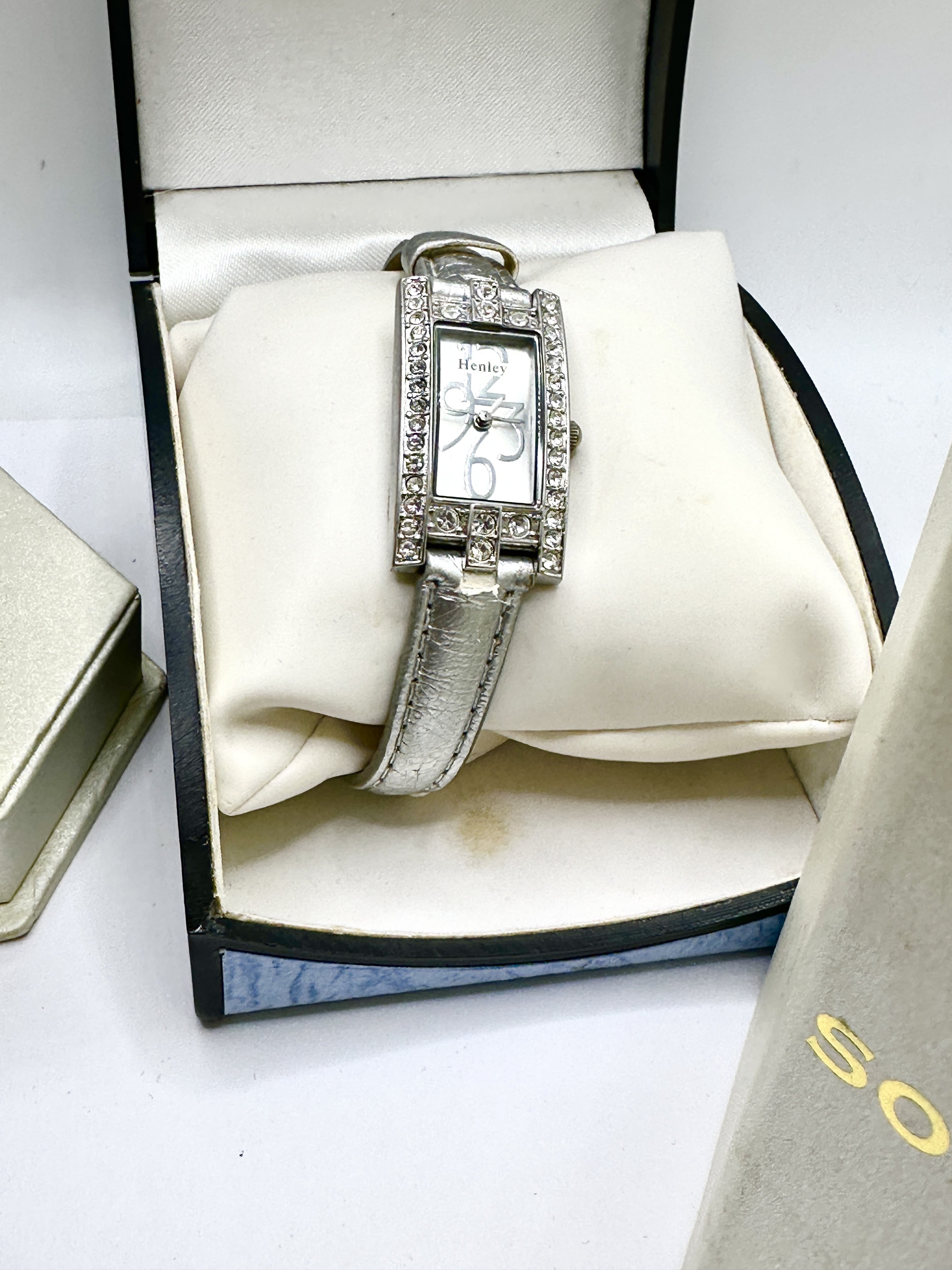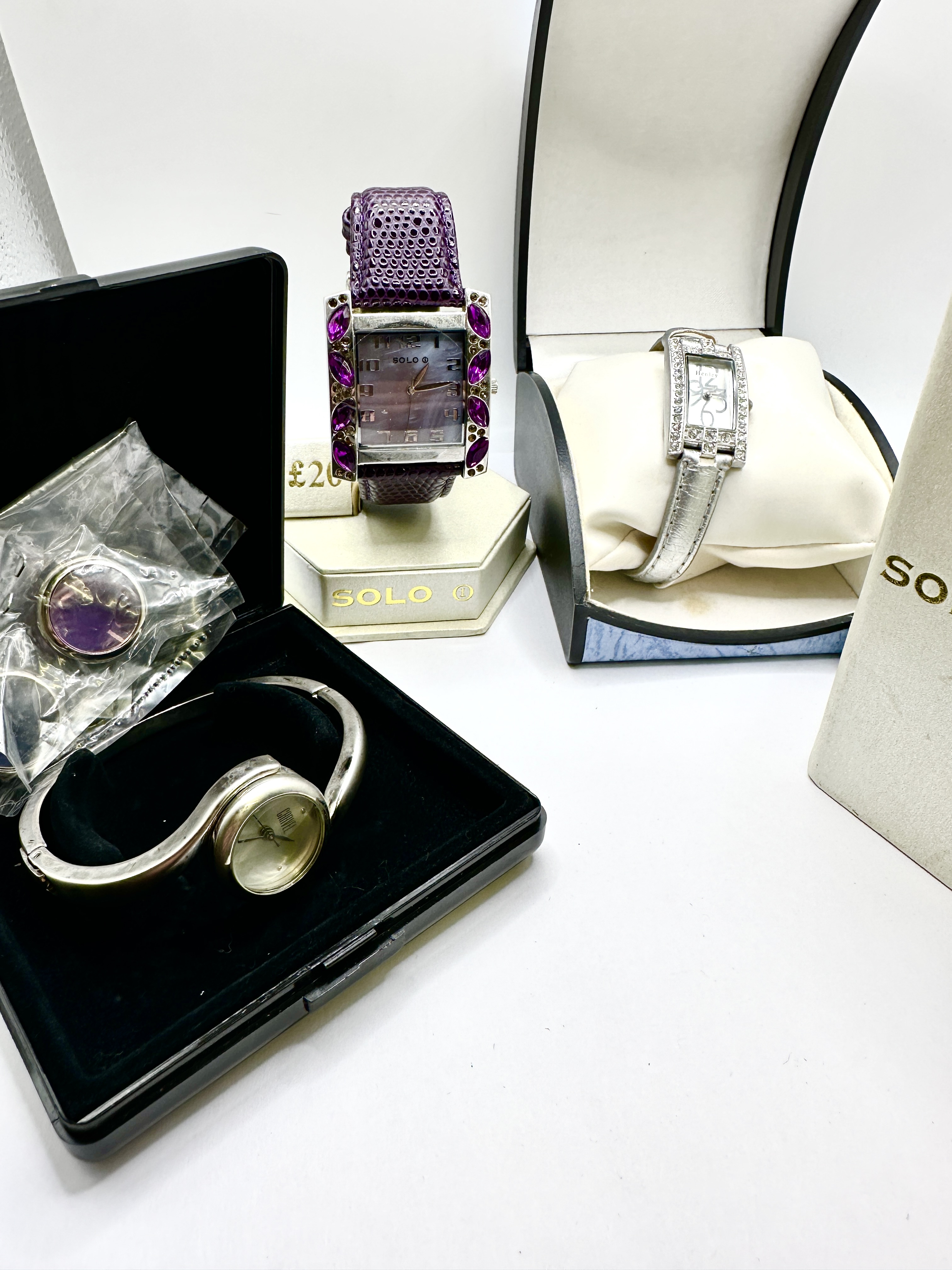 A group of contemporary ladies’ fashion wristwatches and accessories. The lot includes a SOLO brand wristwatch featuring a rectangular mother-of-pearl effect dial with Arabic numerals, set in a silver-tone case accented by marquise-cut purple stones and a purple lizard-patterned leather strap. Also present is a Henley wristwatch with a rectangular silver-tone dial and crystal-embellished bezel on a metallic silver-tone strap, housed in a presentation box. Completing the collection is a silver-tone bangle-style watch with a circular dial and several additional interchangeable circular watch inserts in plastic packaging. The items are constructed from base metals with silver-tone plating, synthetic stones, and various strap materials including textured leather and metallic-finish synthetics.