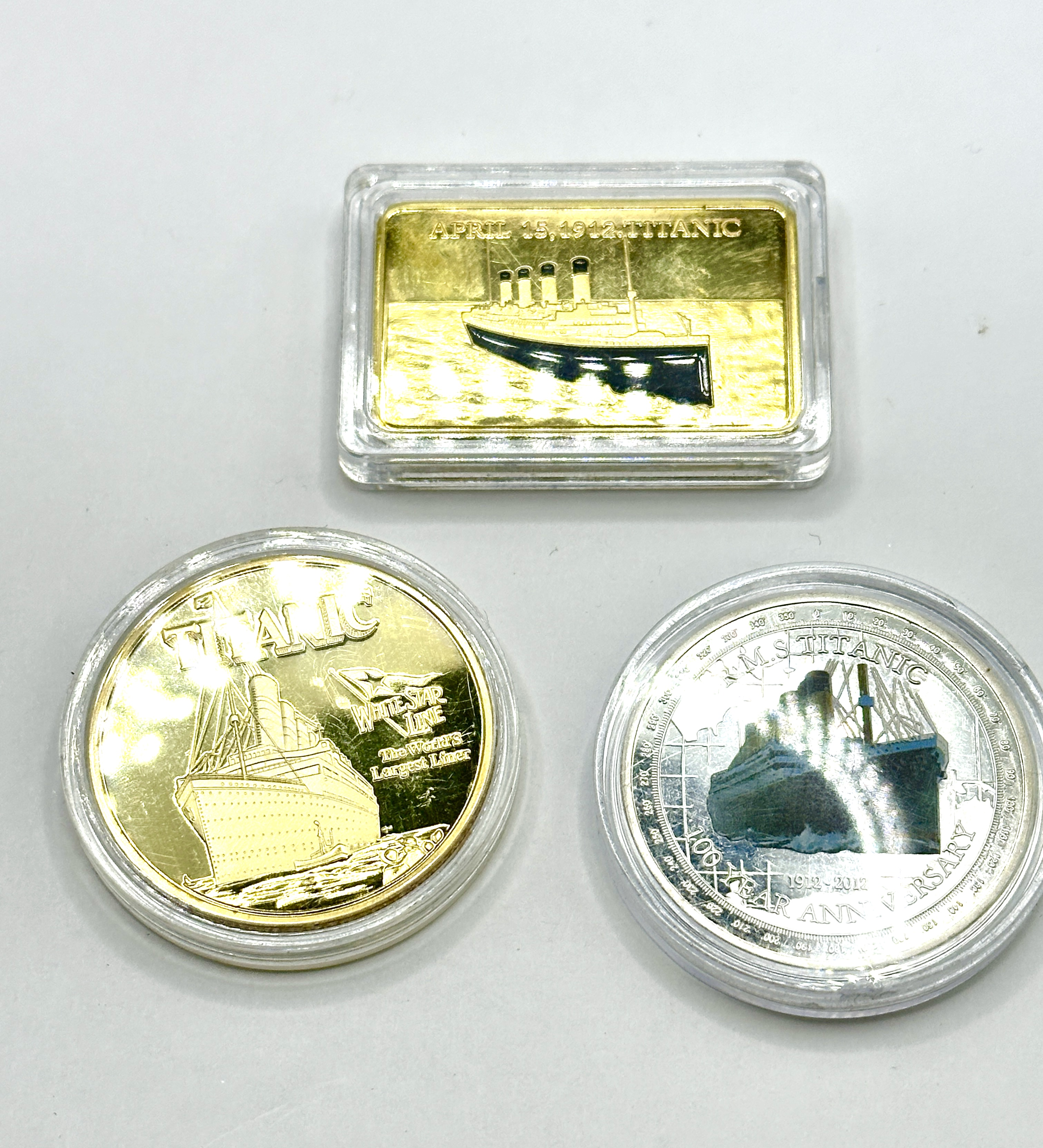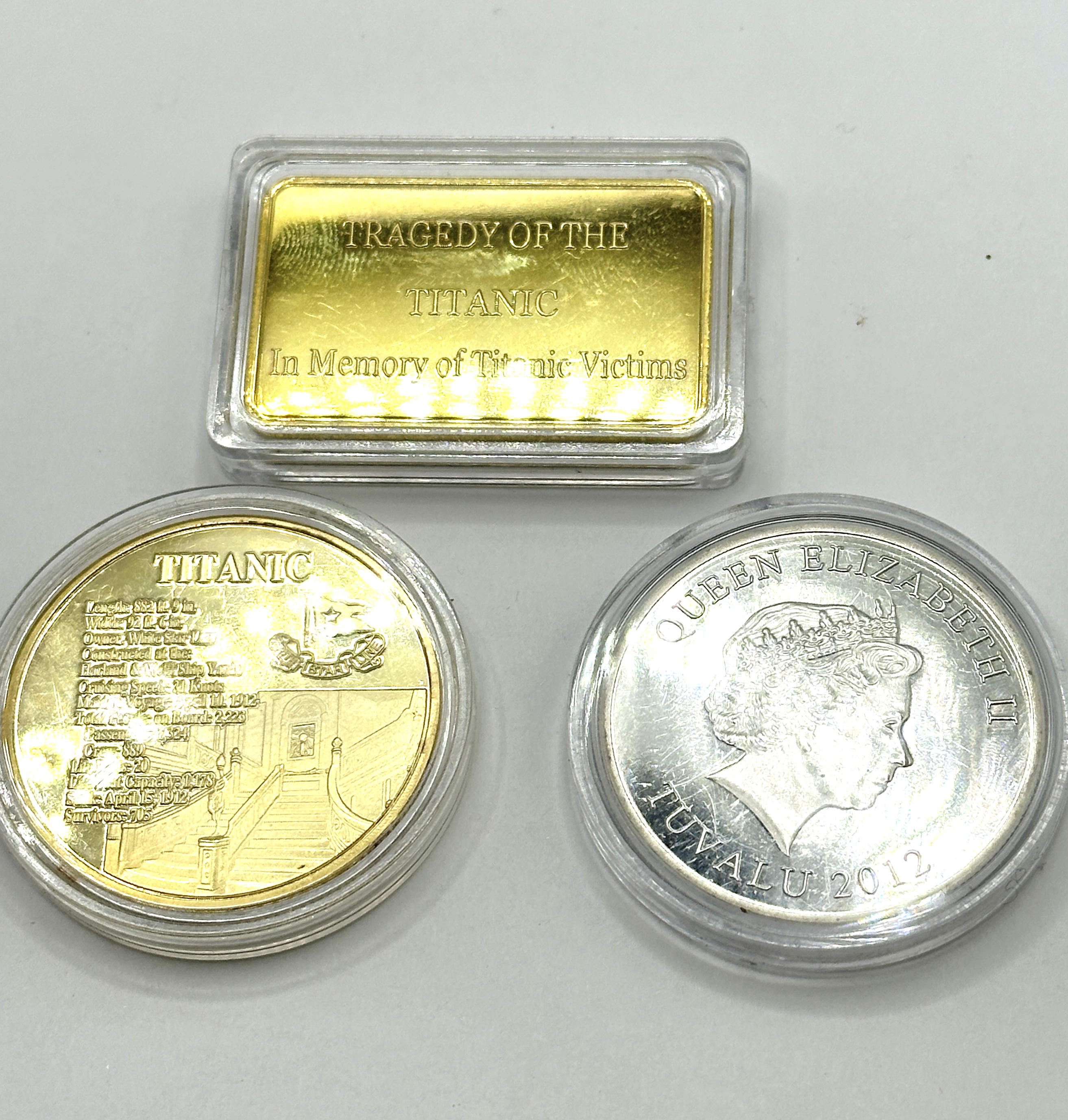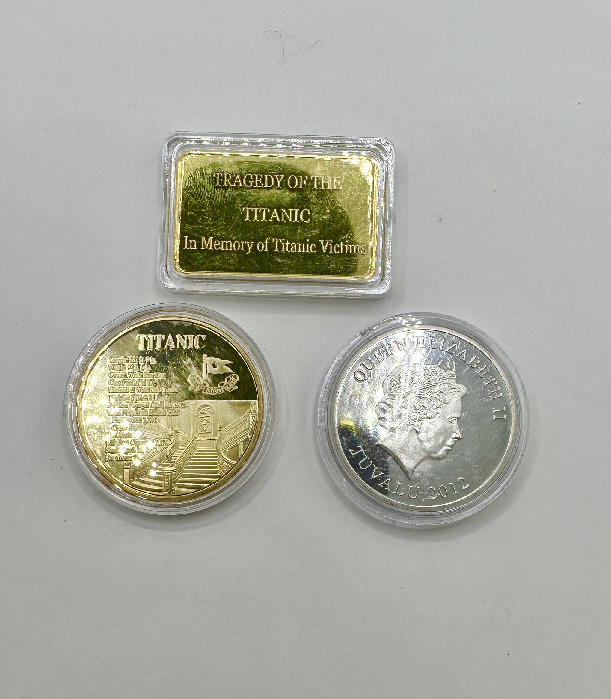 A collection of commemorative items produced to honour the R.M.S. Titanic, comprising a gold-plated rectangular bar, a gold-plated round medallion, and a silver-plated coin. The rectangular bar is inscribed Tragedy of the Titanic and In Memory of Titanic Victims, with a depiction of the ship and the date April 15, 1912 on the reverse. The gold-plated round medallion features the ship technical specifications and an image of the grand staircase, while the reverse depicts the ship as The World’s Largest Liner for the White Star Line. The silver-plated piece is a 2012 commemorative coin from Tuvalu, featuring the profile of Queen Elizabeth II on the obverse and a 100 Year Anniversary (1912-2012) design of the R.M.S. Titanic on the reverse. All items are presented in individual protective clear plastic capsules.