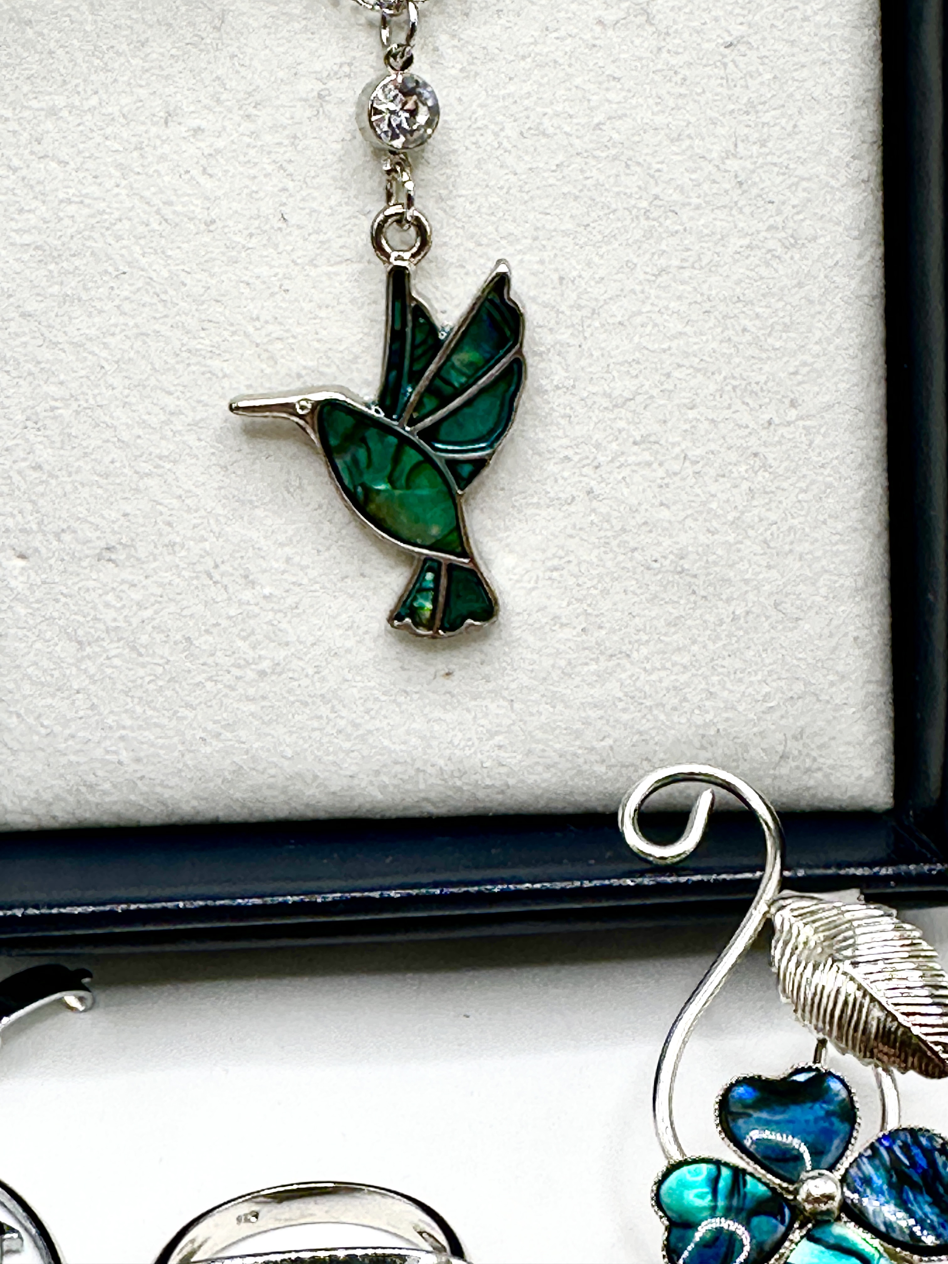 A collection of silver- tone jewellery featuring nature-inspired motifs and iridescent shell inlays. The group includes a linked bracelet featuring oval segments with dolphin motifs and abalone shell inlays. Also included is a necklace with a hummingbird pendant featuring green paua shell inlays, suspended from a fine chain and presented in a display box. The collection further contains a floral brooch with blue-green shell petals and textured metal leaves, and rings set with large chatoyant stones, one of which bears a 925 hallmark to the shank indicating sterling silver composition.