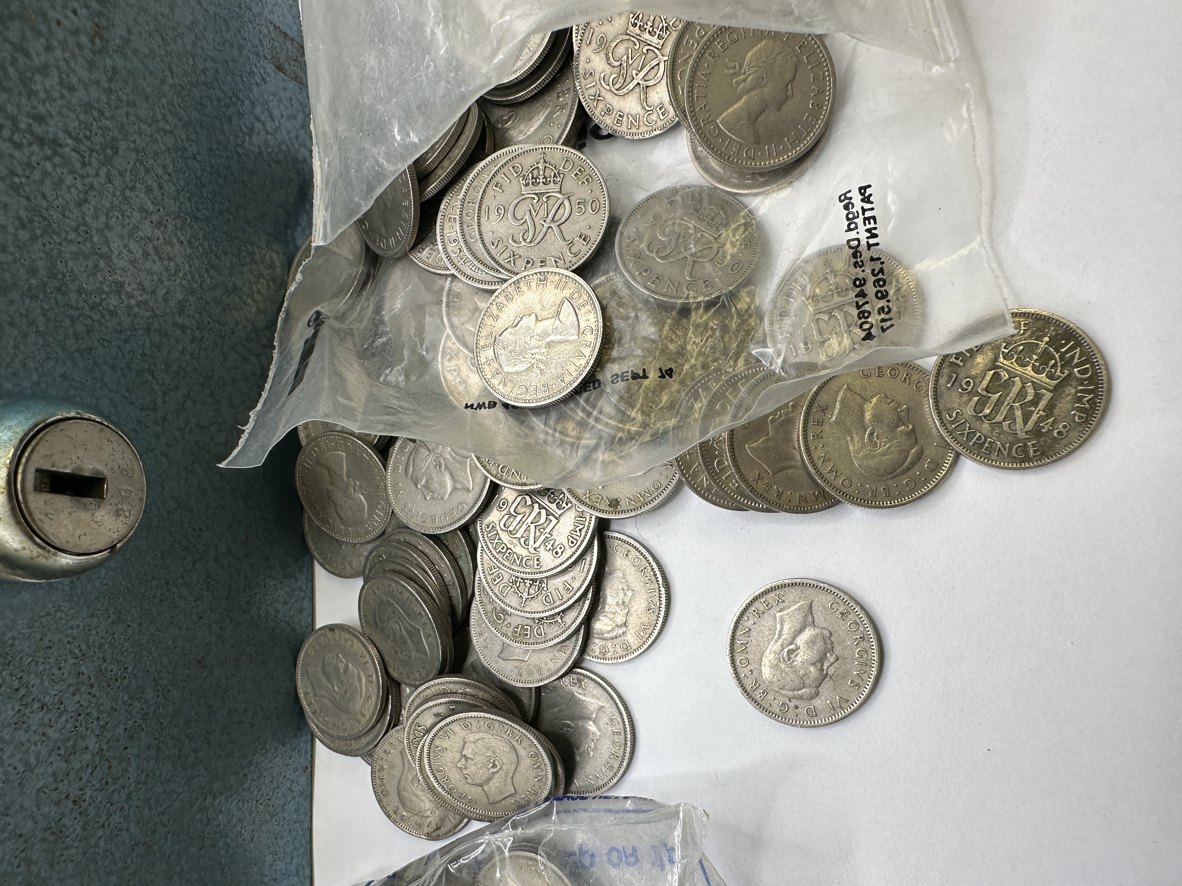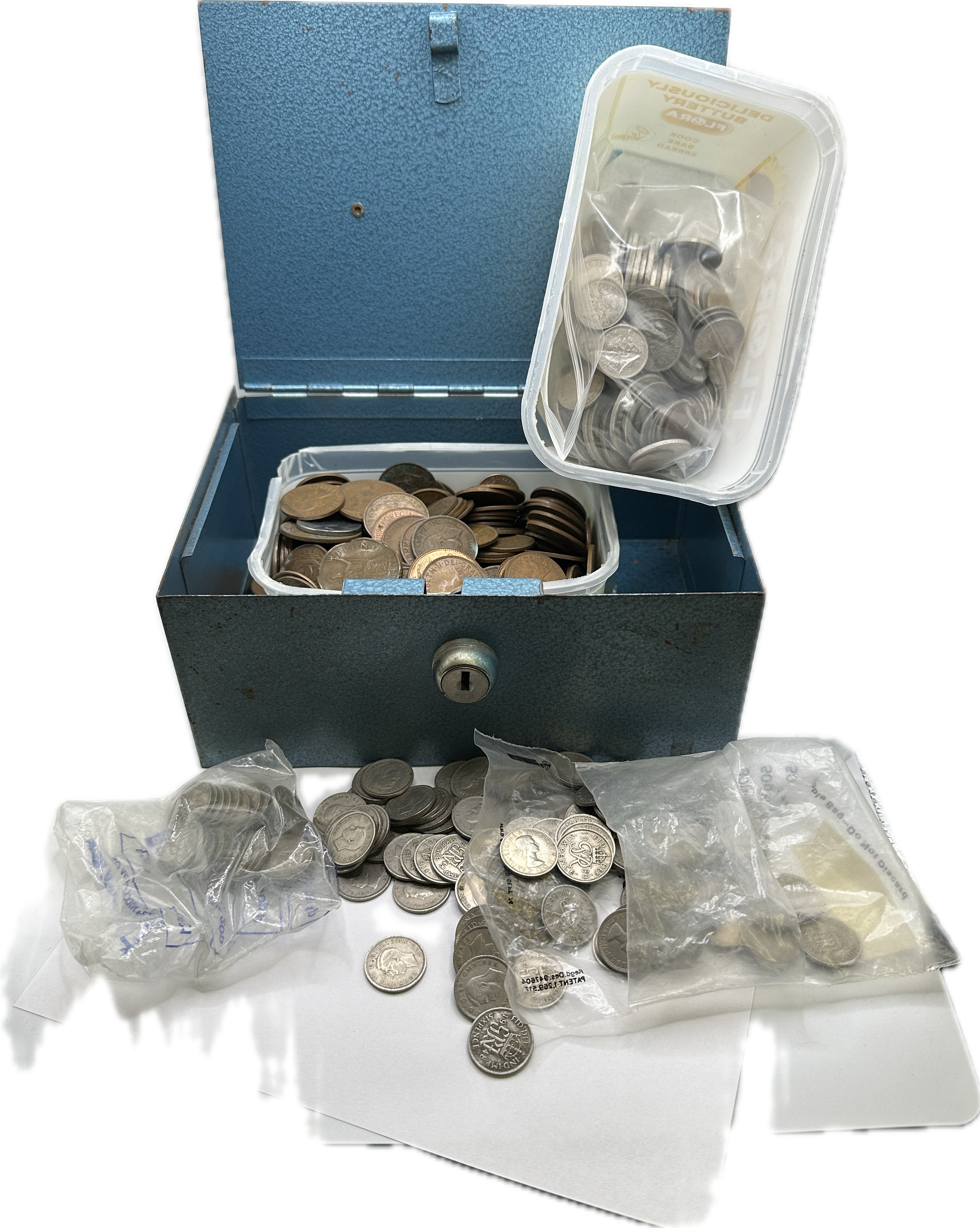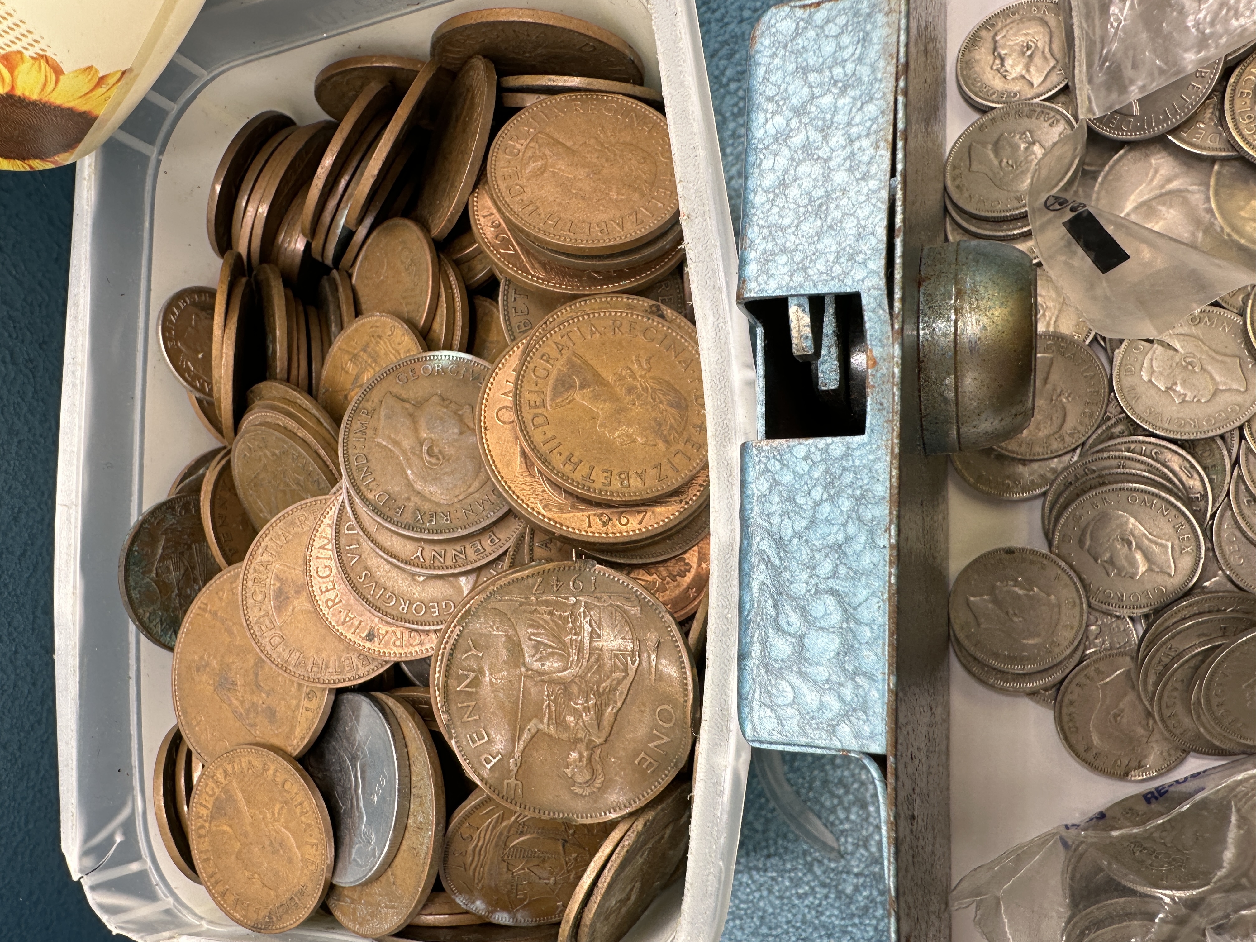 A collection of British pre-decimal coinage and an MMF Industries steel cash box. The assortment includes copper pennies and cupronickel sixpences featuring the profiles of King George VI and Queen Elizabeth II. Visible dates include 1947, 1948, 1950, and 1967, with inscriptions reading ONE PENNY, SIXPENCE, and FID DEF. The cash box is manufactured from steel with a blue hammer-finish and includes a front-mounted lock mechanism. The items are housed in various plastic containers and bags.