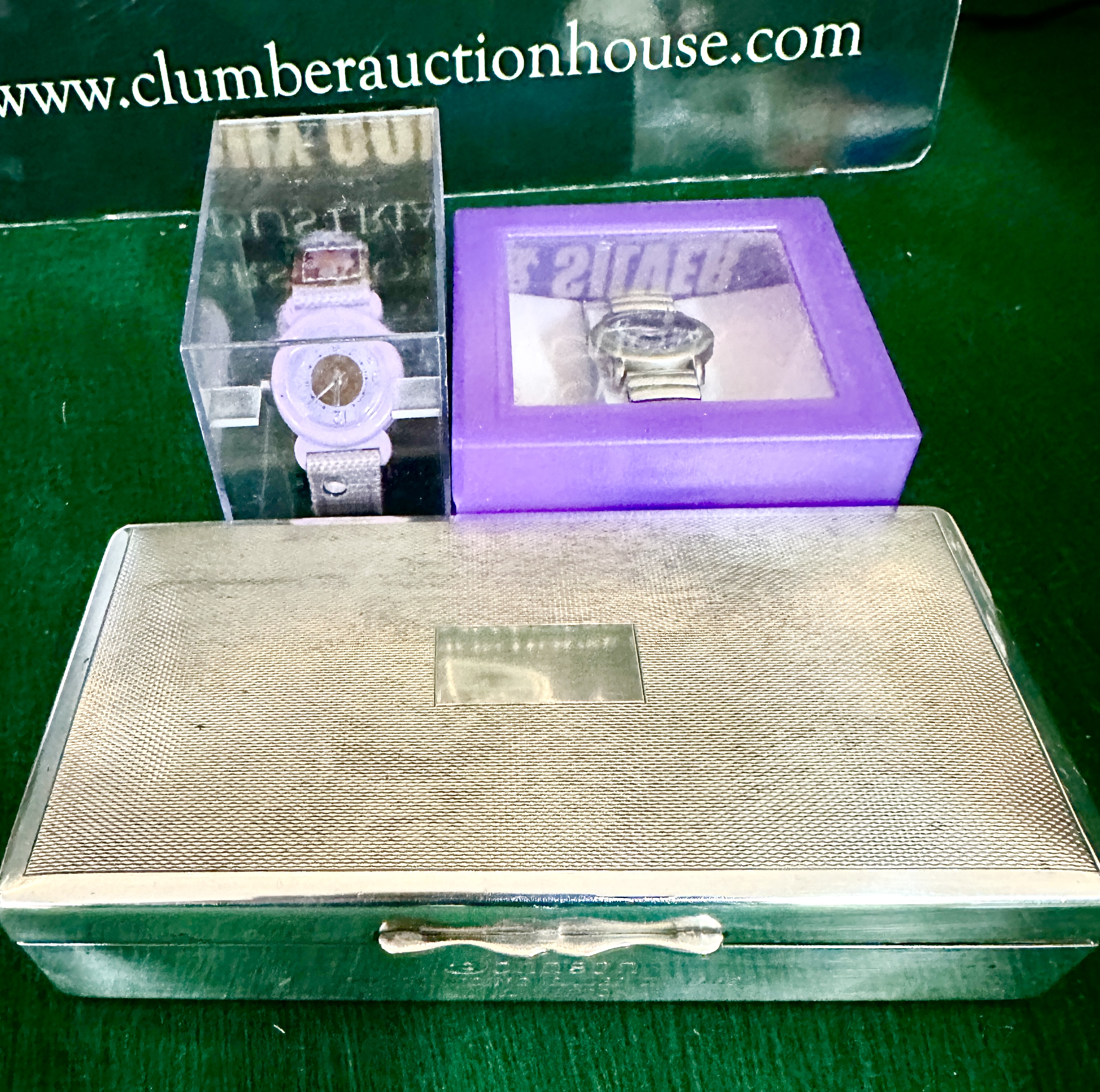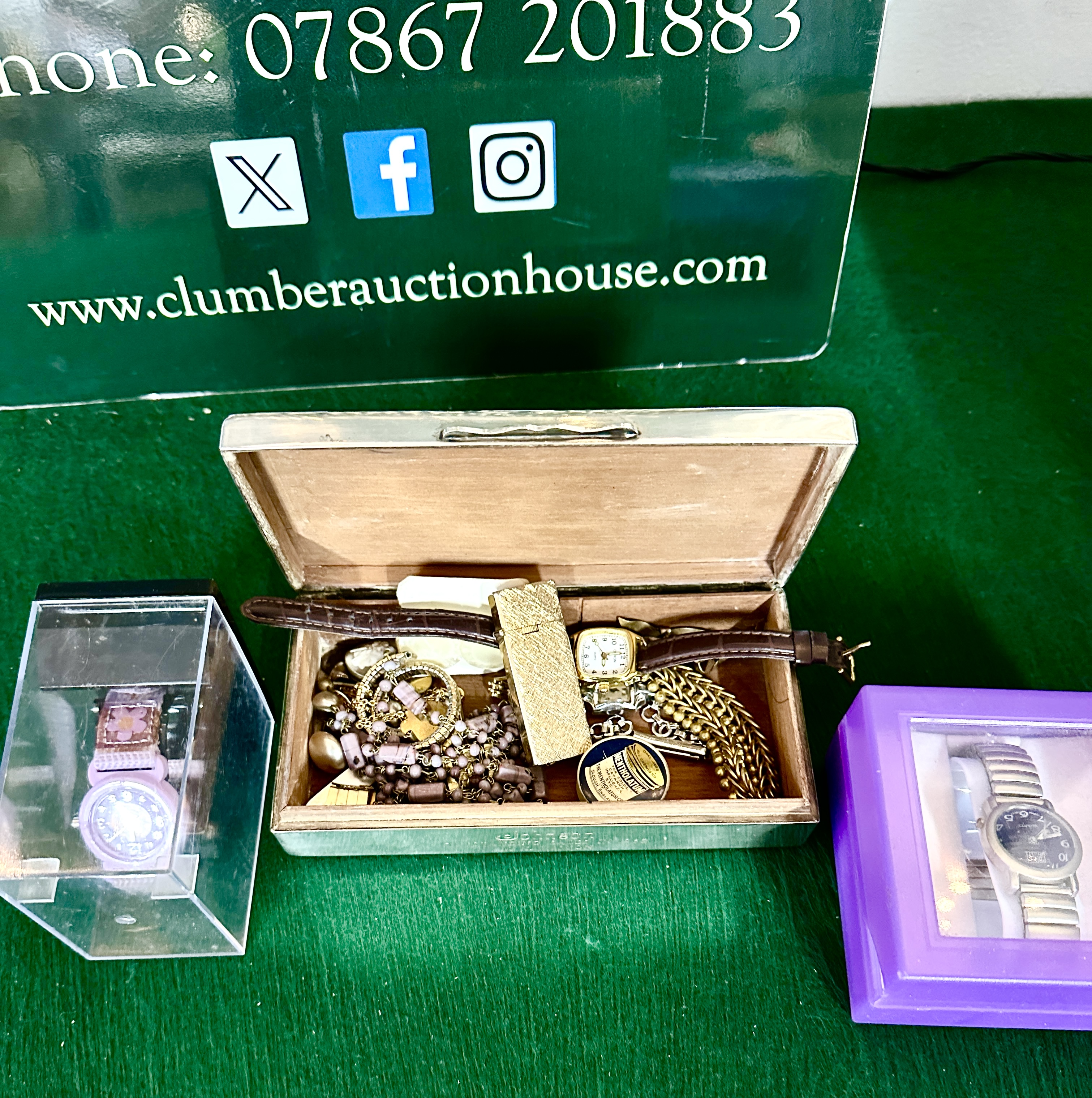 Items are in as found condition. The metal box shows surface scratches and tarnishing consistent with age. The jewellery and watches exhibit various degrees of wear, including scuffing to straps and surface oxidation to metal components. The mechanical functionality of the watches and lighter has not been tested.