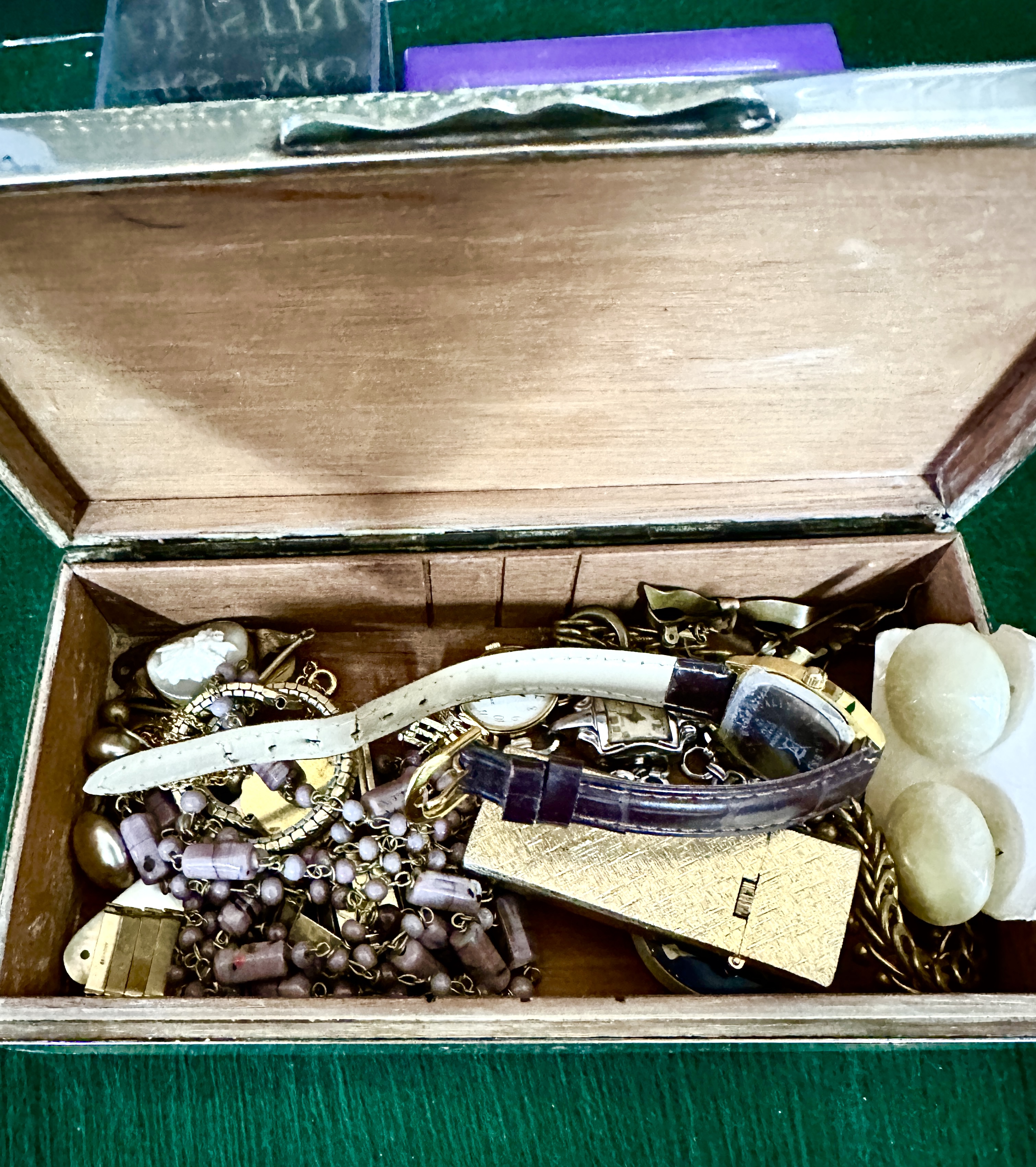 A collection of vintage costume jewellery and personal accessories housed within a rectangular silver-tone metal box. The box features an engine-turned lid with a central unengraved cartouche and a wood-lined interior. The contents include a textured gold-tone pocket lighter, a vintage Mentholatum tin, and an assortment of jewellery including beaded necklaces, gold-tone chains, and a cameo brooch. Also included is a lady’s wristwatch with a brown leather strap, alongside two further wristwatches: one featuring a pink floral-patterned strap in a clear plastic display case and another with a silver-tone metal expansion band in a purple presentation box.
