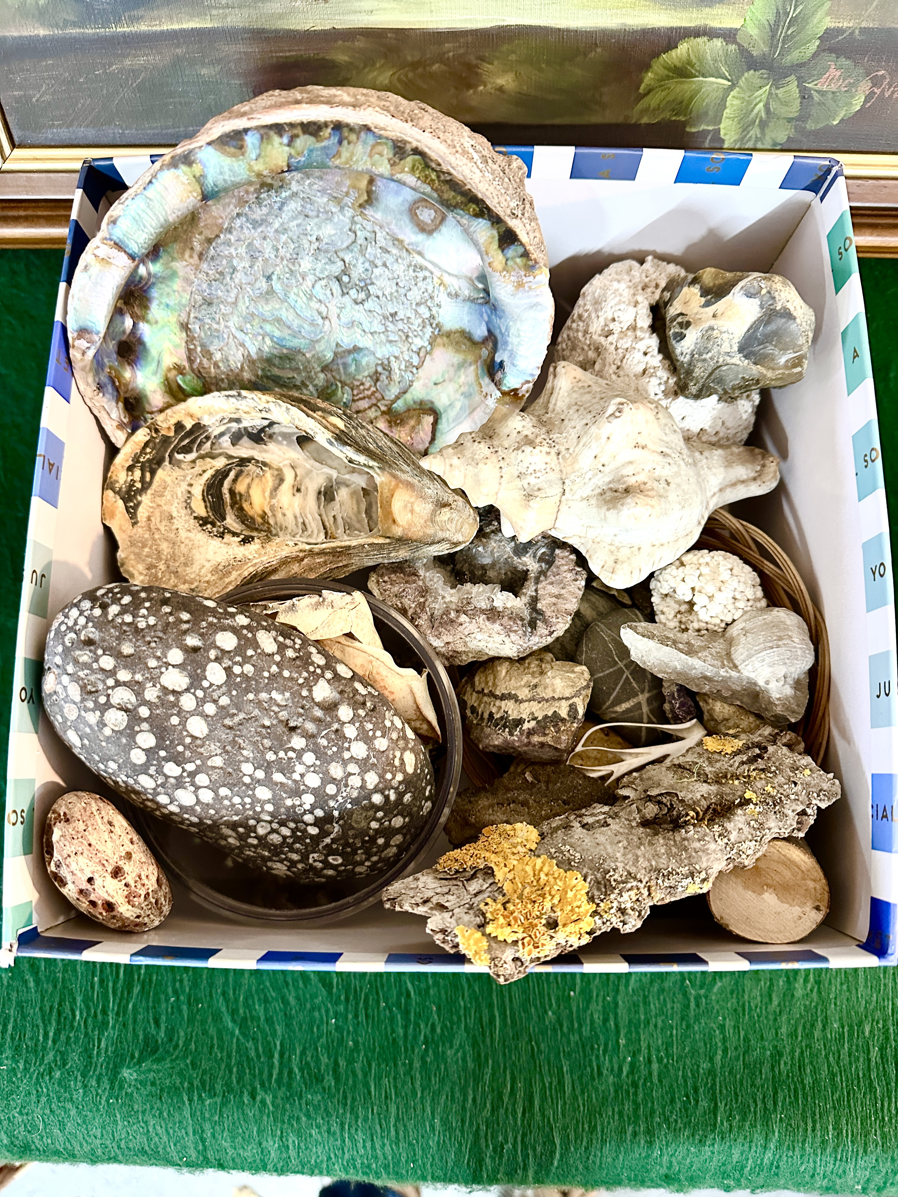 An assortment of natural history specimens and organic objects. The collection includes a large abalone shell with an iridescent nacreous interior, a weathered oyster shell, and a variety of mineral specimens including a geode fragment with internal crystalline structures, a large dark stone with white orbicular spotting, and several coral pieces. The lot also contains botanical elements such as a section of tree bark with yellow lichen and a small circular wood segment. The items are presented within a blue and white striped paperboard box, the interior rim of which features repeating printed text including the word SOCIAL.