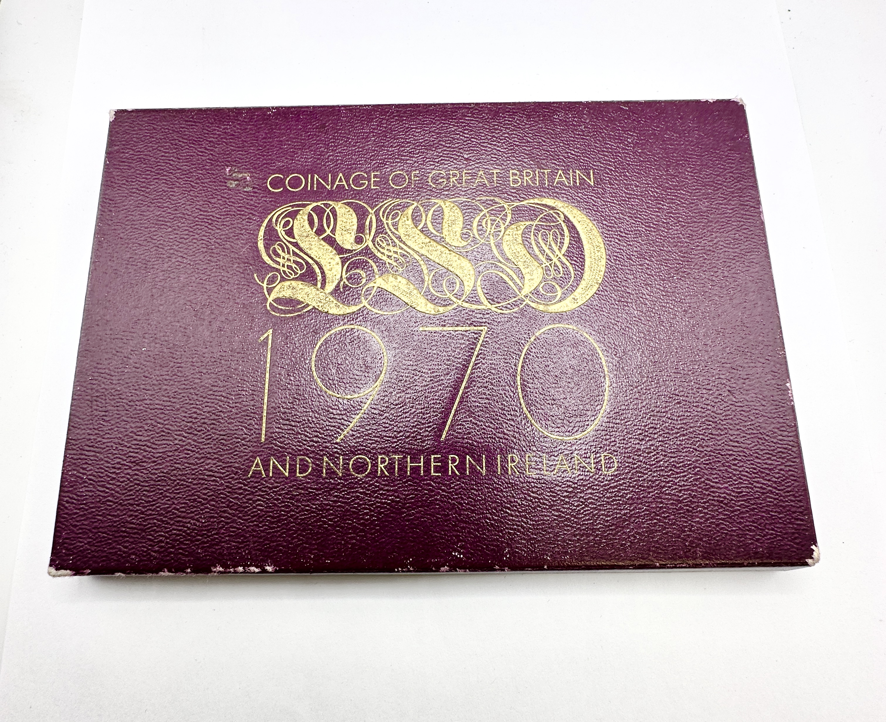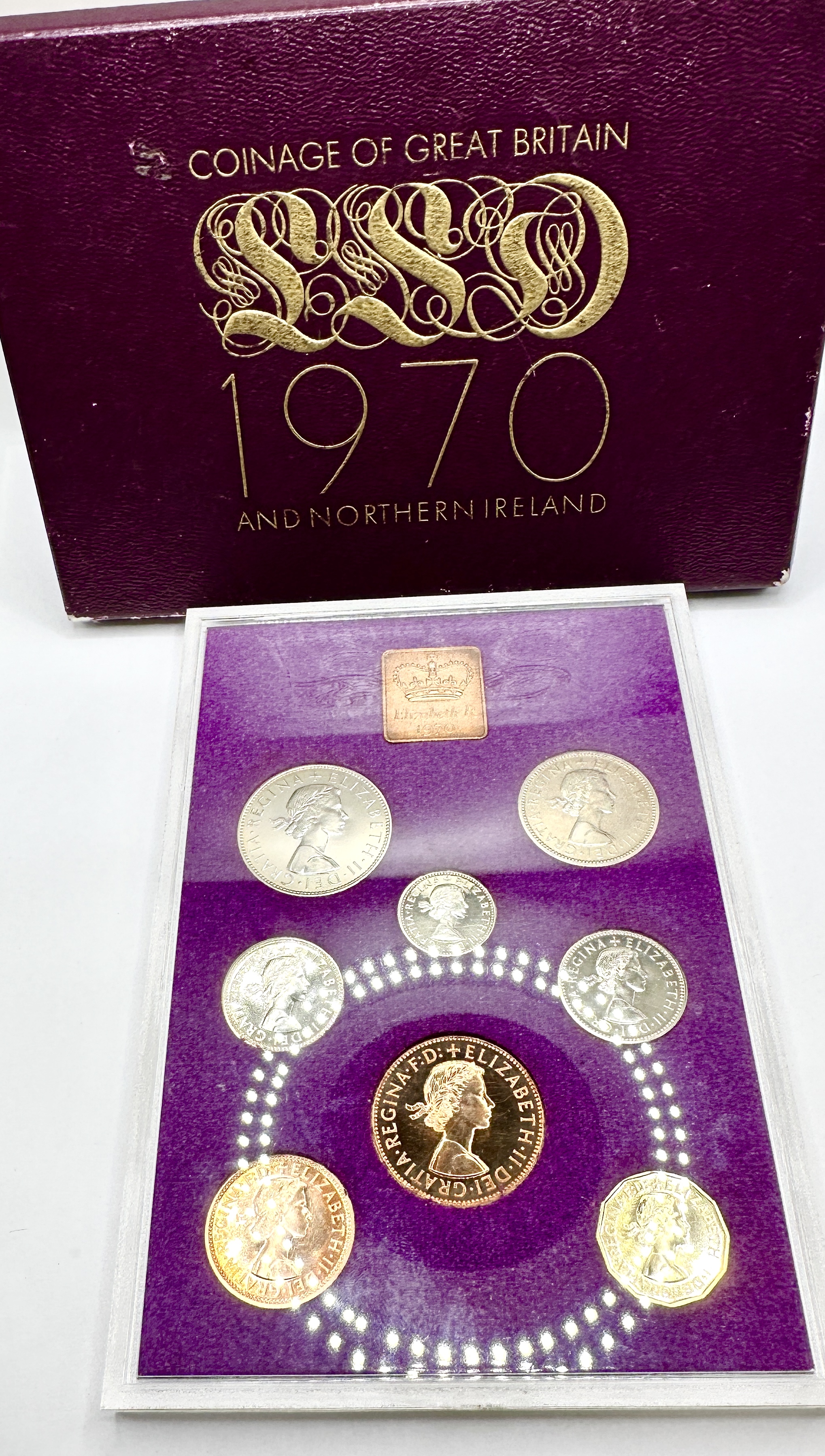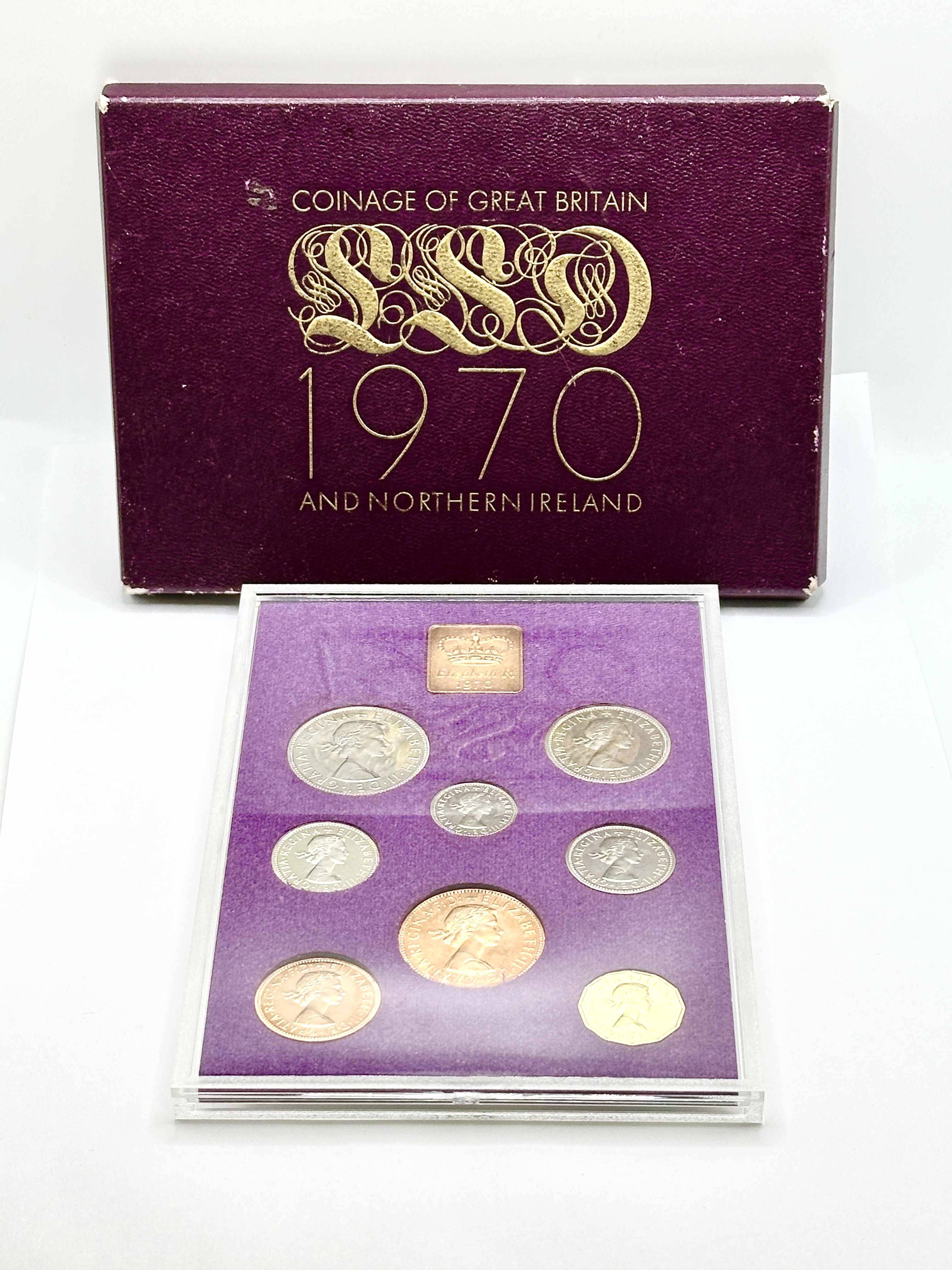A set of pre-decimal proof coins issued by the Royal Mint, titled Coinage of Great Britain and Northern Ireland 1970. This collection represents the final proof set of the pre-decimal era. The set contains various denominations in copper, silver-coloured, and brass-coloured alloys, each featuring the effigy of Queen Elizabeth II. The coins are housed within a clear plastic display case against a purple flocked background, which also incorporates a copper-toned plaque with a crown motif and Elizabeth R 1970 inscription. The set is contained in its original purple textured presentation box with gilt-embossed lettering and decorative flourishes.