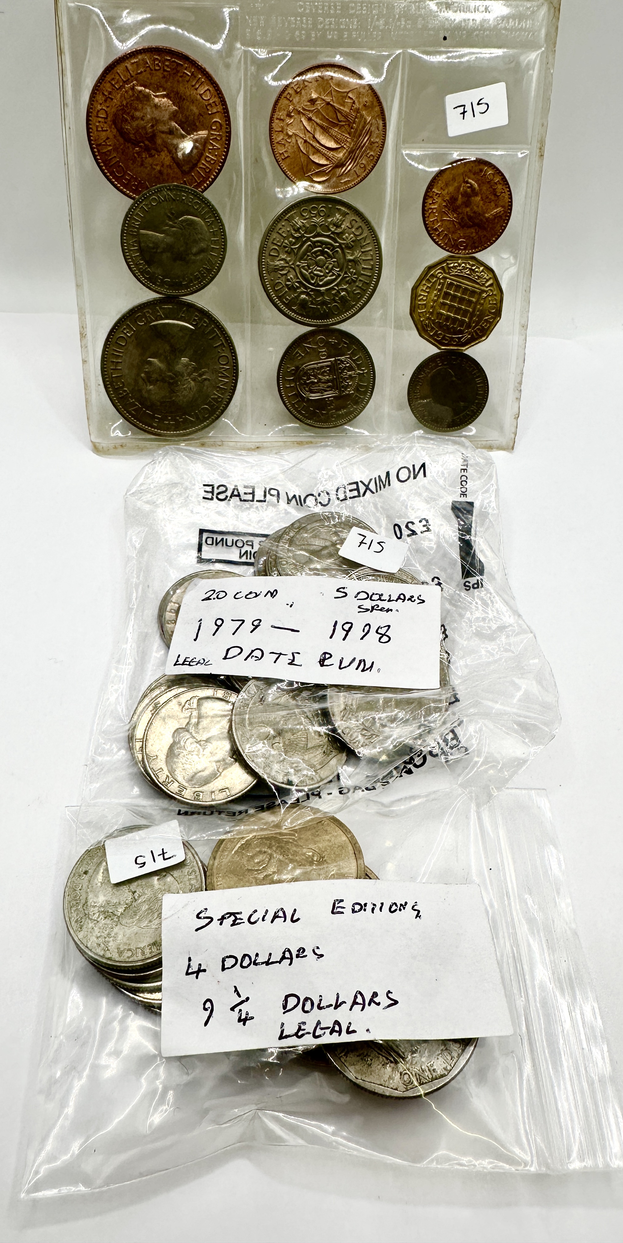 This lot features a 1953 United Kingdom mint set and an assortment of international coins. The 1953 set consists of nine coins, including a half-crown, florin, English shilling, Scottish shilling, sixpence, threepence, penny, halfpenny, and farthing, housed in a clear plastic display sleeve. Also included are two plastic bags containing a collection of loose coins of various denominations and dates. One bag bears handwritten labels stating 20 COIN 5 DOLLARS and 1979-1998 DATE RUN. The other bag is labelled SPECIAL EDITIONS and 9 1/4 DOLLARS LEGAL. The coins are struck in various base metal alloys and exhibit a range of silver and copper tones. Lot number 715 stickers are present on the packaging of each component.