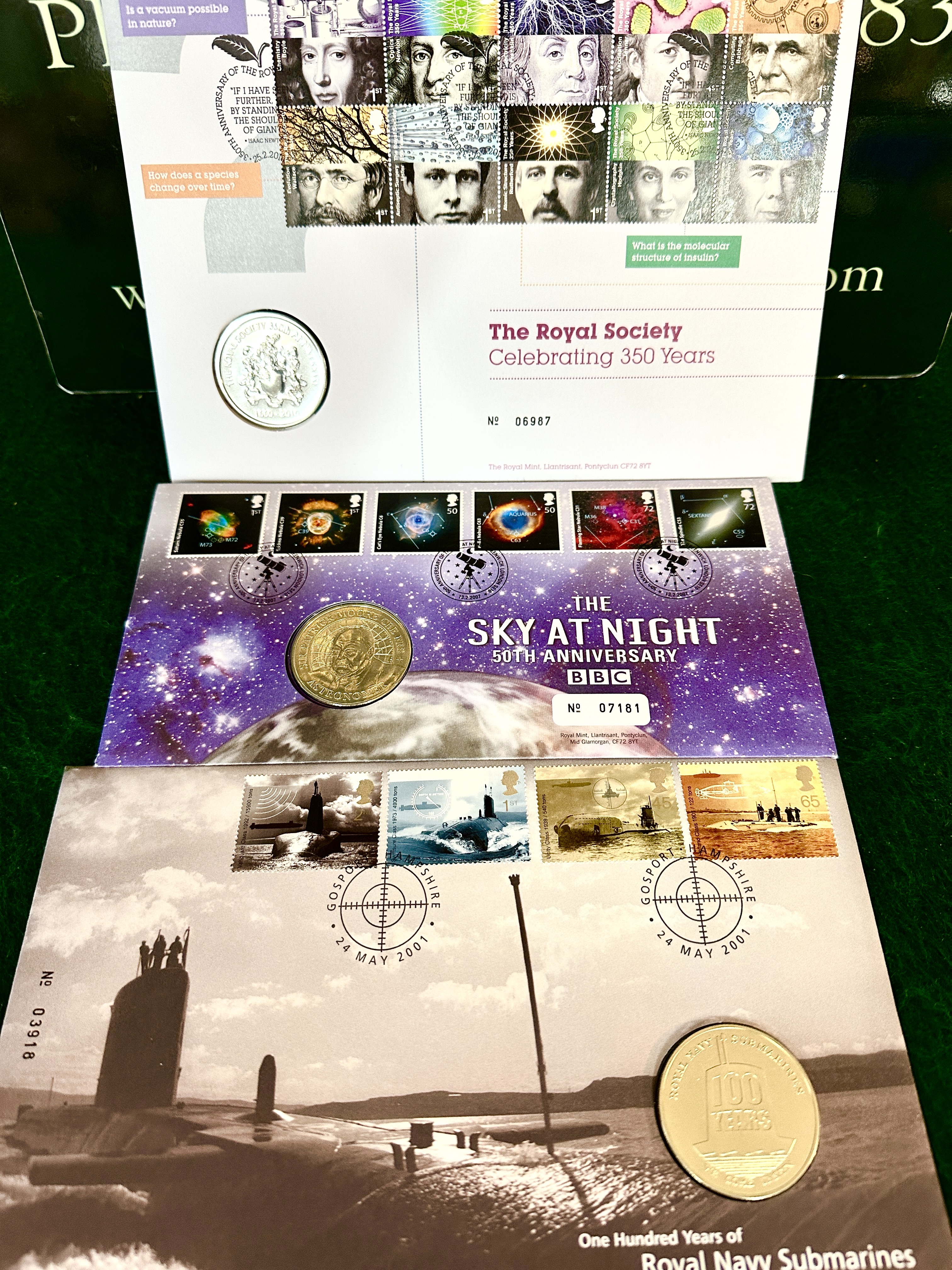 This collection of Philatelic Numismatic Covers consists of three commemorative sets issued by the Royal Mail and the Royal Mint. The first cover, titled The Royal Society Celebrating 350 Years, features a block of ten stamps depicting notable scientists and an inset silver-coloured commemorative coin, numbered 06987. The second cover, BBC The Sky at Night 50th Anniversary, includes celestial-themed stamps with Jodrell Bank postmarks and an inset gold-coloured medal depicting Sir Patrick Moore, numbered 07181. The third cover, One Hundred Years of Royal Navy Submarines, features four submarine-themed stamps postmarked at Gosport on 24 May 2001, with an inset gold-coloured commemorative medal, numbered 03918. Each item is presented in its original illustrated envelope with printed serial numbers and technical specifications.