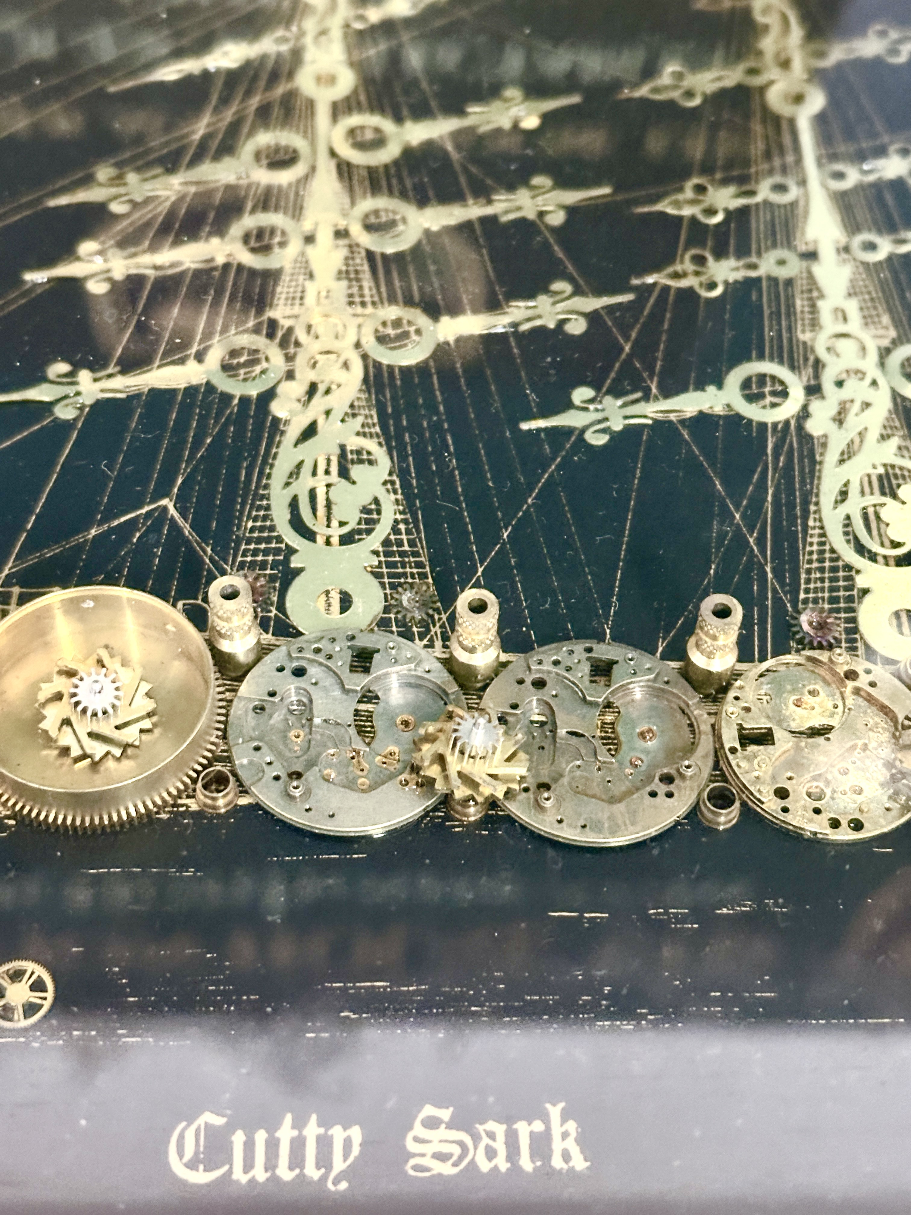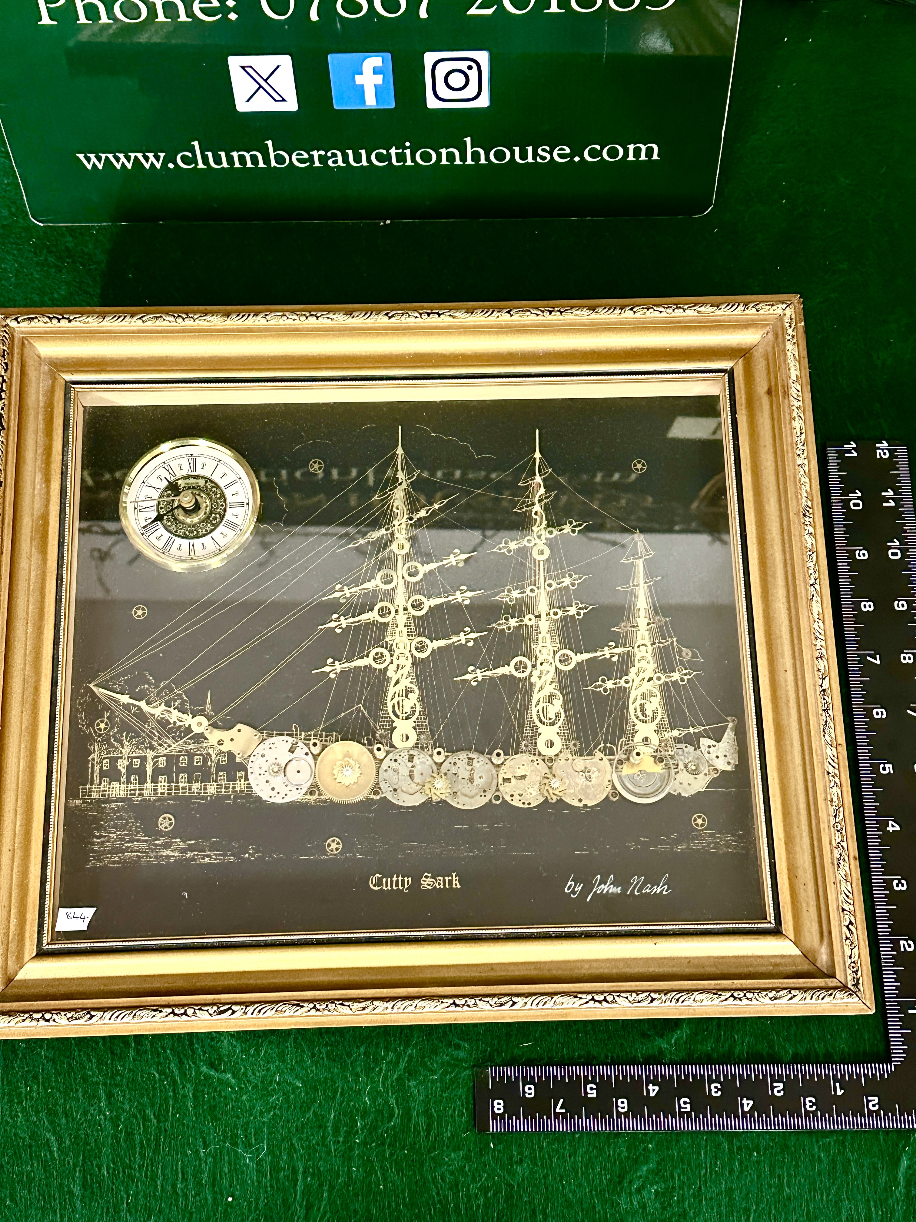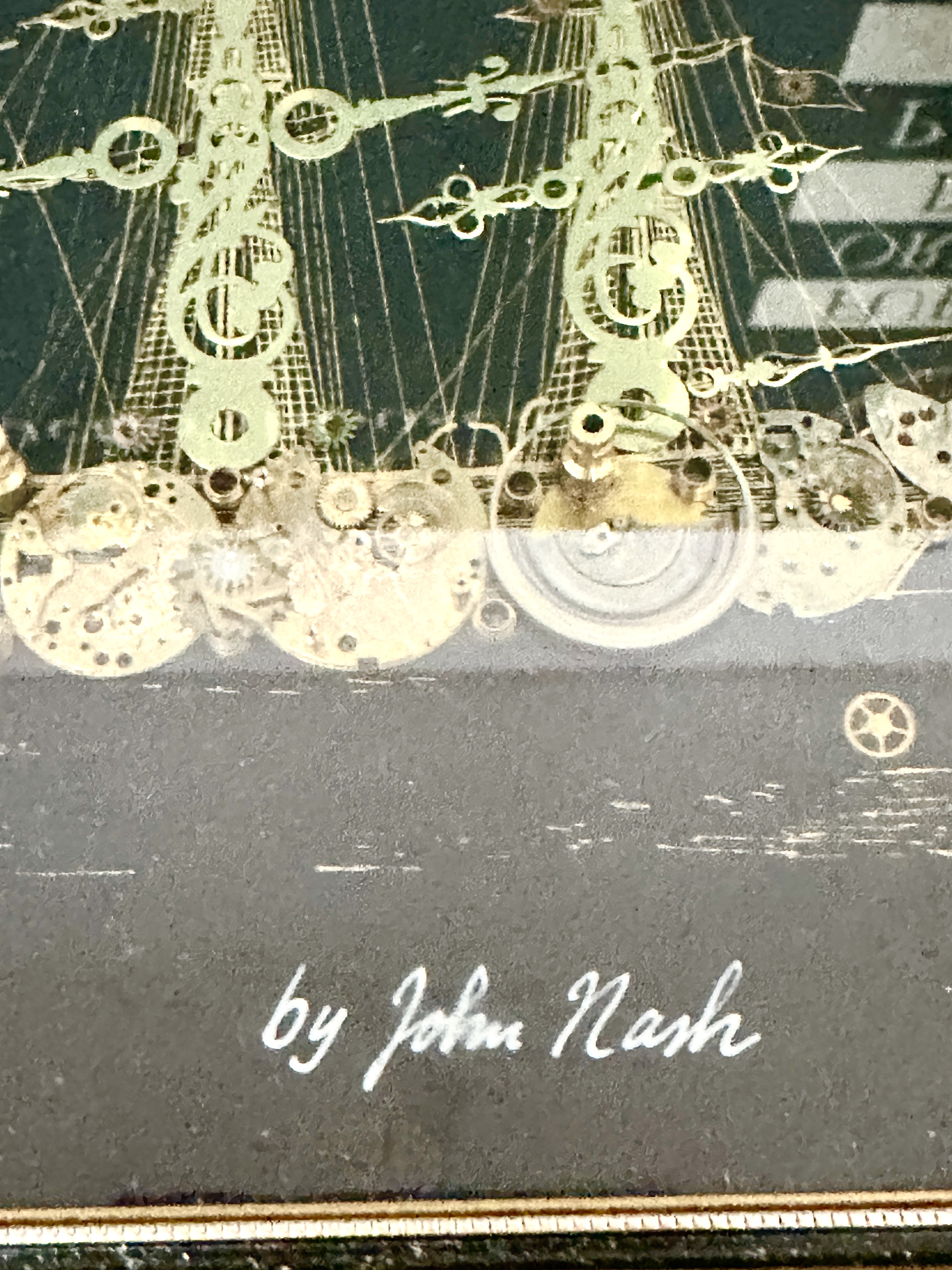 A framed mixed media artwork by John Nash titled Cutty Sark. The composition depicts the clipper ship constructed from various vintage watch and clock components, including brass gears, movement plates, and clock hands, set against a dark background. The piece features an inset circular clock in the upper left corner with a white dial, Roman numerals, and Mercedes branding, marked Made in Germany. The work is signed by John Nash in white cursive script and titled Cutty Sark in Gothic-style lettering. It is housed in an ornate gilt-finished decorative frame under glass.