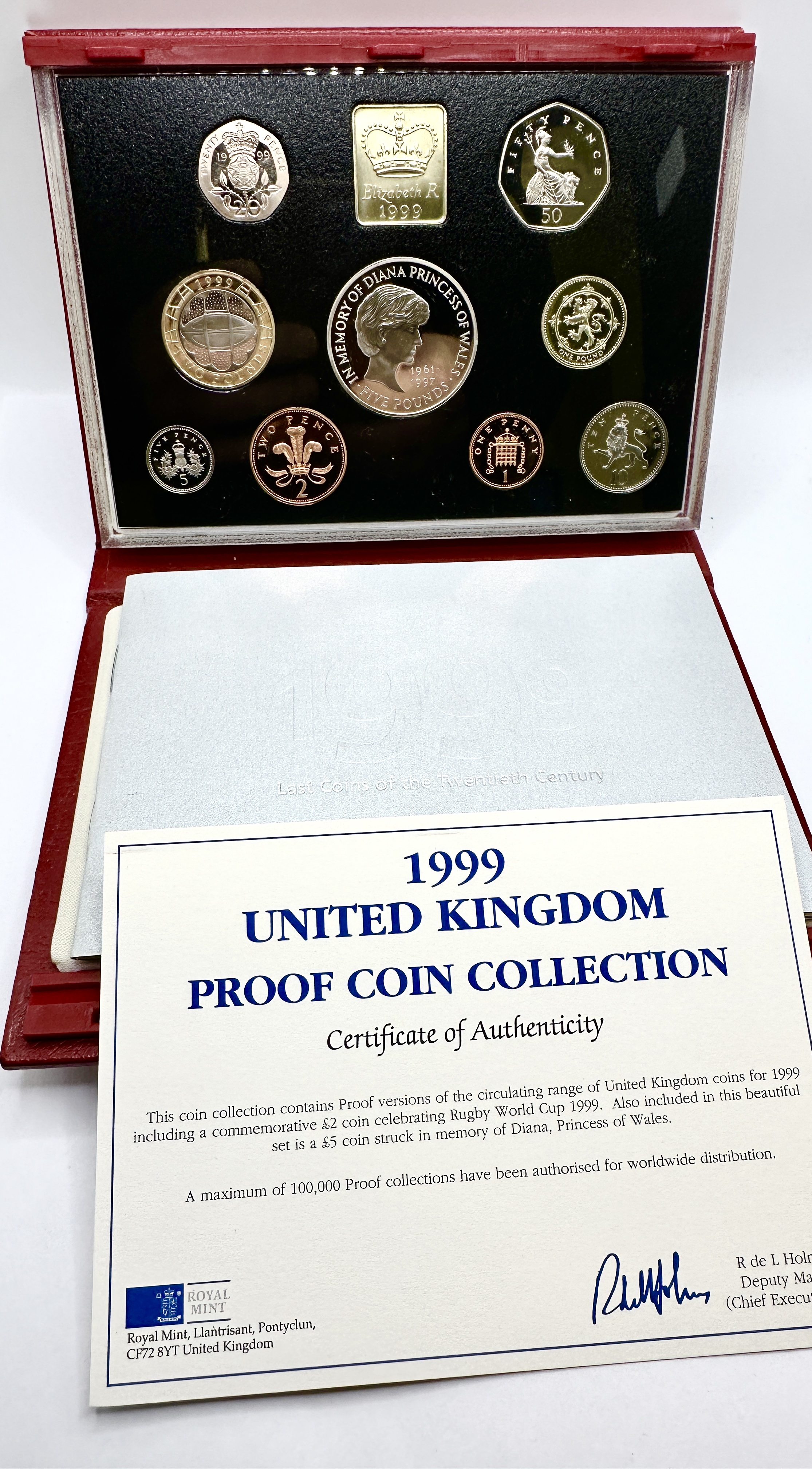 A collection of proof-finish coins issued by the Royal Mint, presented in the original red faux-leather folding case. The set contains the circulating denominations for the year 1999 along with two commemorative pieces: a five pound coin struck in memory of Diana, Princess of Wales, and a two pound coin issued for the 1999 Rugby World Cup. The coins are displayed within a black panel protected by a clear cover. Included with the lot is the official Royal Mint Certificate of Authenticity and a silver-toned informational pamphlet titled Last Coins of the Twentieth Century. The documentation indicates a maximum authorised mintage of 100,000 sets for worldwide distribution.