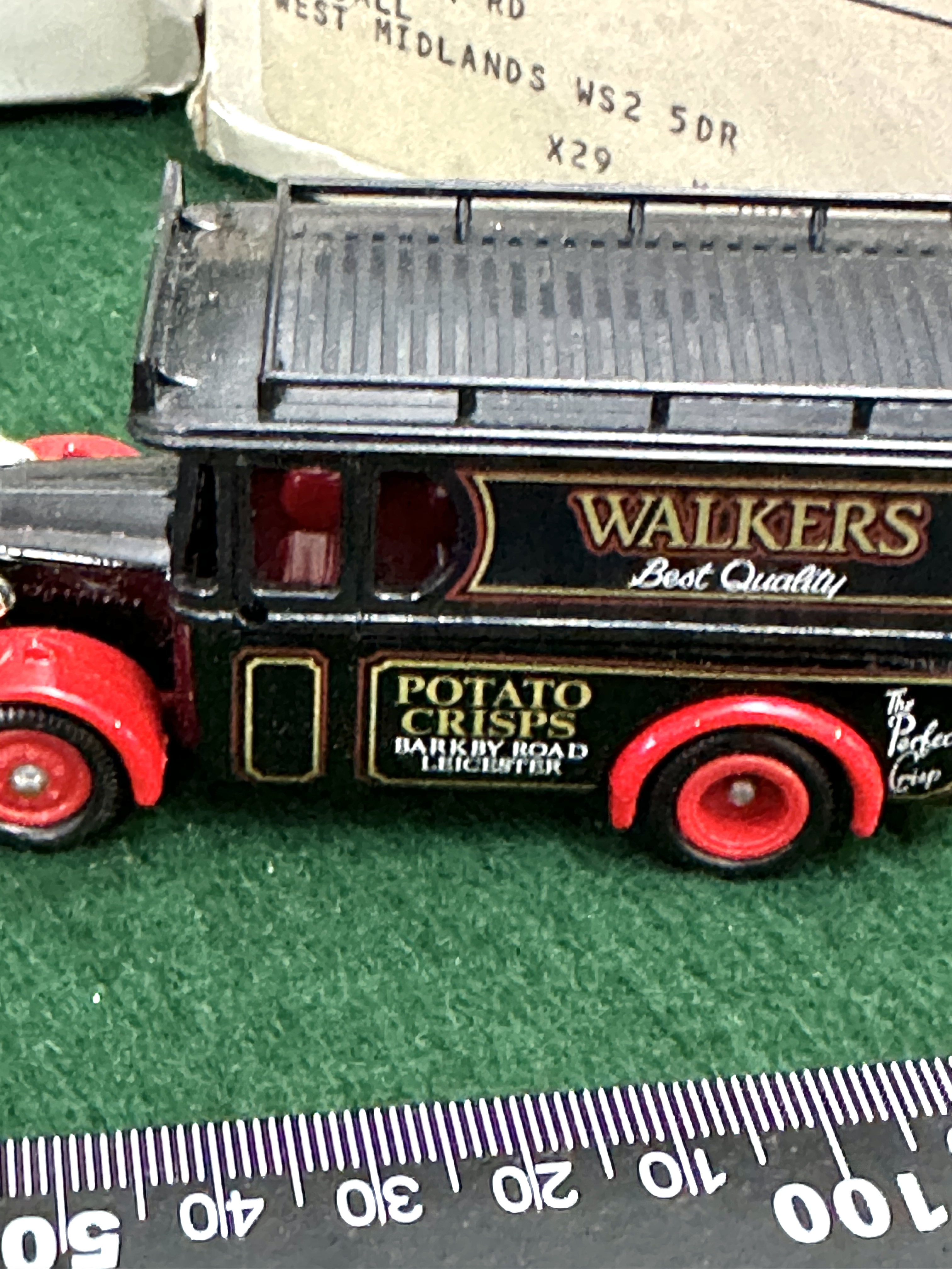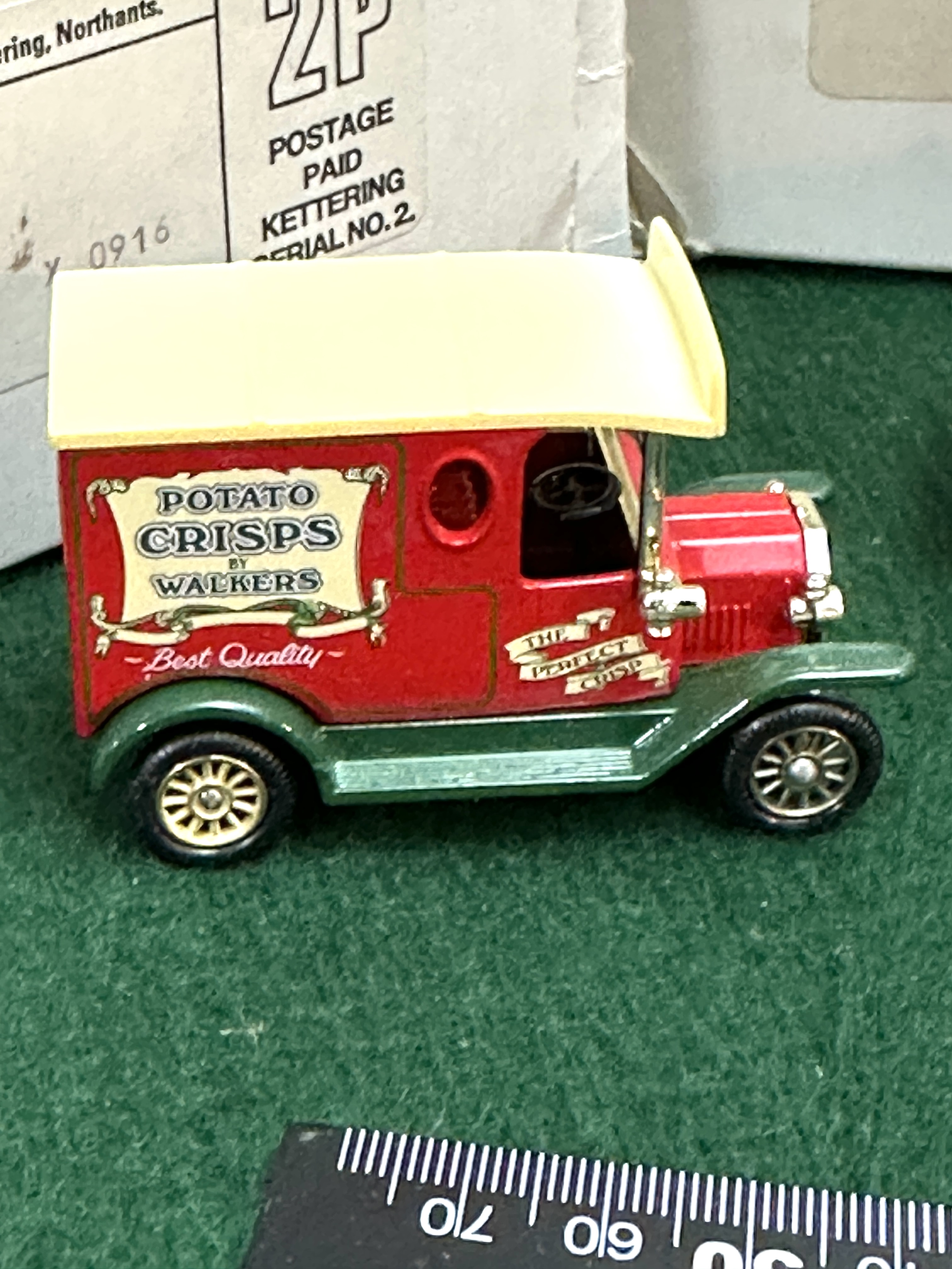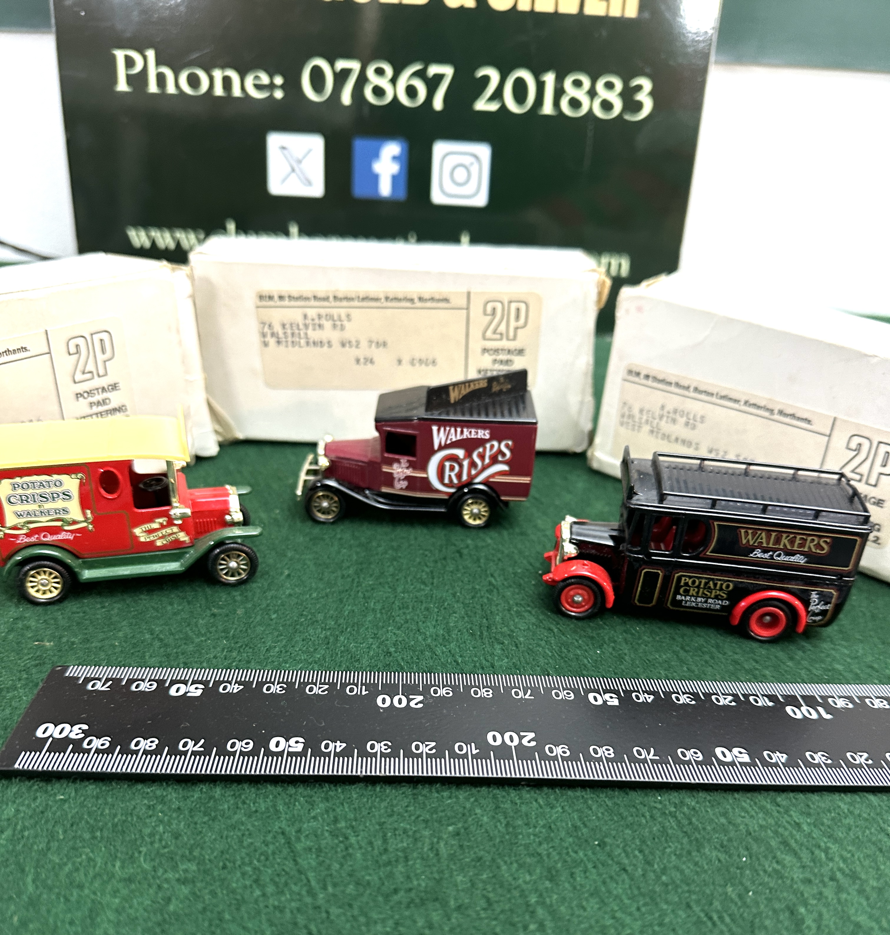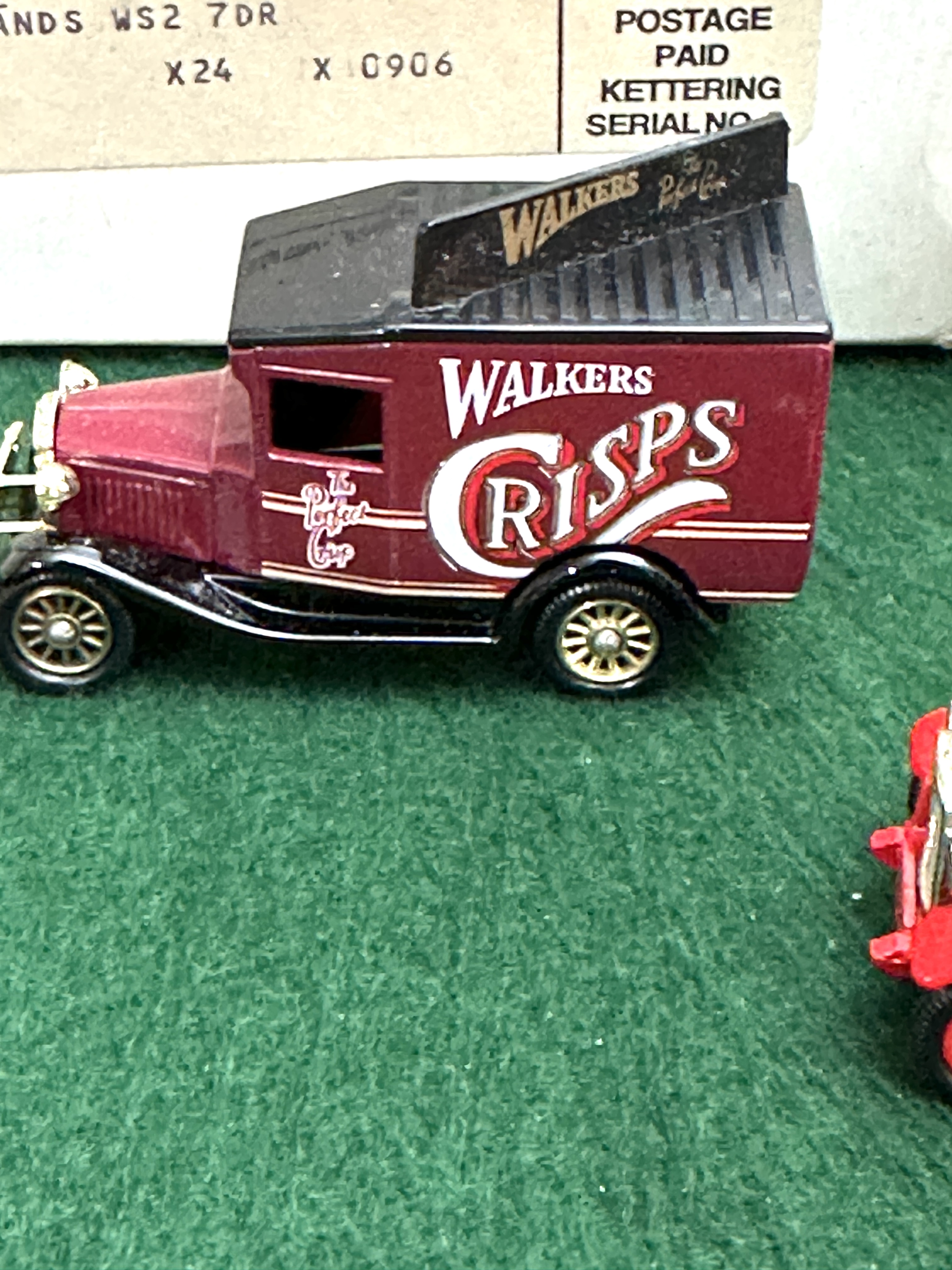 A trio of Lledo Days Gone die-cast promotional delivery vans featuring Walkers Crisps advertising. The group includes three distinct models representing early 20th-century commercial transport. The first is a red and green van with a cream roof inscribed Potato Crisps by Walkers Best Quality. The second is a maroon and black van with Walkers Crisps and The Perfect Crisp branding. The third is a black van with red wheel arches and fenders marked Walkers Best Quality and Potato Crisps Barkby Road Leicester. The items are accompanied by their original white cardboard mailing boxes, which feature labels addressed to an individual in Walsall, West Midlands, with 2P Postage Paid Kettering markings.