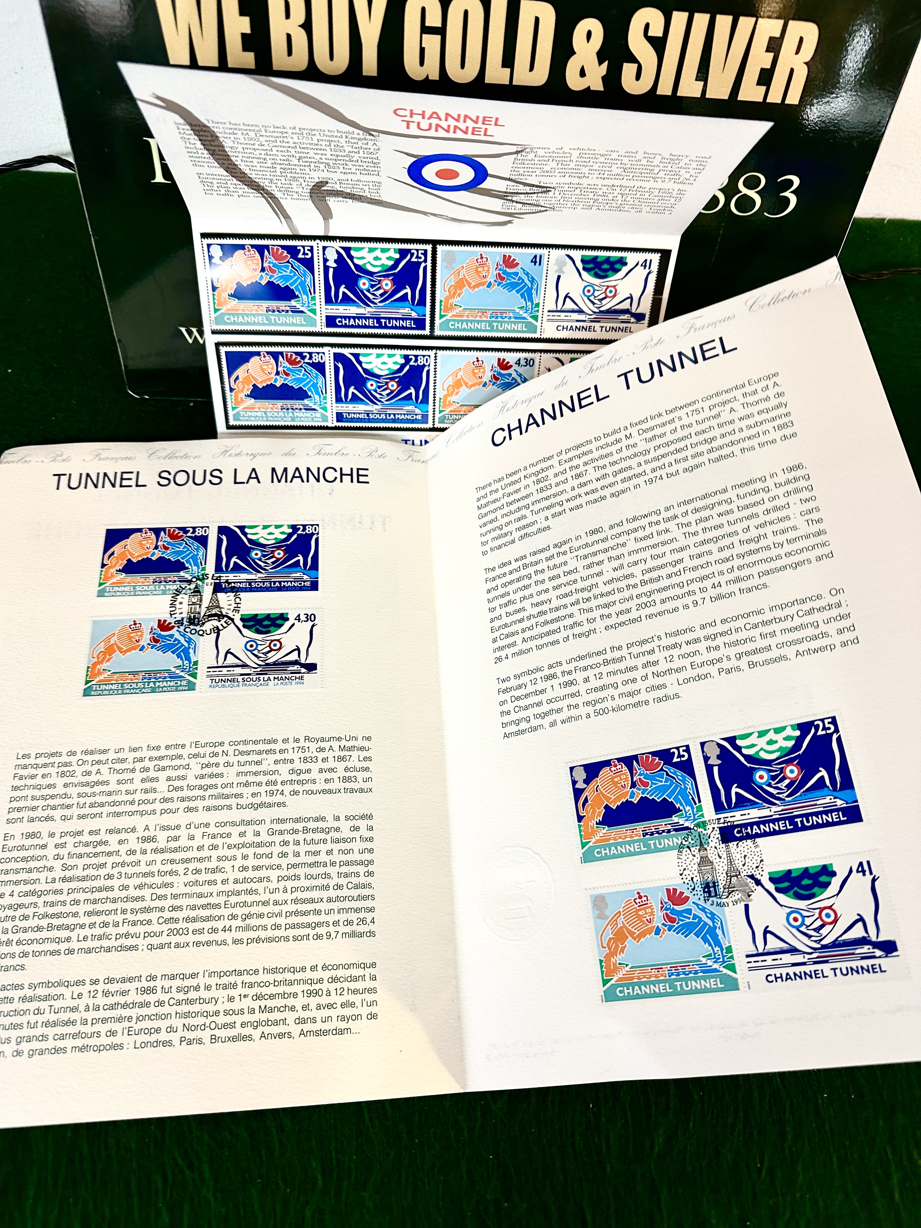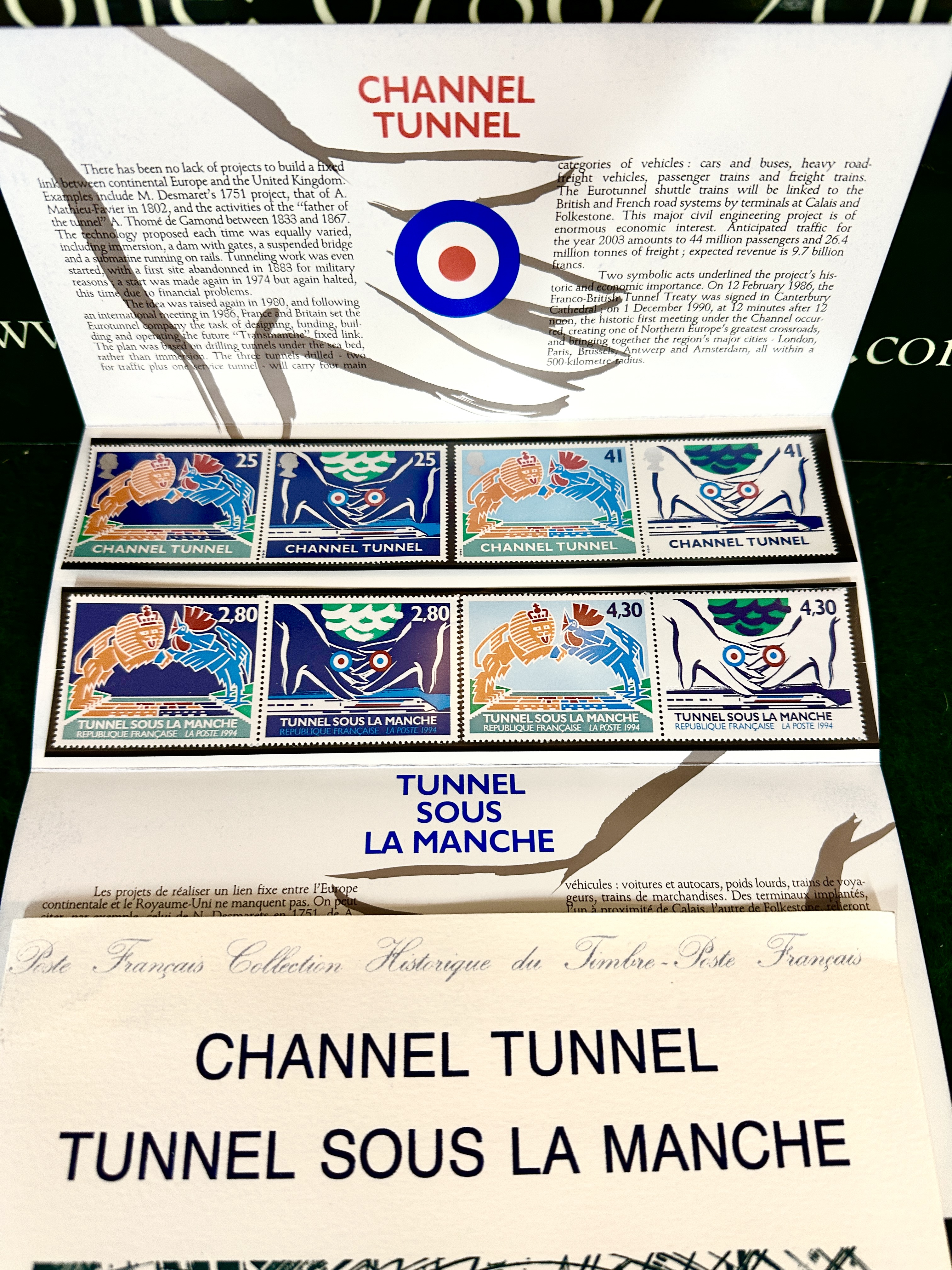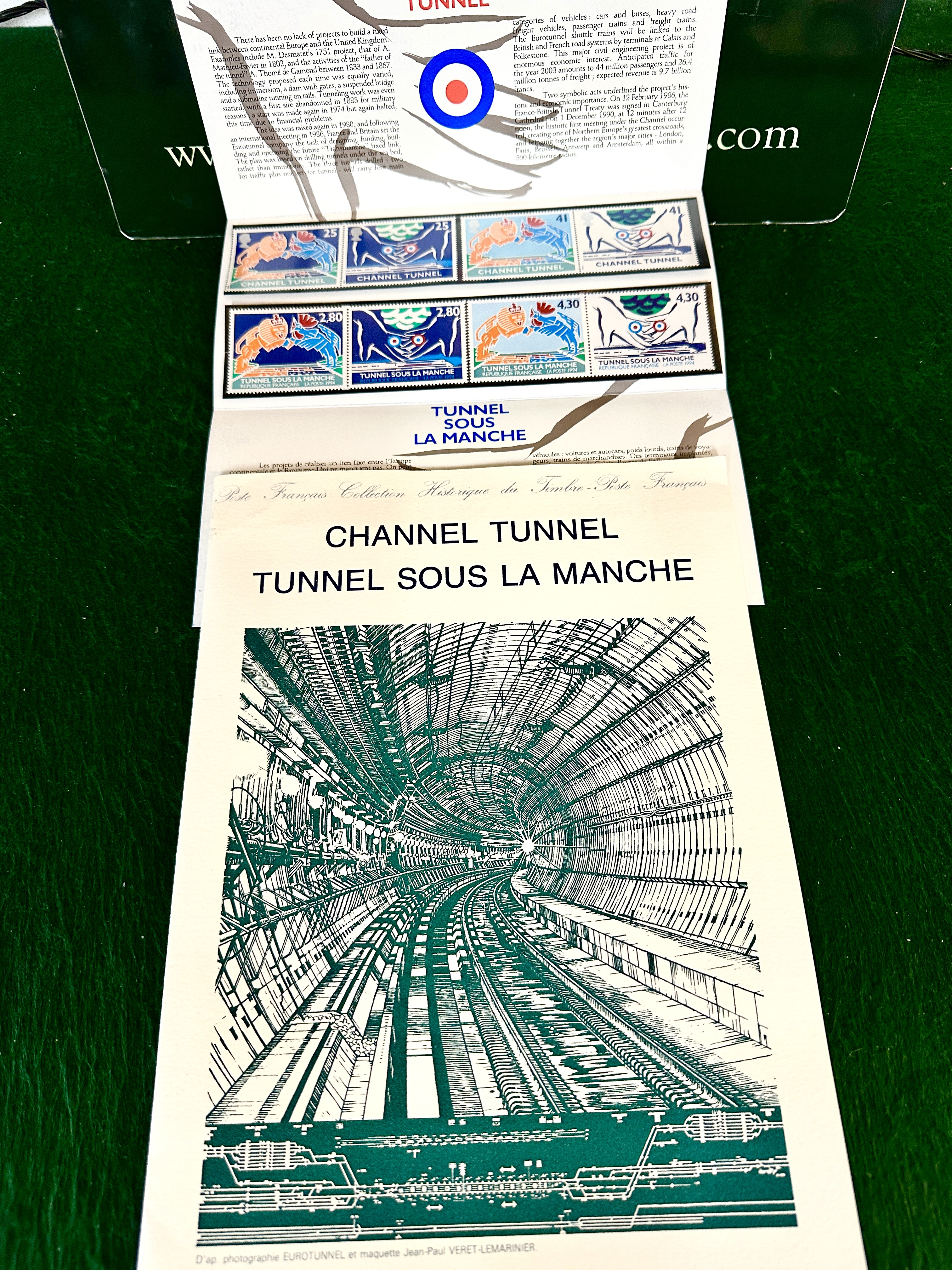A philatelic presentation set produced in 1994 to commemorate the opening of the Channel Tunnel (Tunnel Sous La Manche). The collection comprises a joint issue of postage stamps from the British Royal Mail and the French La Poste. The stamps are presented in a tri-fold cardstock folder and feature stylized designs incorporating the British lion and the French rooster, as well as symbolic imagery of the tunnel construction. British denominations include 25p and 41p, while French denominations are 2,80 and 4,30 francs. The folder contains descriptive text regarding the history and engineering of the project in both English and French. Also included is a separate illustrated pamphlet from the Collection Historique du Timbre-Poste Français, which displays a large-scale black-and-white perspective drawing of the tunnel interior.