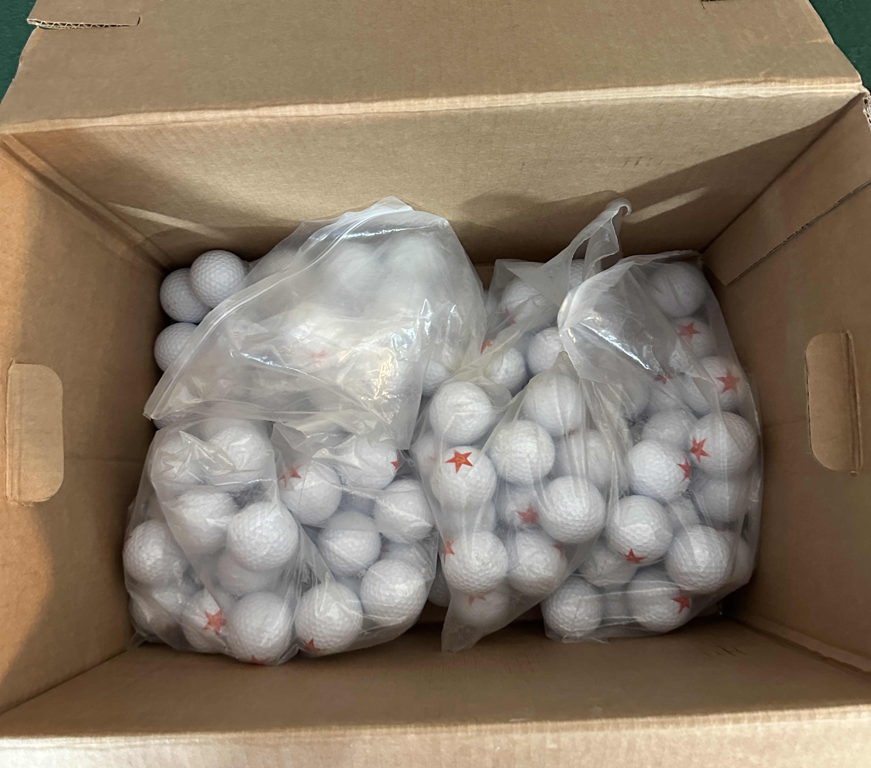 A collection of white dimpled golf balls identified by web consensus as Kirkland Signature. Each ball features a printed red five-pointed star containing a yellow hammer and sickle, a motif associated with the former Soviet Union. The items are of standard spherical construction with a dimpled exterior surface. The collection is presented in multiple clear plastic bags within a cardboard container.