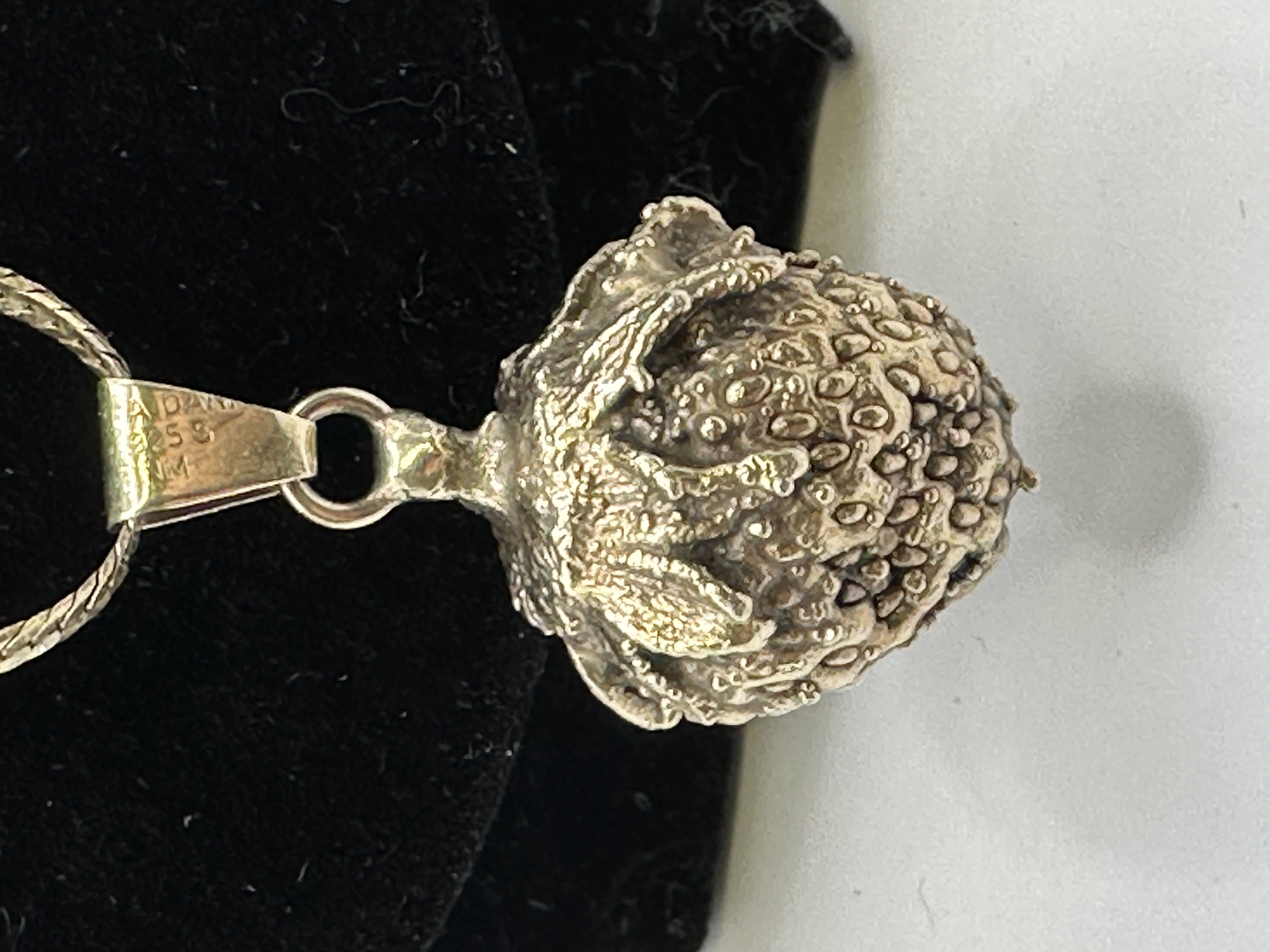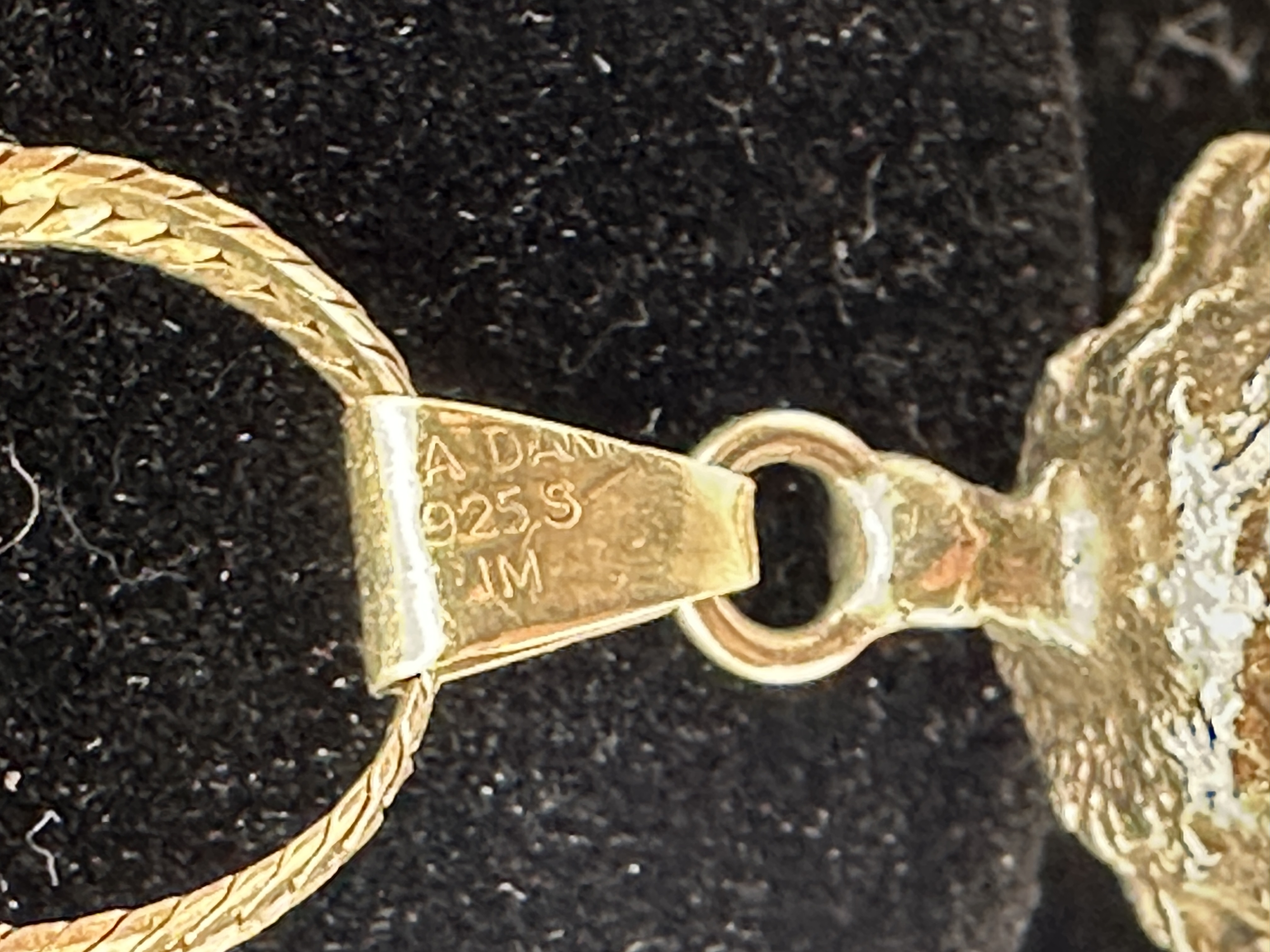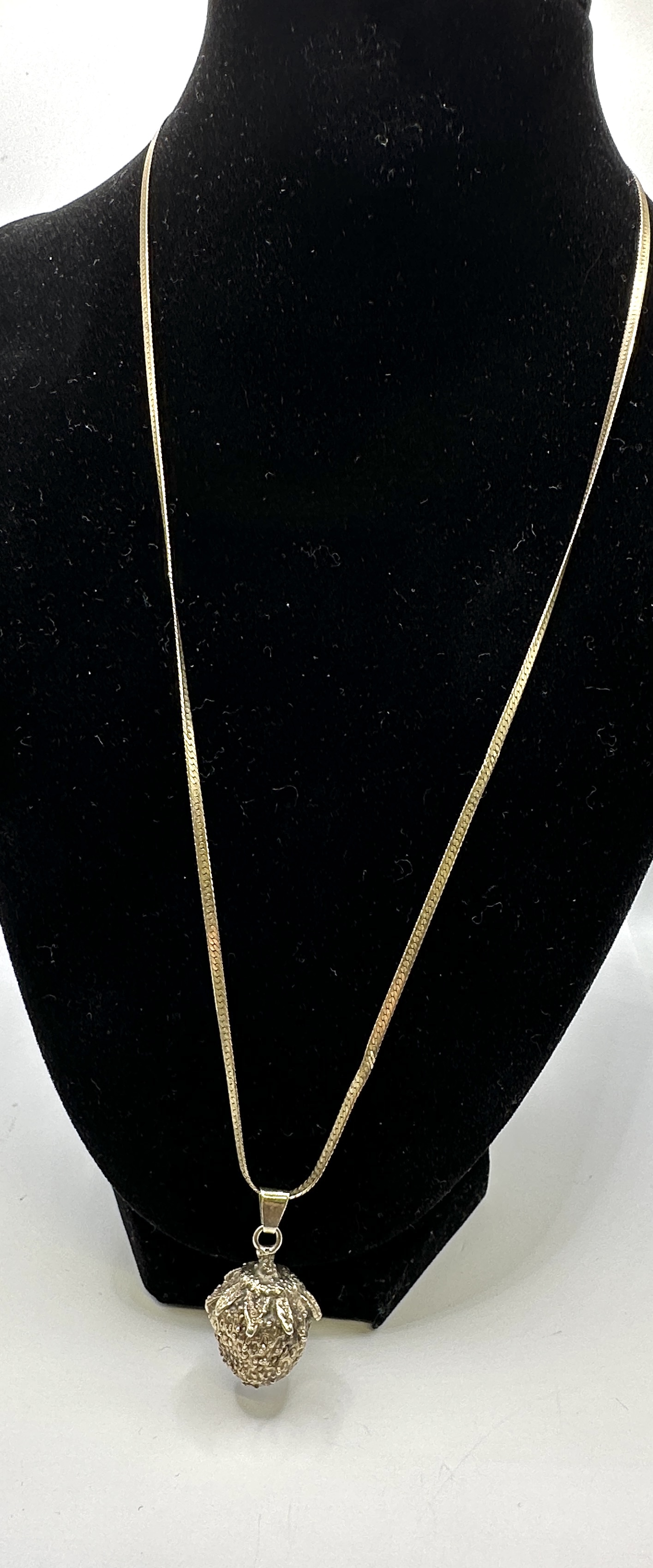 A vintage necklace featuring a three-dimensional strawberry-form pendant suspended from a fine gold-toned flat-link chain. The pendant is realistically rendered with a textured surface and a detailed leafy hull. The piece is constructed from 925 silver with a gold-plated finish. The bail is stamped with the hallmarks A. DAN, 925 S, and the maker’s mark JM.