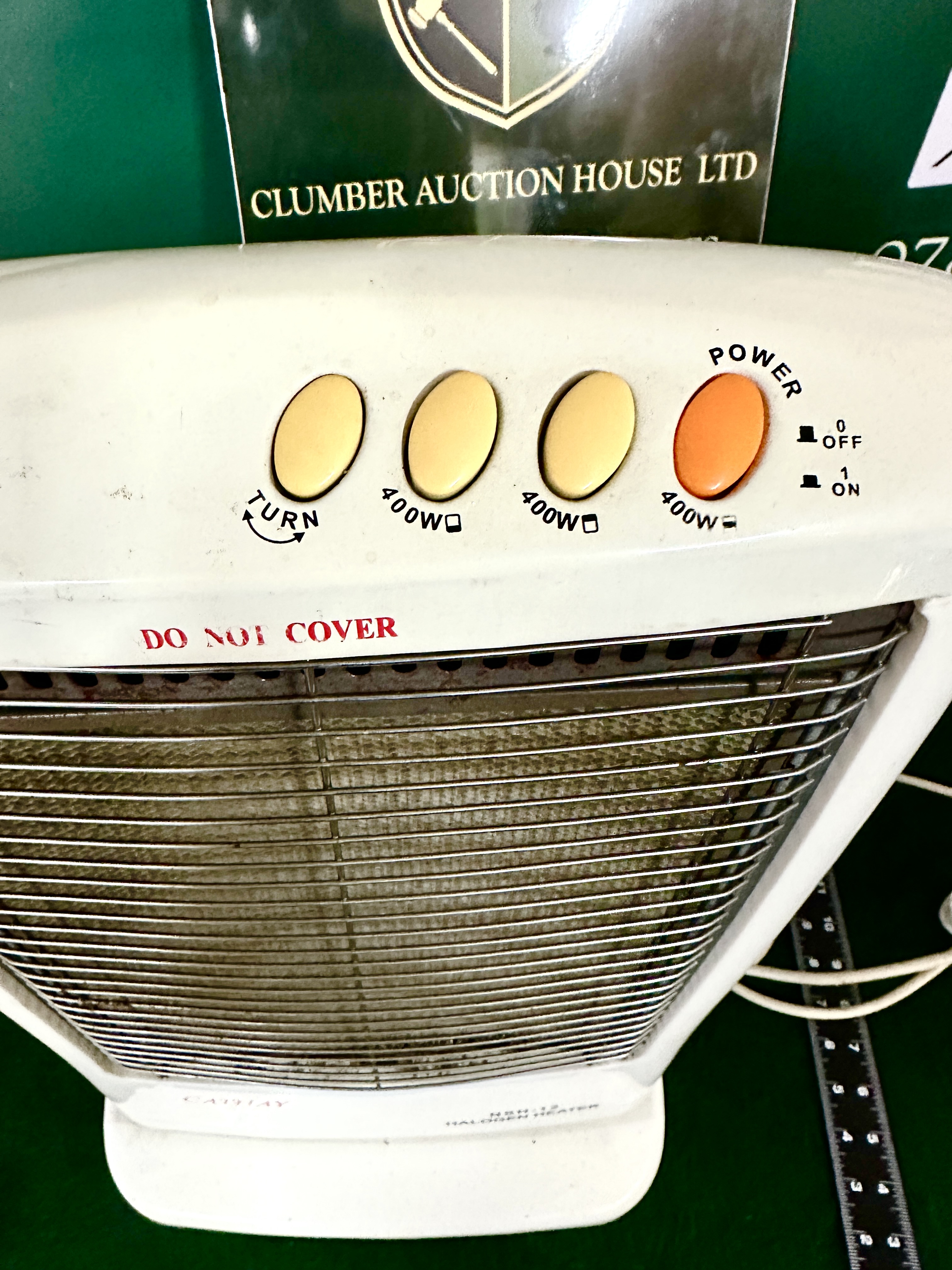 A Cathay model NSH-12 electric halogen heater featuring a white plastic upright housing with an integrated carrying handle. The unit is fitted with a front-facing metal safety grille over a secondary mesh screen. The top control panel comprises four push-buttons for an oscillating function marked TURN and three variable heat settings, each marked 400W, with the final button functioning as the primary power switch. The housing is marked with the brand name CATHAY and includes a red DO NOT COVER warning. An attached white power cord is included.