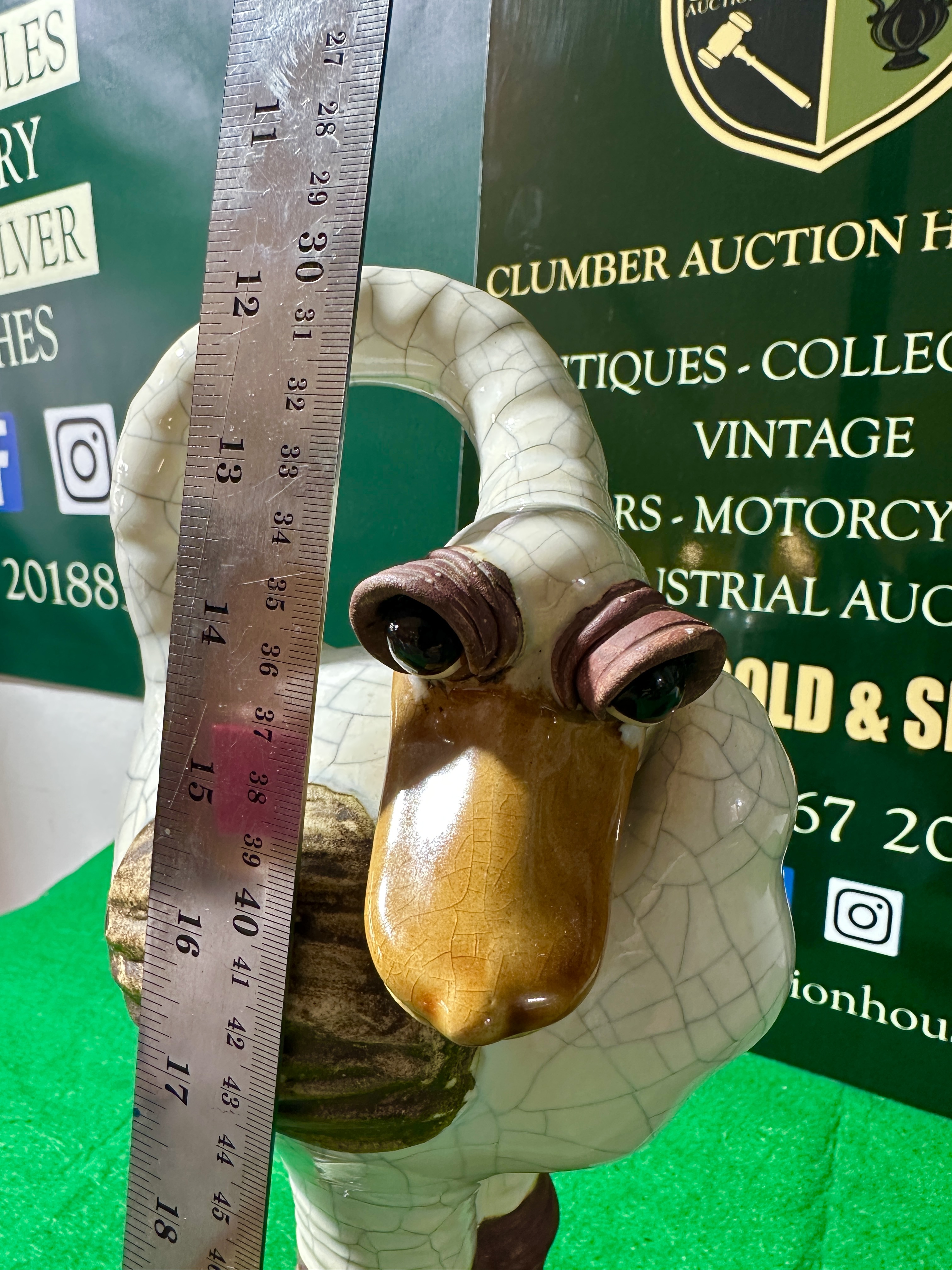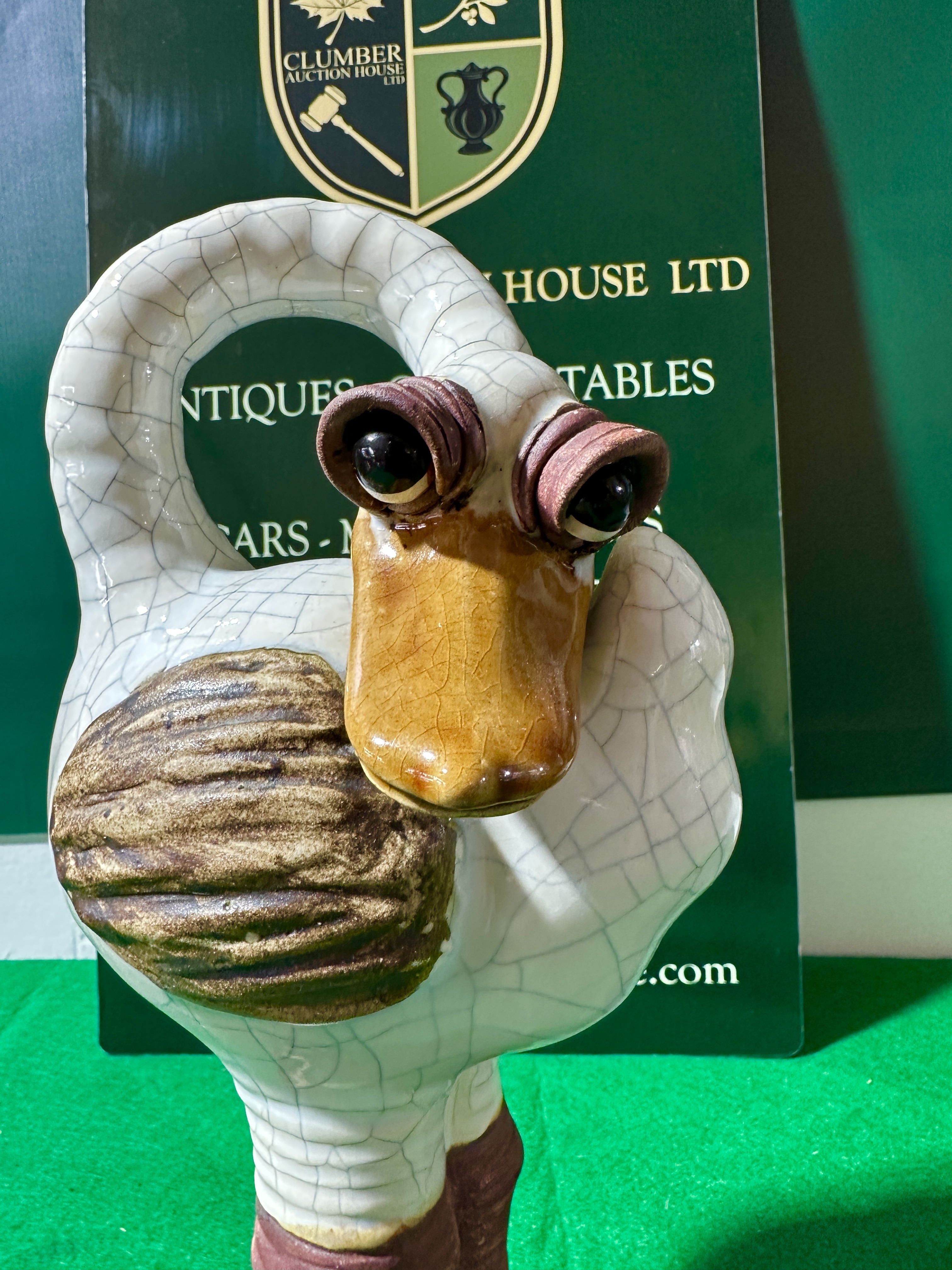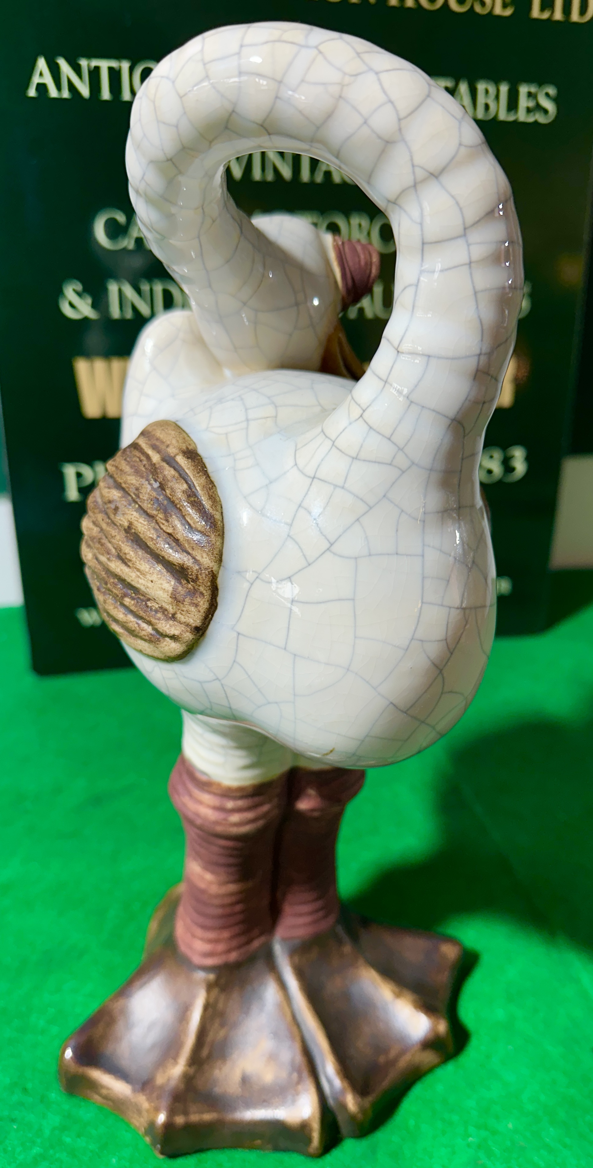 A contemporary stylised bird sculpture, modelled as an anthropomorphic duck or goose, The figure is characterised by a long, curved neck and a head featuring prominent eyes with heavy lids and a glossy ochre-coloured beak. The body is finished with a white crackle-effect glaze and decorated with textured brown wing accents. The sculpture is supported by thick, ringed legs terminating in large, dark-toned webbed feet. No maker’s marks are visible on the piece.