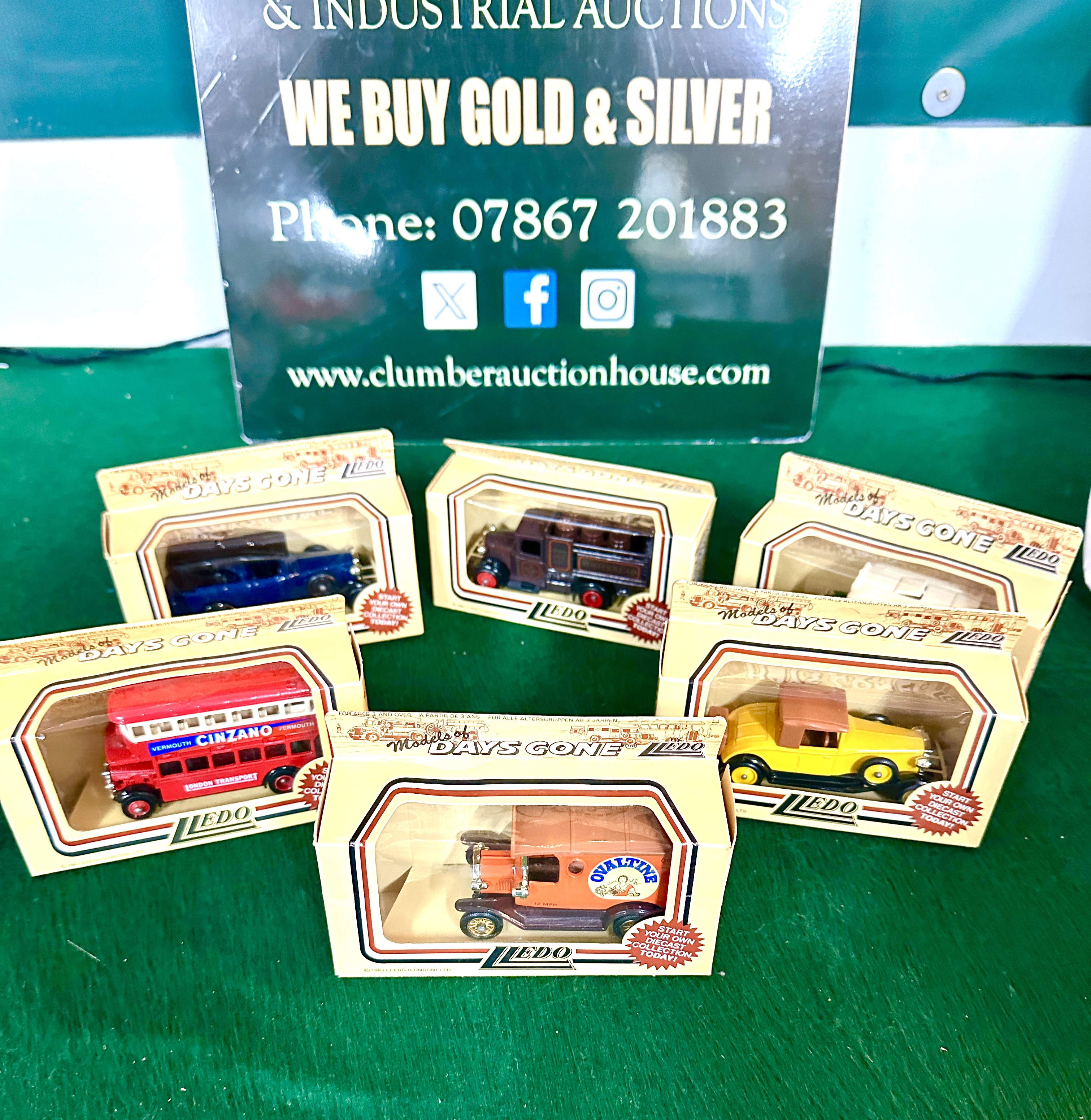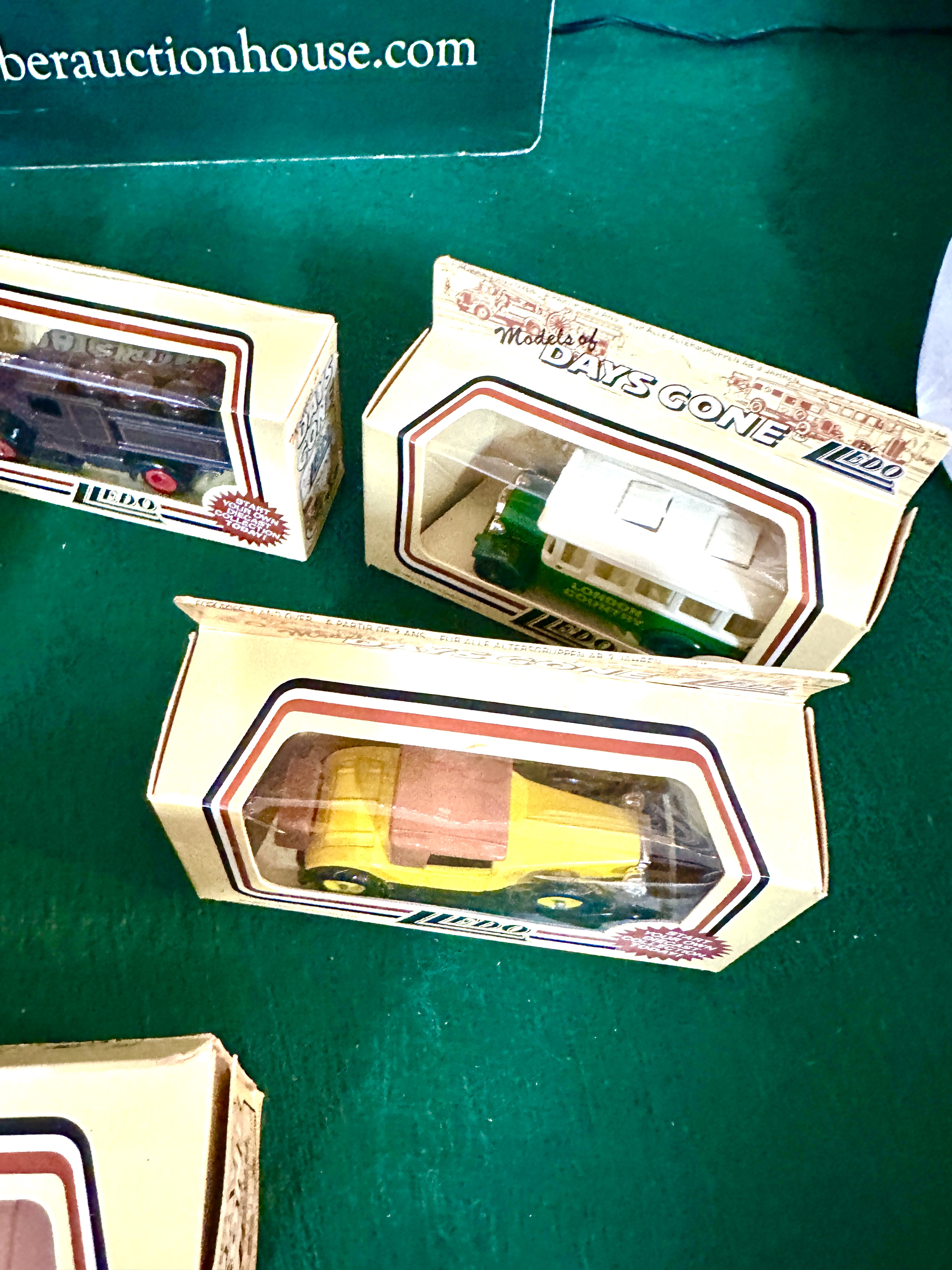 A collection of Lledo Models of Days Gone die-cast metal and plastic vehicles. The group includes various early 20th-century transport models, notably a red London Transport double-decker bus with Cinzano advertising, an orange Ovaltine delivery van, and a green and white London Country bus. Other models include vintage-style automobiles in yellow, blue, and brown liveries. Each vehicle is housed in its original cream-coloured illustrated window box featuring Lledo and Models of Days Gone branding. These models were manufactured circa 1983 and represent various historical commercial and passenger vehicles.