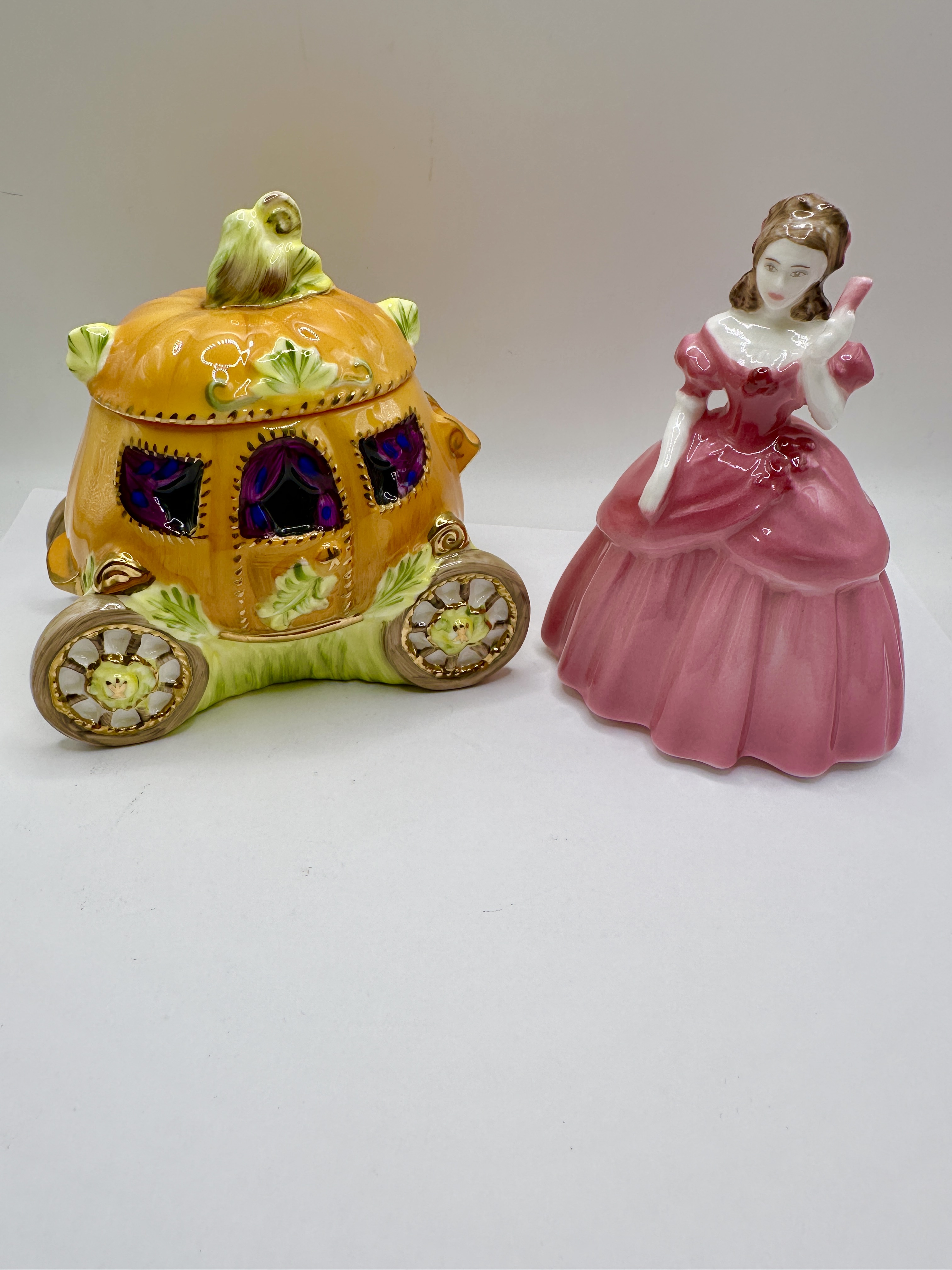 Two Coalport bone china items manufactured in England. The first item is a lidded box modelled as a pumpkin-shaped carriage, featuring hand-painted orange and green glazes, gold-accented wheels, and purple-curtained windows. The base is marked Carriage, Bone China Made in England, and dated 1998. The second item is a hand-decorated figurine titled Alice, modelled by Martin Evans exclusively for Past Times, Oxford. The figure is depicted in a voluminous pink gown holding a fan. The underside bears the Coalport backstamp, Made in England, and is dated 1996.