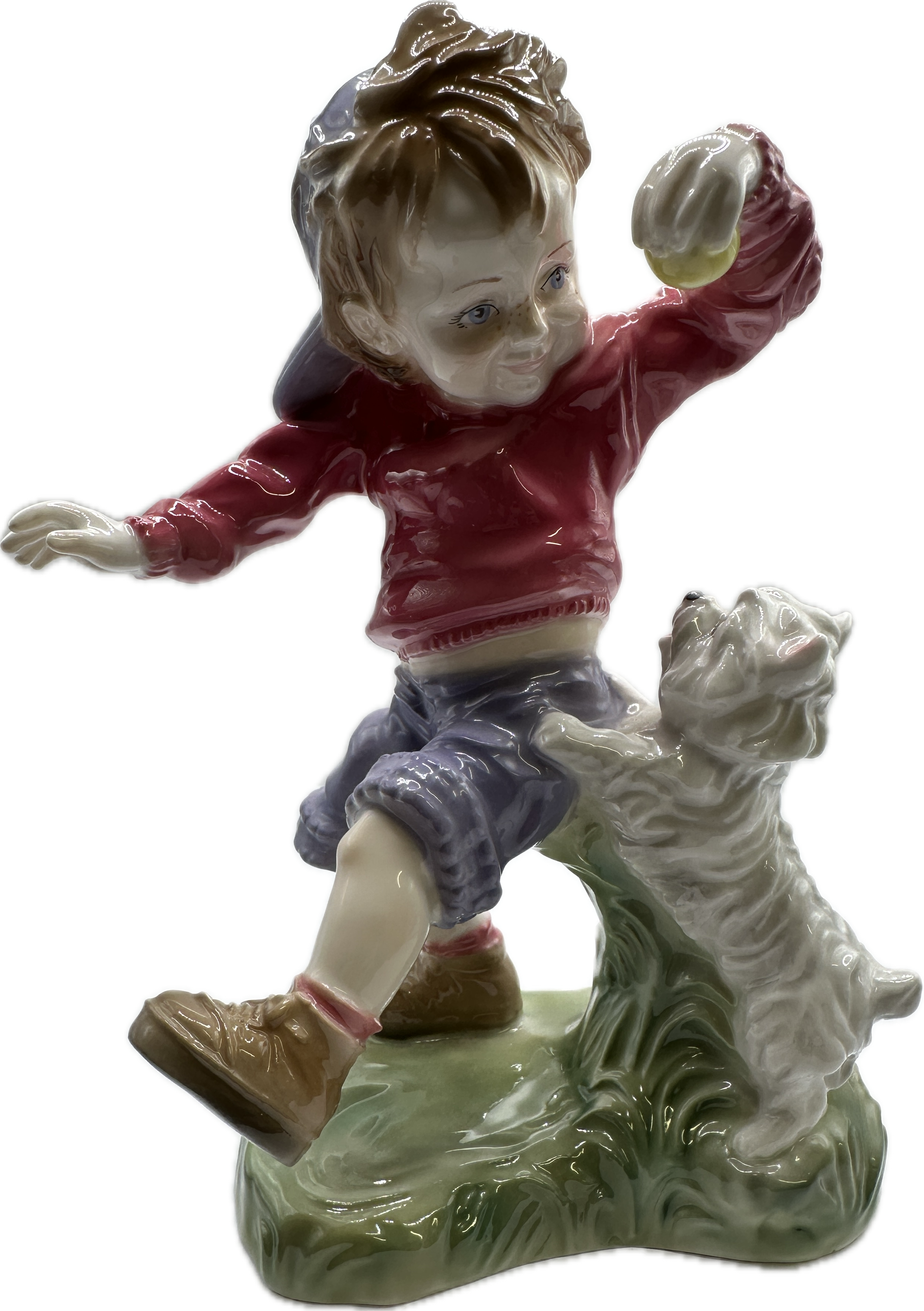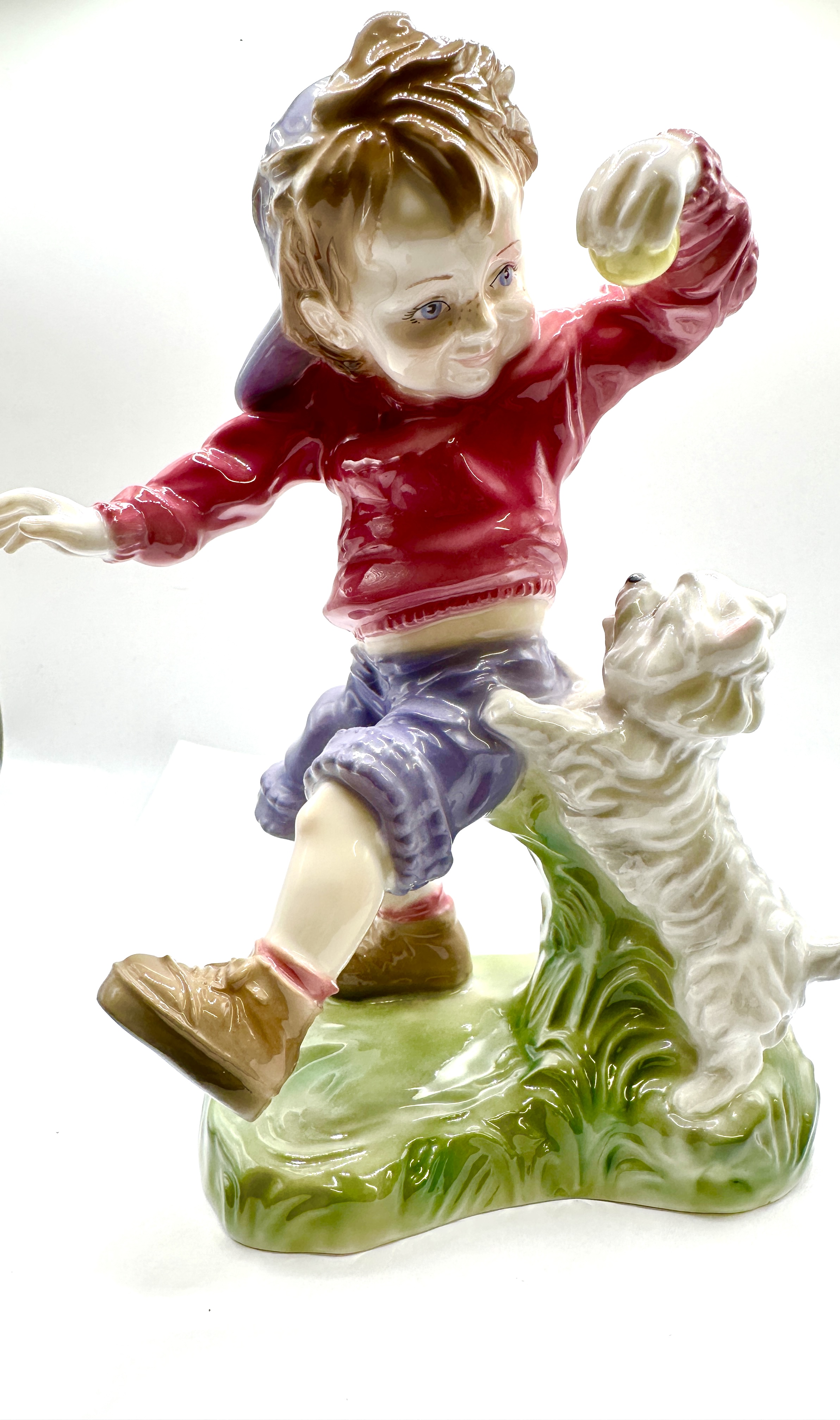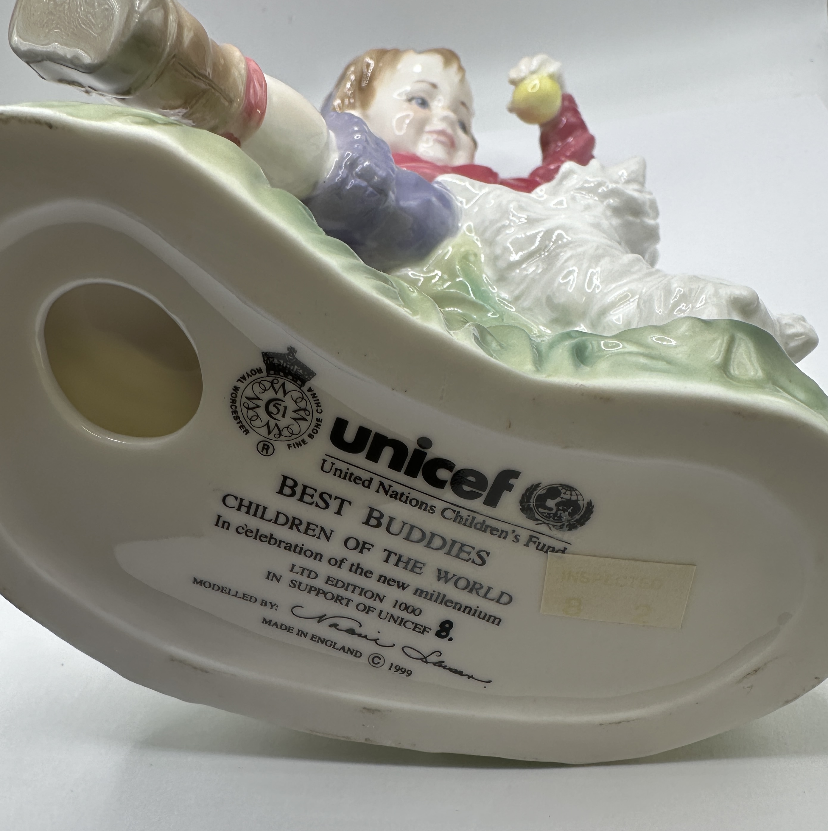 A Royal Worcester fine bone china figurine titled Best Buddies from the Children of the World series, produced in 1999 to celebrate the millennium in support of UNICEF. The polychrome hand-painted piece depicts a young boy in a red sweater and purple shorts holding a ball aloft for a small white dog, set on a moulded green base. The underside displays the Royal Worcester backstamp, the UNICEF logo, and identifies the figurine as number 8 from a limited edition of 1000. The piece was modelled by Naomi Lawson and manufactured in England.