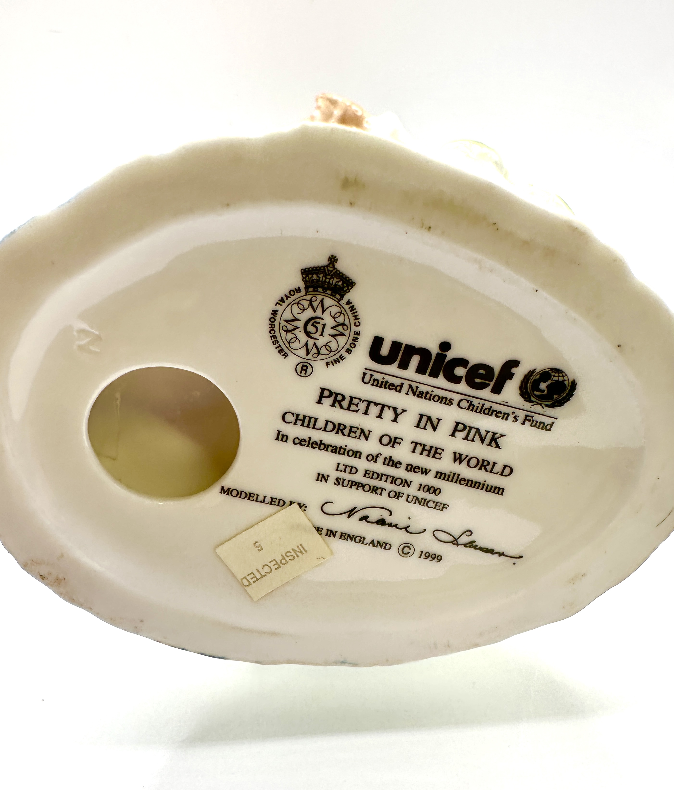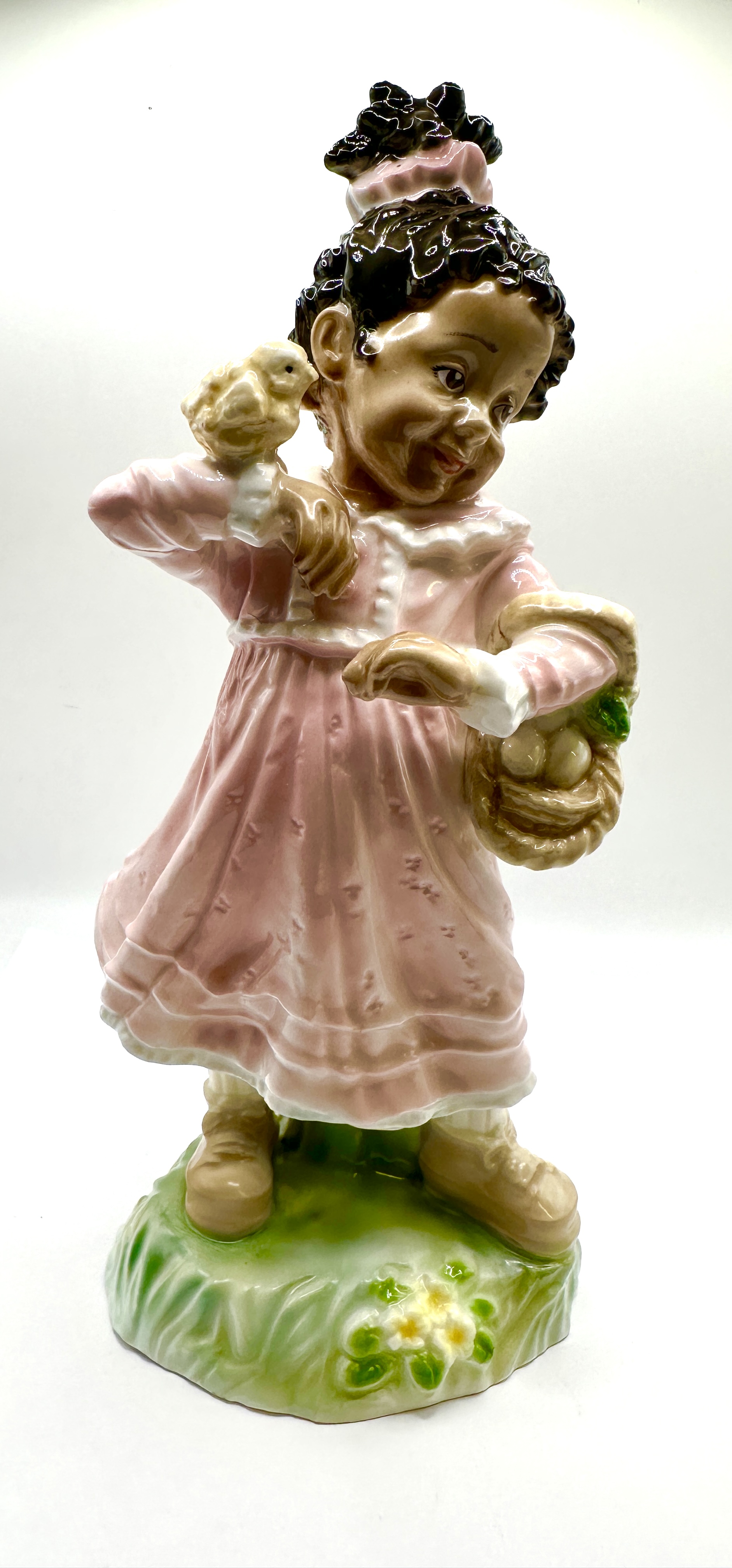 A Royal Worcester fine bone china figurine titled Pretty in Pink from the Children of the World series, produced in 1999 in support of UNICEF to celebrate the new millennium. The polychrome glazed figure depicts a young Black girl in a pale pink dress with lace-style trim, holding a basket of eggs with a small yellow bird perched on her shoulder. The figure stands on a circular base modelled as a grassy mound with small white flowers. The underside features the Royal Worcester and UNICEF backstamps, identifies the piece as a limited edition of 1000, and includes the printed signature of the modeller, Naomi Lanear. The item is marked Made in England and features a high-gloss finish.