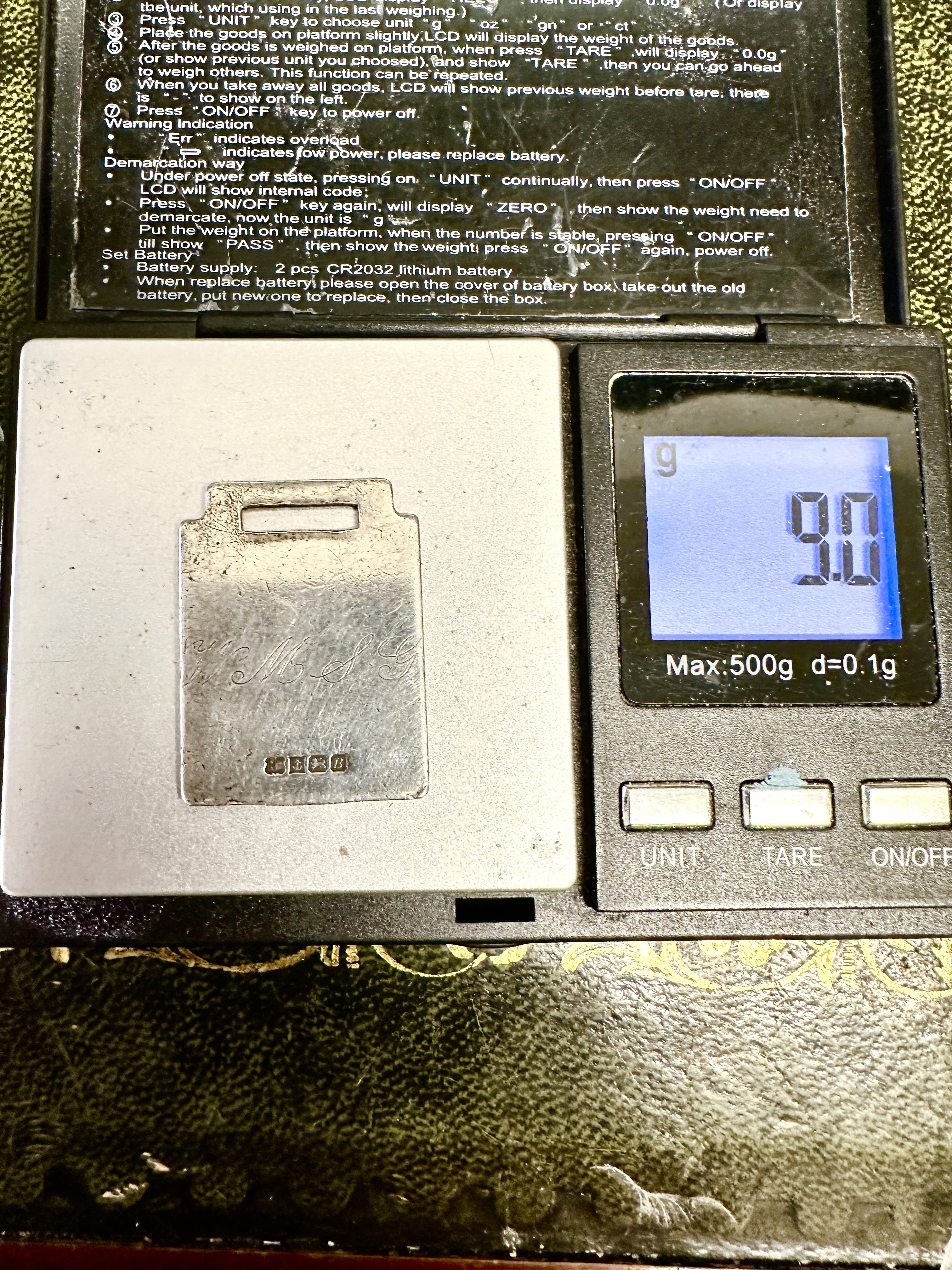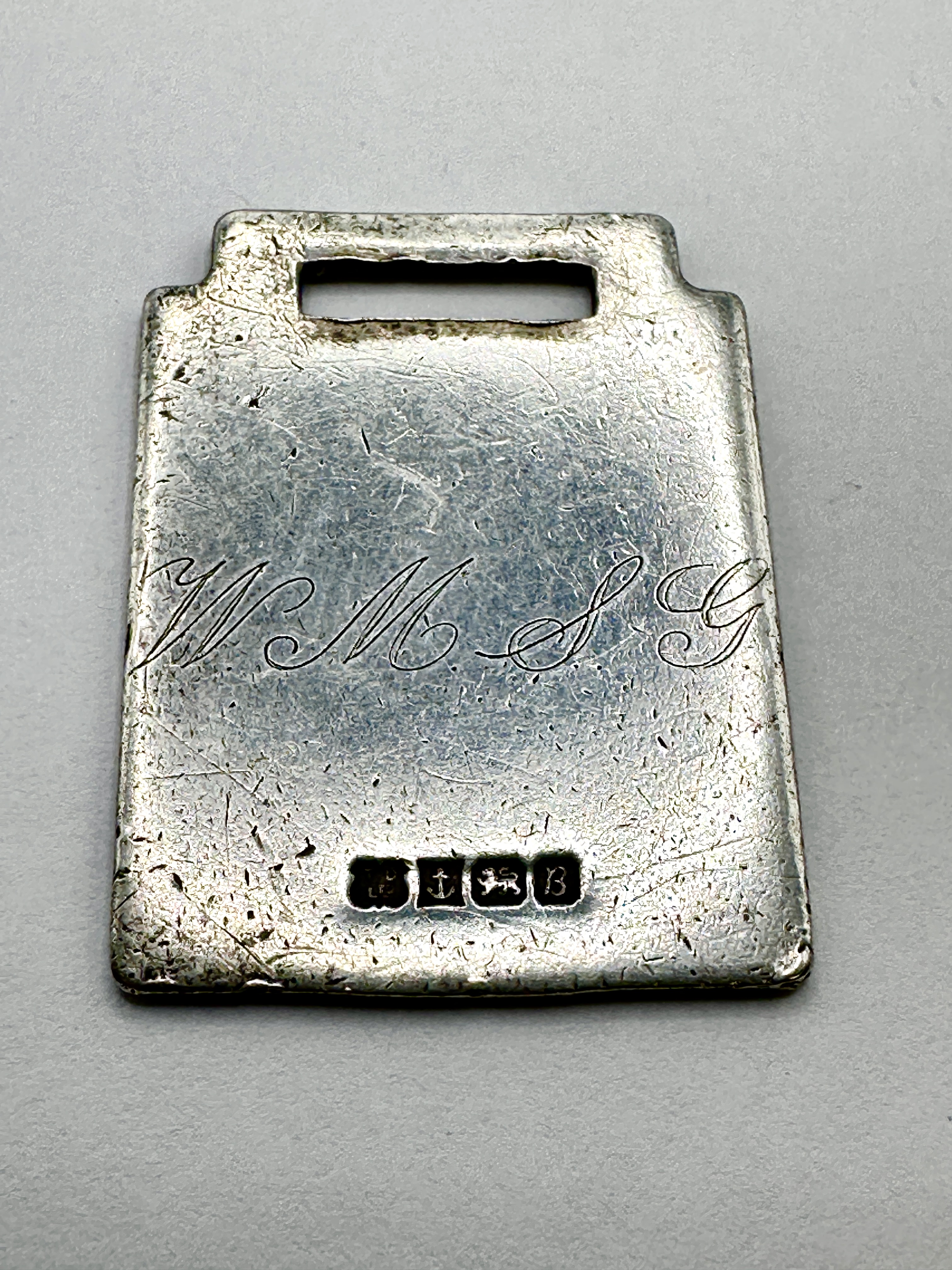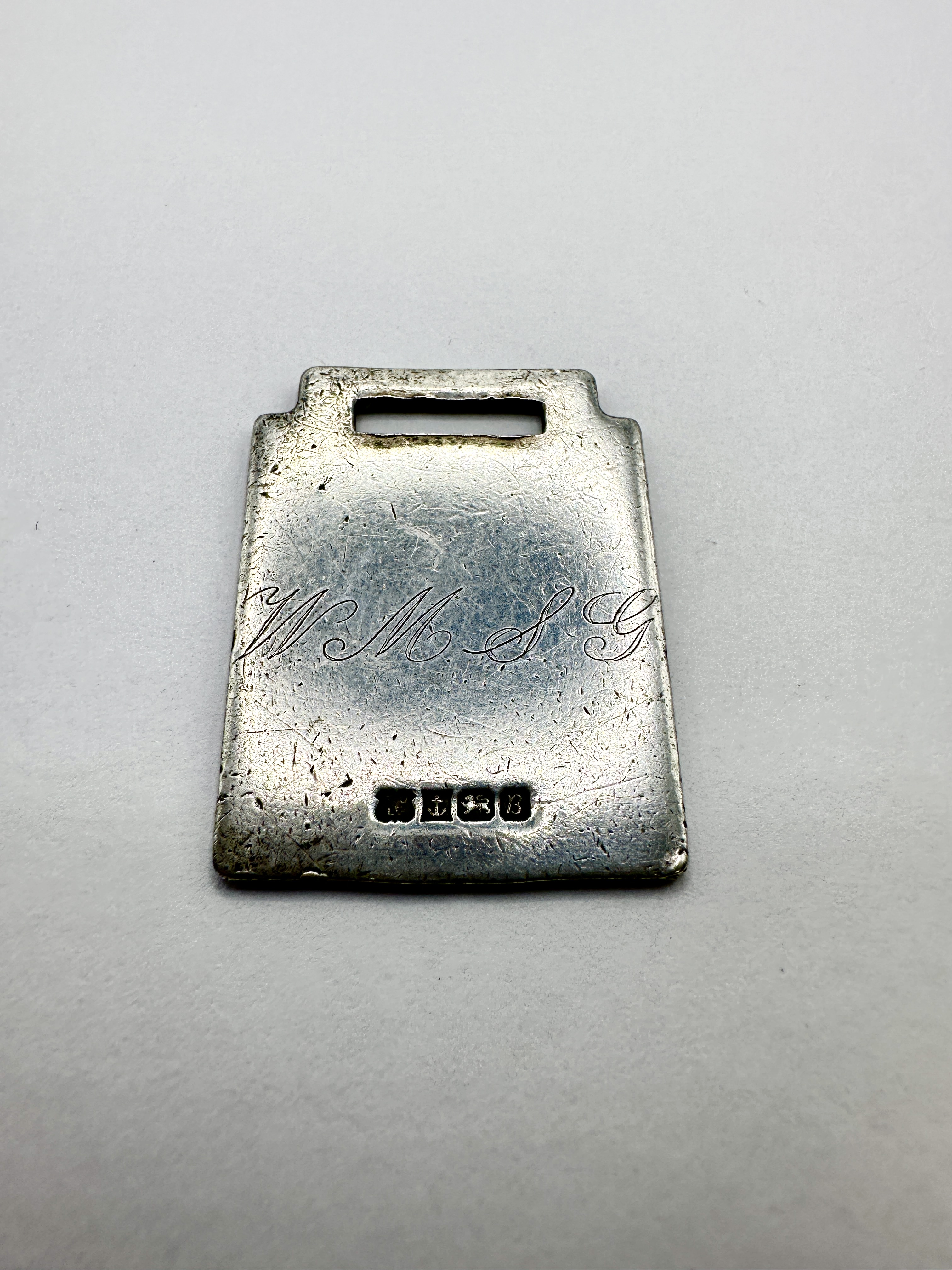 An Edwardian 925 silver identification tag or fob of rectangular form, featuring a functional rectangular cutout at the upper edge. The piece is stamped with the maker mark L&S for Levi & Salaman and bears clear British hallmarks for the Birmingham assay office, including the lion passant and the date letter b for 1901. The face is decorated with engraved script initials W.M.S.G. The reverse is plain.