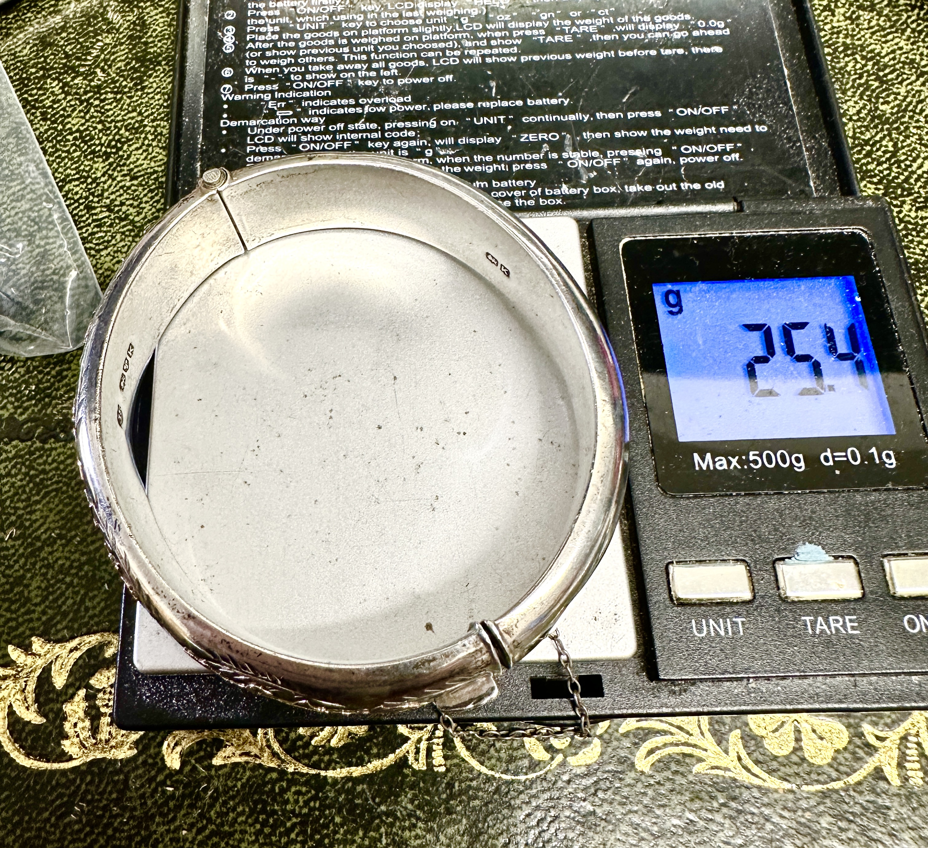 The bangle exhibits minor surface scratches and tarnishing consistent with age and wear. The clasp and safety chain remain functional.