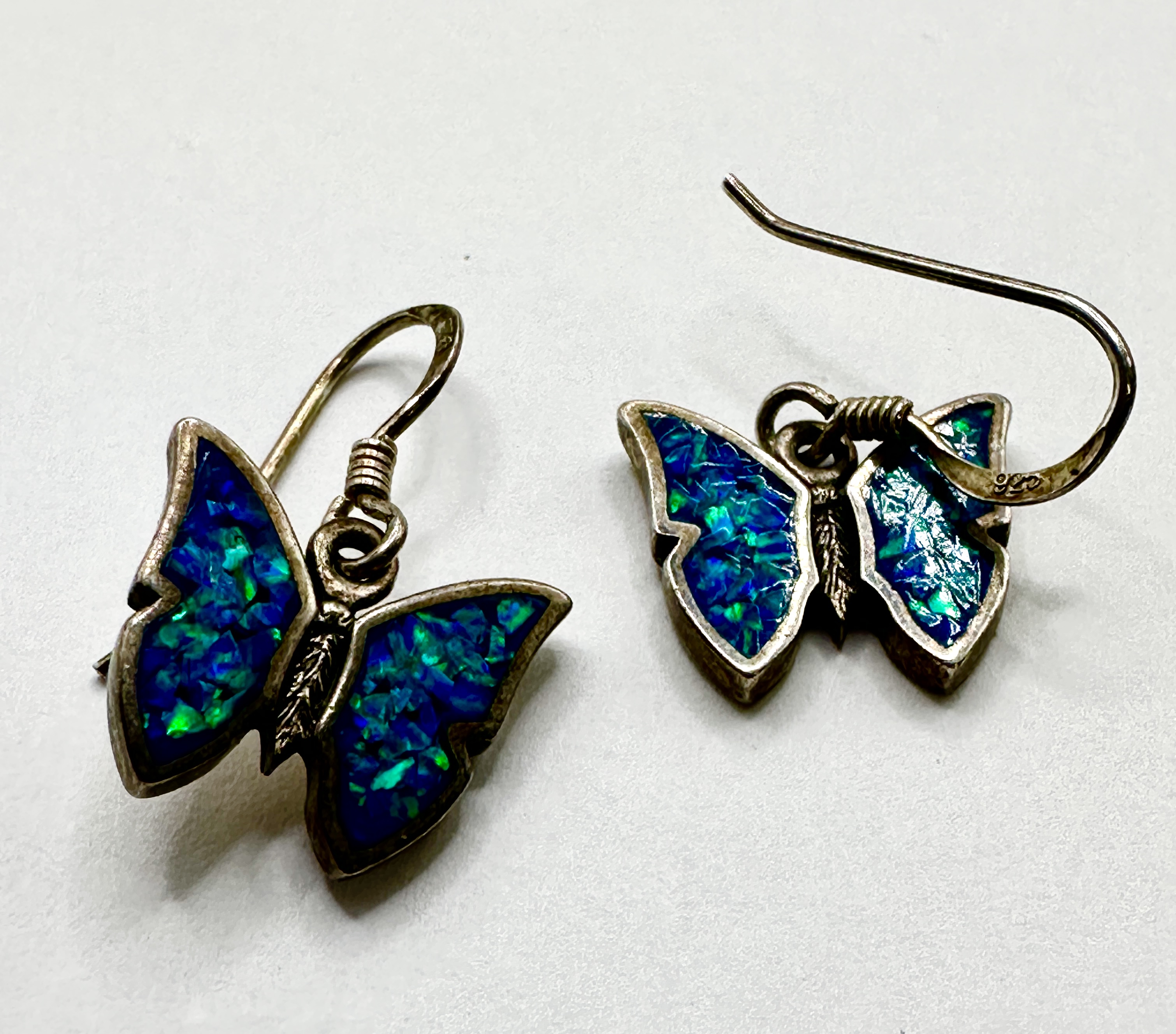 A pair of drop earrings featuring a butterfly motif, constructed from 925 silver. Each earring is designed with a central butterfly body and wings inlaid with crushed opal of vibrant blue and green colours. The pieces are suspended from French hook ear wires. A 925 hallmark is present on the ear wires, confirming the silver purity.