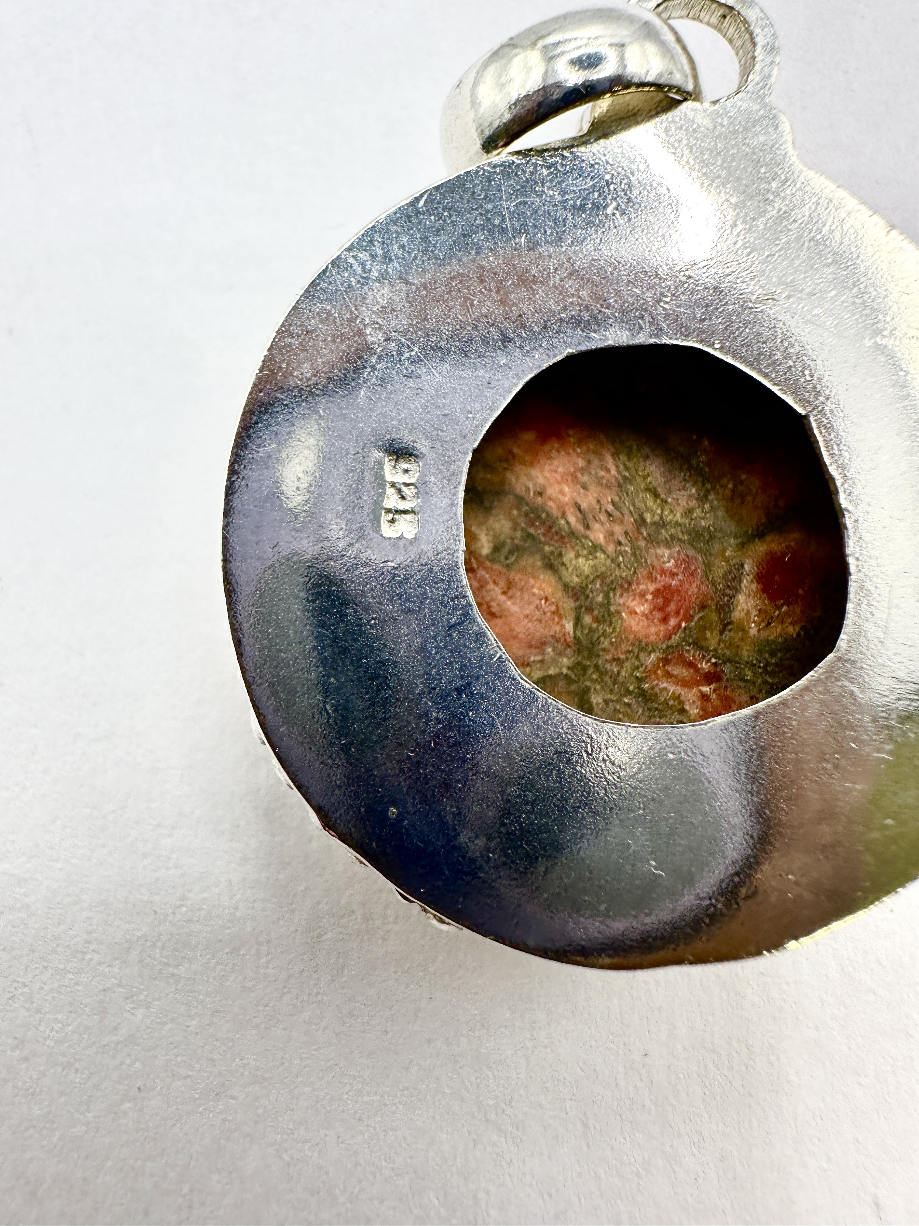 A 925 silver pendant featuring a large circular cabochon of composite copper red turquoise. The stone displays a mottled pattern of red and orange tones with metallic copper-coloured veins and olive green inclusions. The gemstone is secured within a decorative bezel setting, embellished with a twisted rope inner border and a granulated outer rim. The reverse of the pendant is constructed with a circular opening to the gemstone and is stamped 925 to denote the silver purity. The pendant is completed with a polished silver bail.