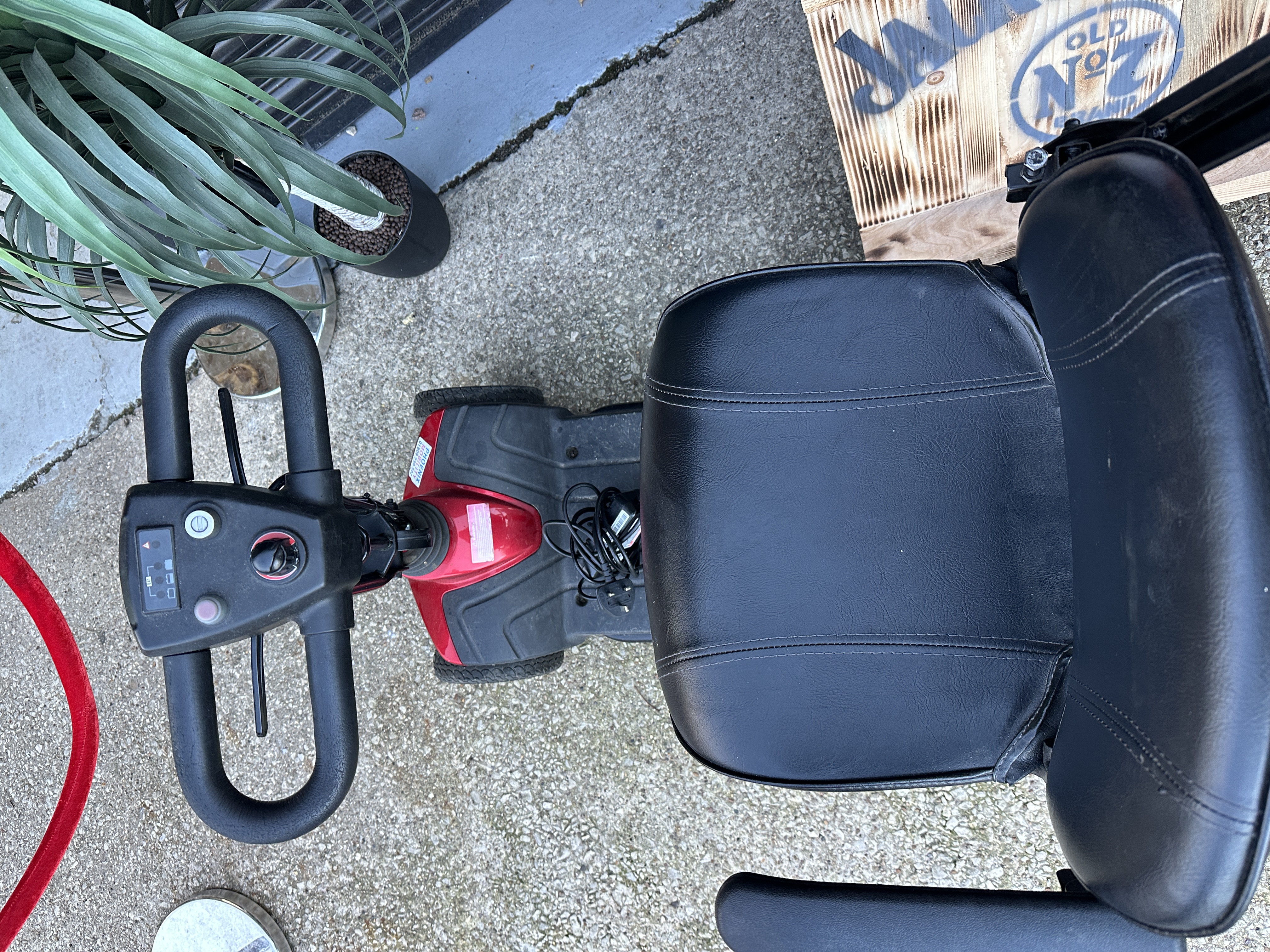 A Drive Medical Bobcat four-wheel electric mobility scooter featuring a metallic red body and black padded vinyl upholstery. The unit is designed with a delta-style tiller housing a control panel that includes a variable speed dial, horn, and battery power indicator. The construction includes four solid black non-marking tyres, a textured black floor mat, and a height-adjustable seat with flip-up armrests. Visible markings include the Drive manufacturer logo and a dealer sticker for Phoenix Mobility. The scooter is accompanied by a mains charging unit fitted with a UK three-pin plug.