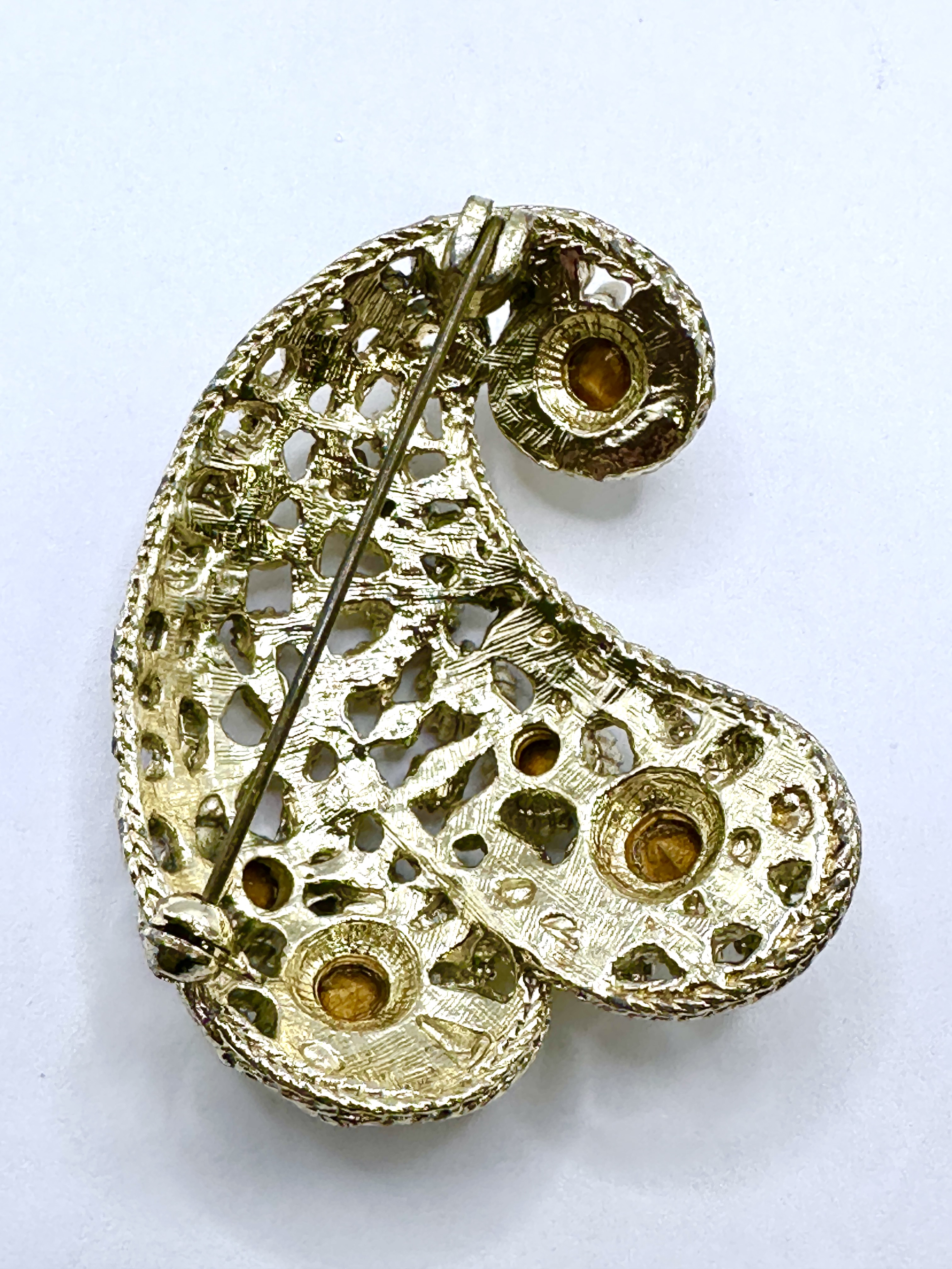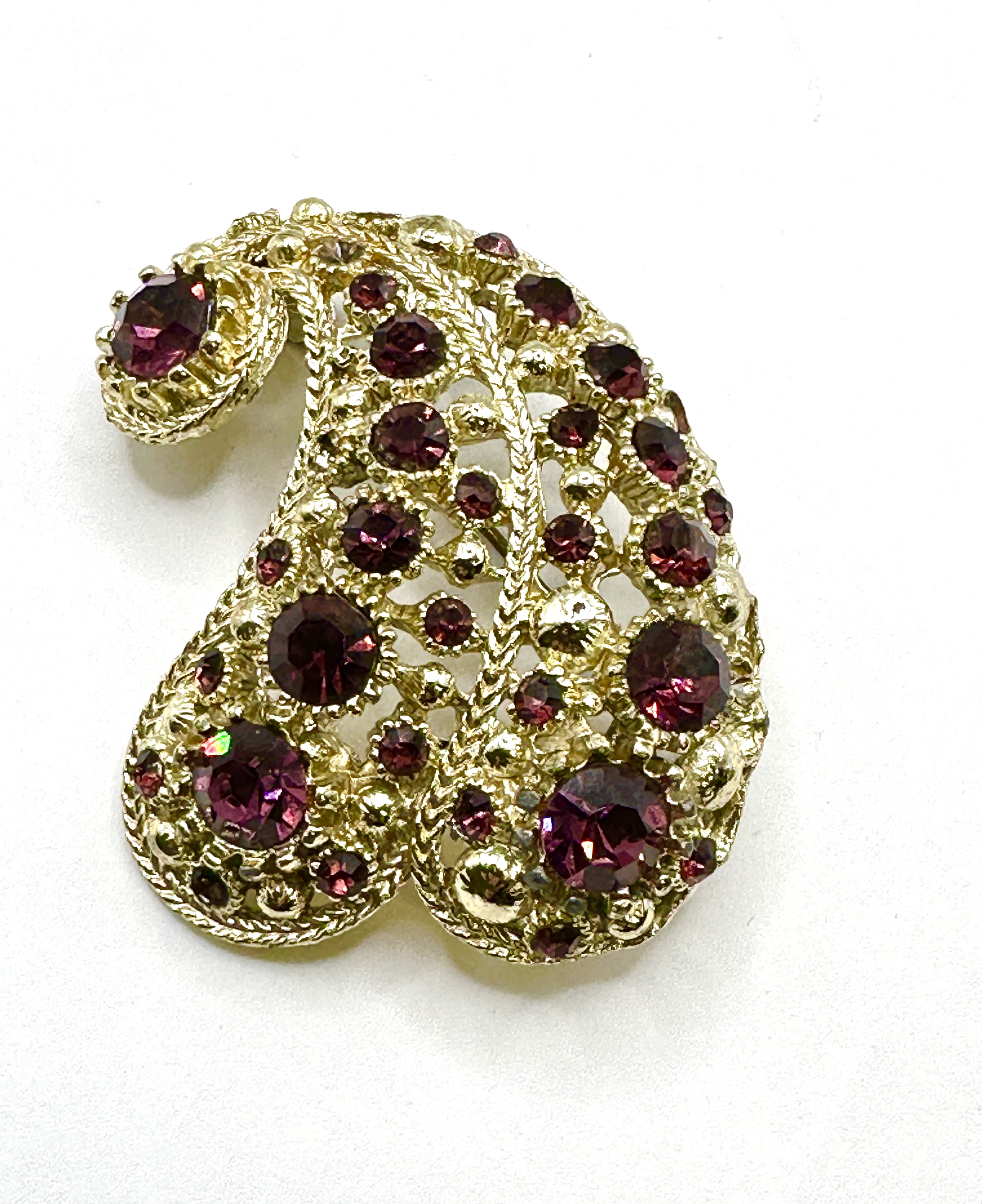 A Weiss style costume jewellery brooch designed in a stylised paisley or teardrop form. The piece features an ornate gold-toned metal openwork frame with a textured filigree finish. The front is set with various-sized round faceted purple rhinestones in a scattered arrangement. The reverse displays a textured grid pattern and is equipped with a functional pin stem and safety catch mechanism. No maker marks or hallmarks are visible.