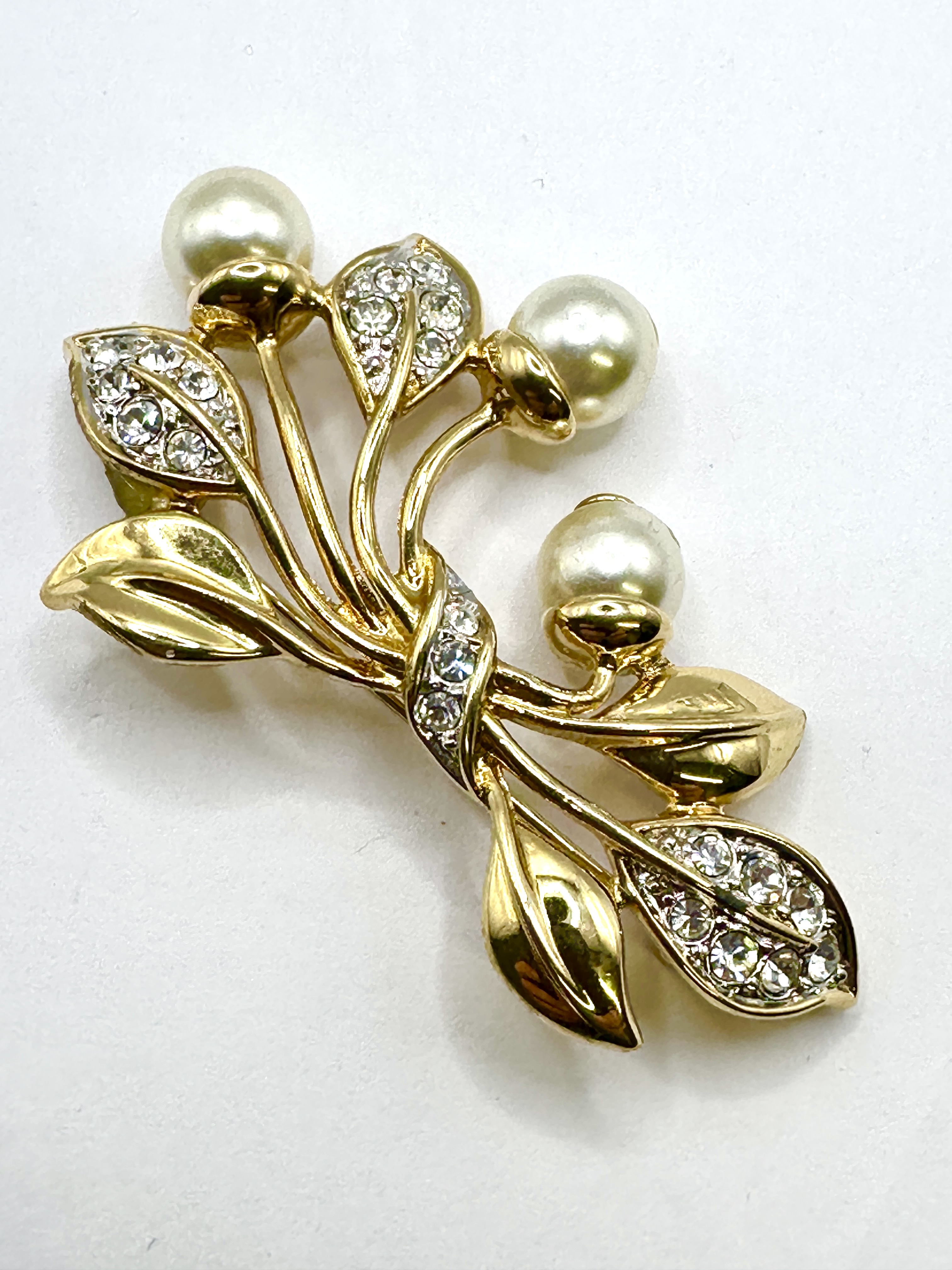 A gold-tone foliate-style brooch featuring a stylised bouquet design. The piece is composed of several polished gold-tone stems gathered at the centre by a band accented with clear, round-cut rhinestones. The arrangement includes multiple smooth-surfaced leaves alongside leaves pavé-set with clear rhinestones. Three cream-coloured simulated pearls are positioned at the ends of various stems, acting as floral accents. The brooch exhibits a bright, high-polish finish.
