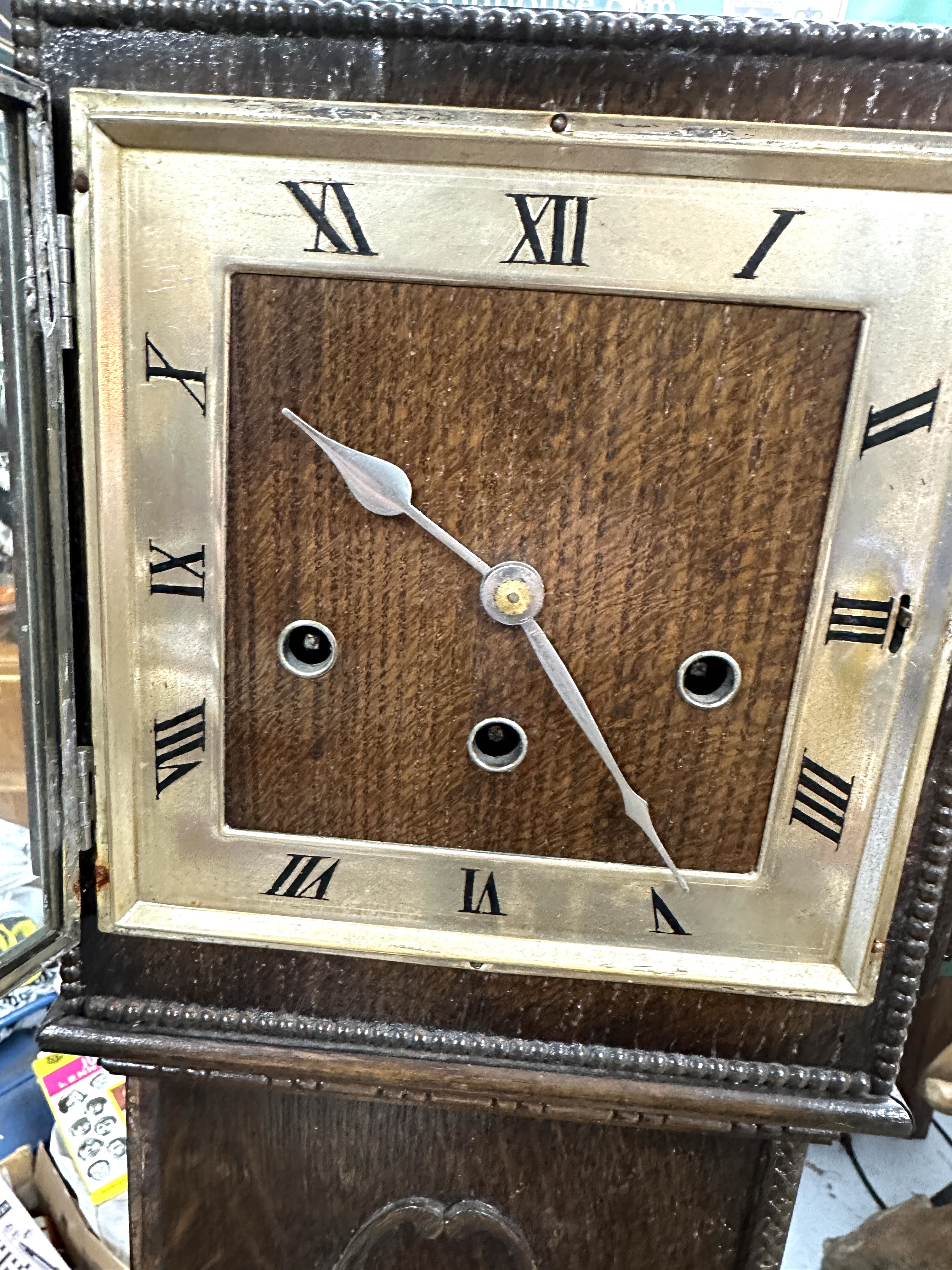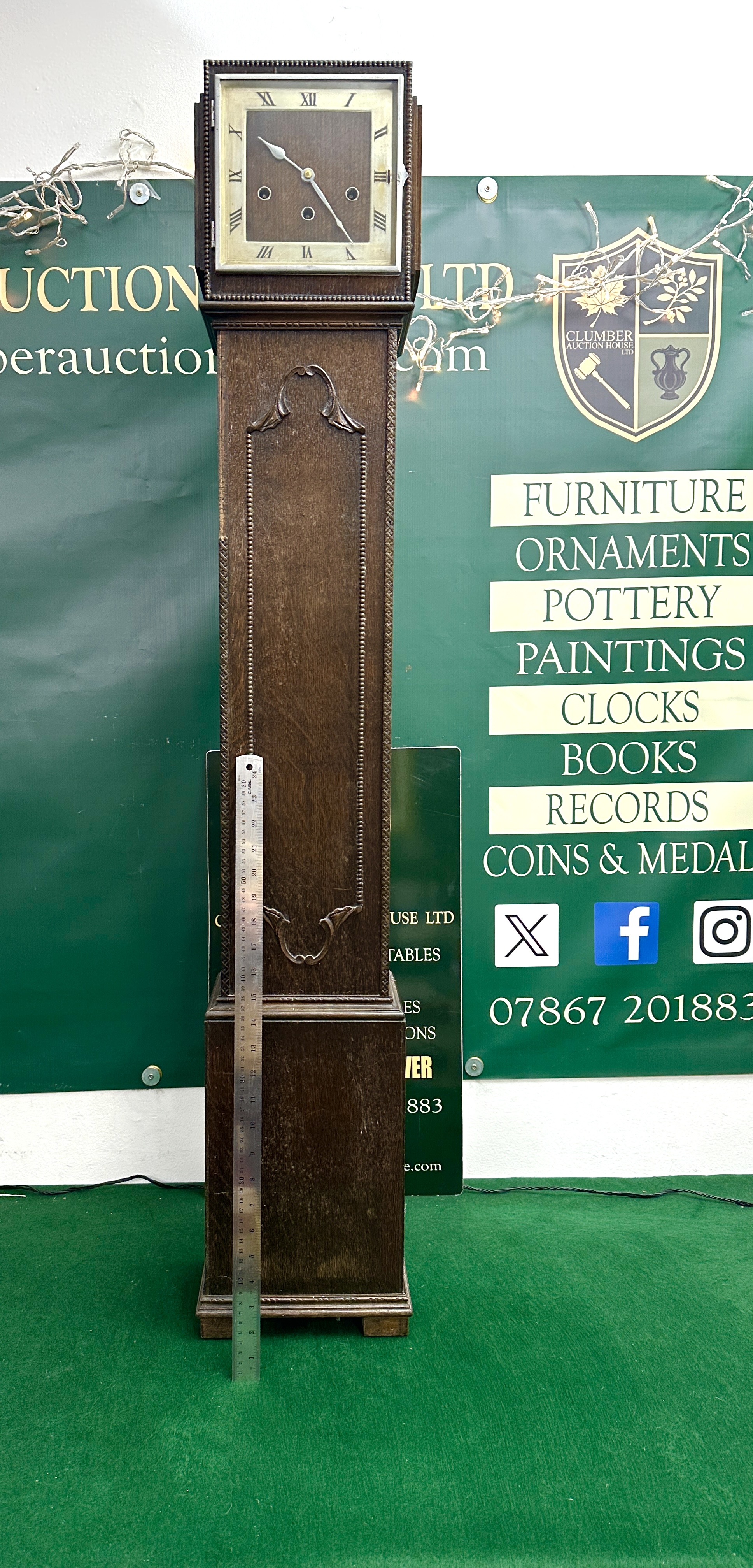 A 1920s or 1930s grandmother clock featuring a slender dark-stained oak case. The square hood sits above a trunk decorated with a decorative raised panel and beaded edging, supported by a simple plinth base. The square dial comprises a metallic-finished chapter ring with black Roman numerals surrounding a central oak panel. The dial features three winding holes and two hands. Internally, the clock contains a brass mechanical movement with a pendulum bob and vertical gong rods for a striking Westminster chime.
