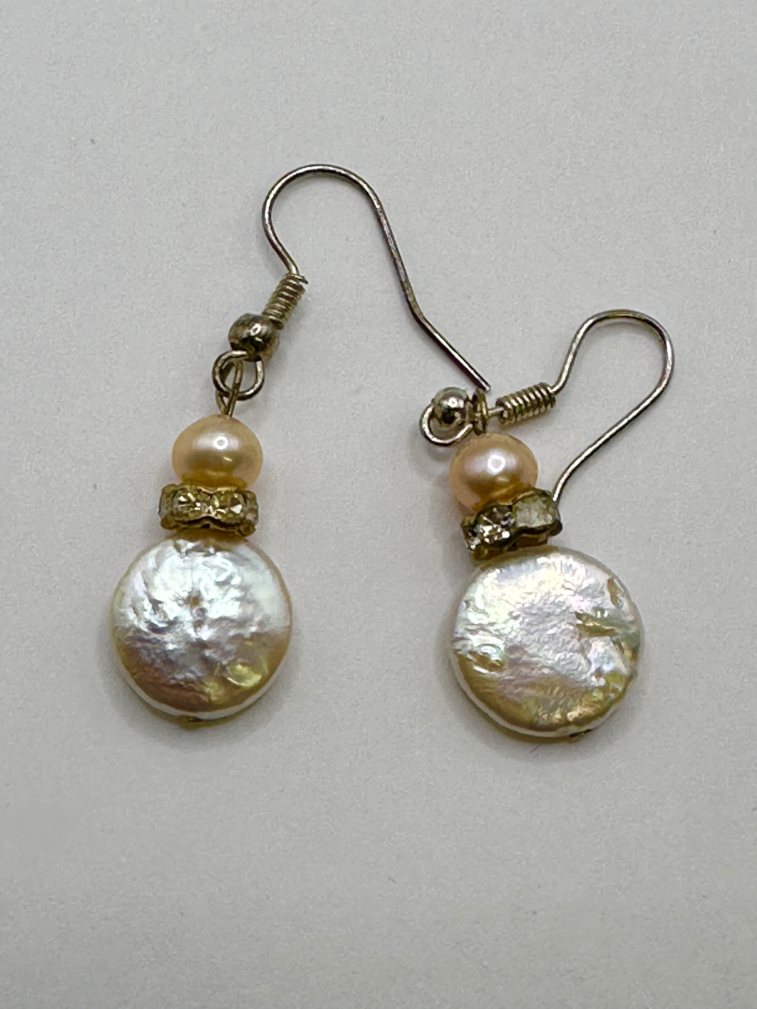 A pair of tiered drop earrings featuring freshwater coin pearls and peach-toned pearls. Each earring is composed of a large, flat, iridescent coin-style pearl at the base, topped with a gold-tone rondelle spacer set with small clear crystals. Above the spacer is a smaller, round peach-toned pearl. The assembly is suspended from silver-tone French wire hooks featuring decorative coils and beads. The pearls exhibit natural surface variations and lustre inherent to freshwater cultured pearl components. No hallmarks or maker’s marks are visible on the items.