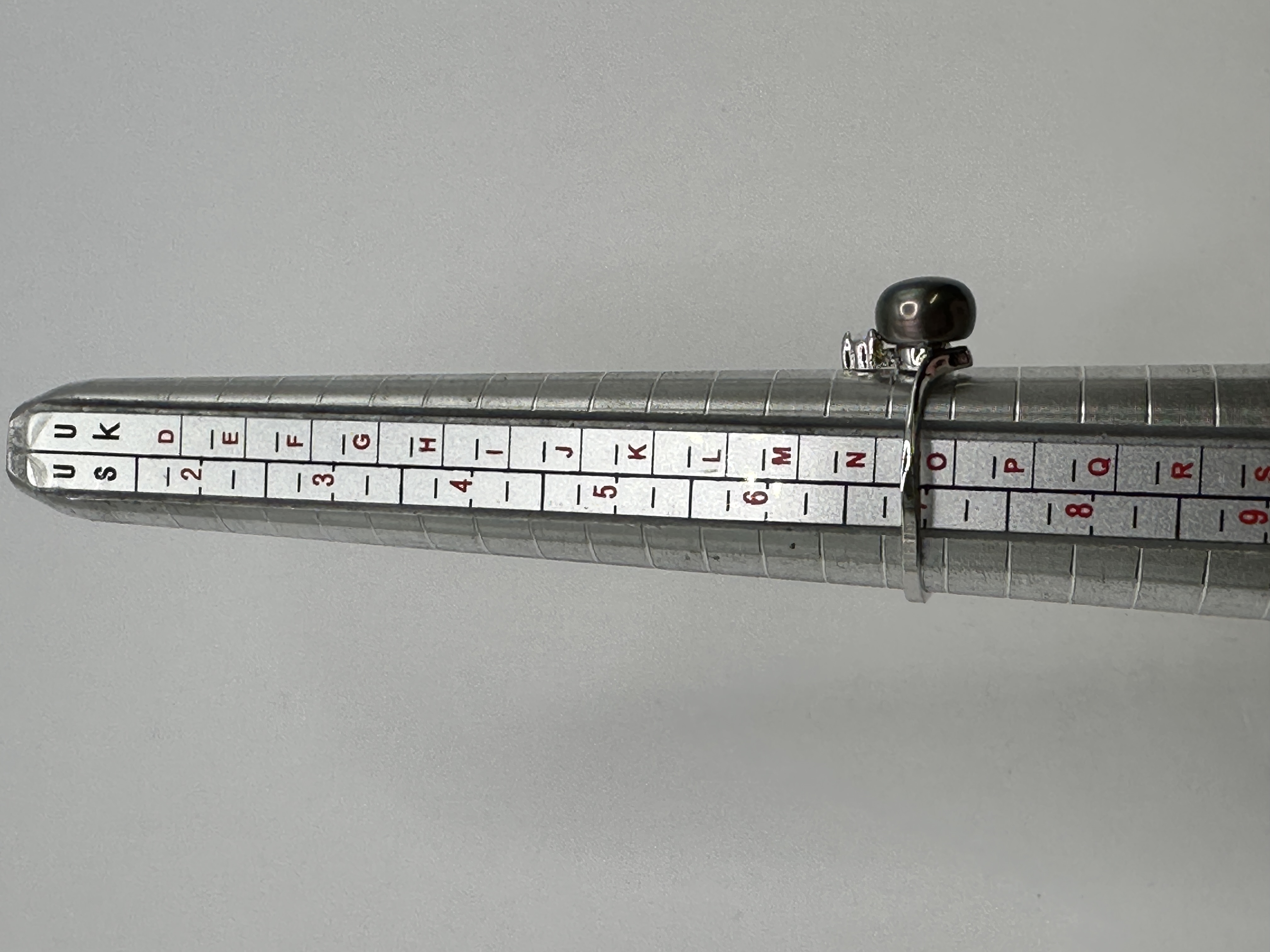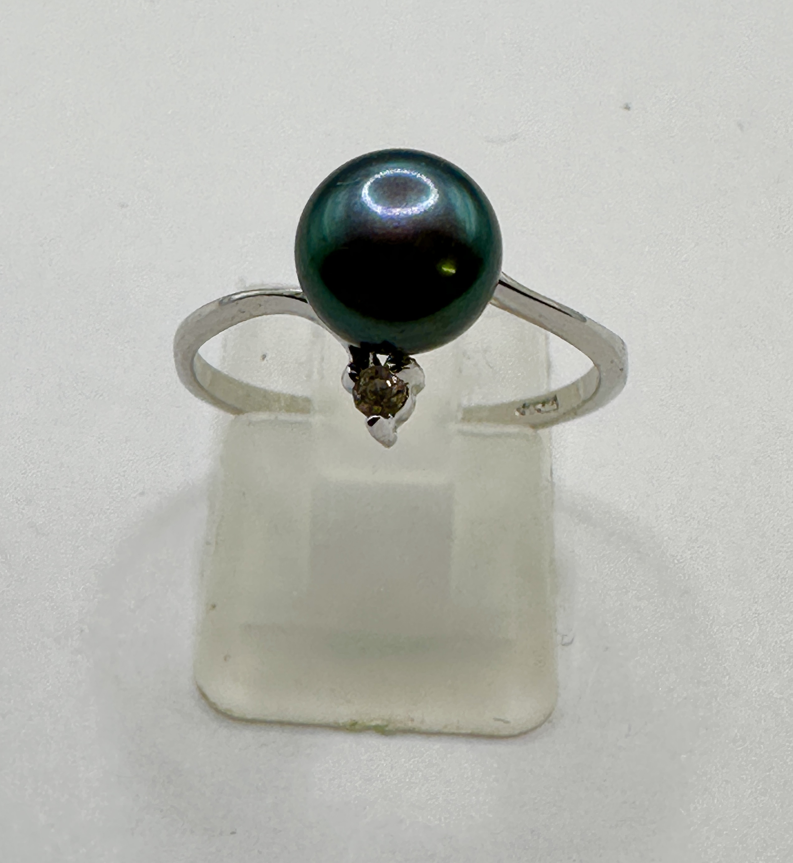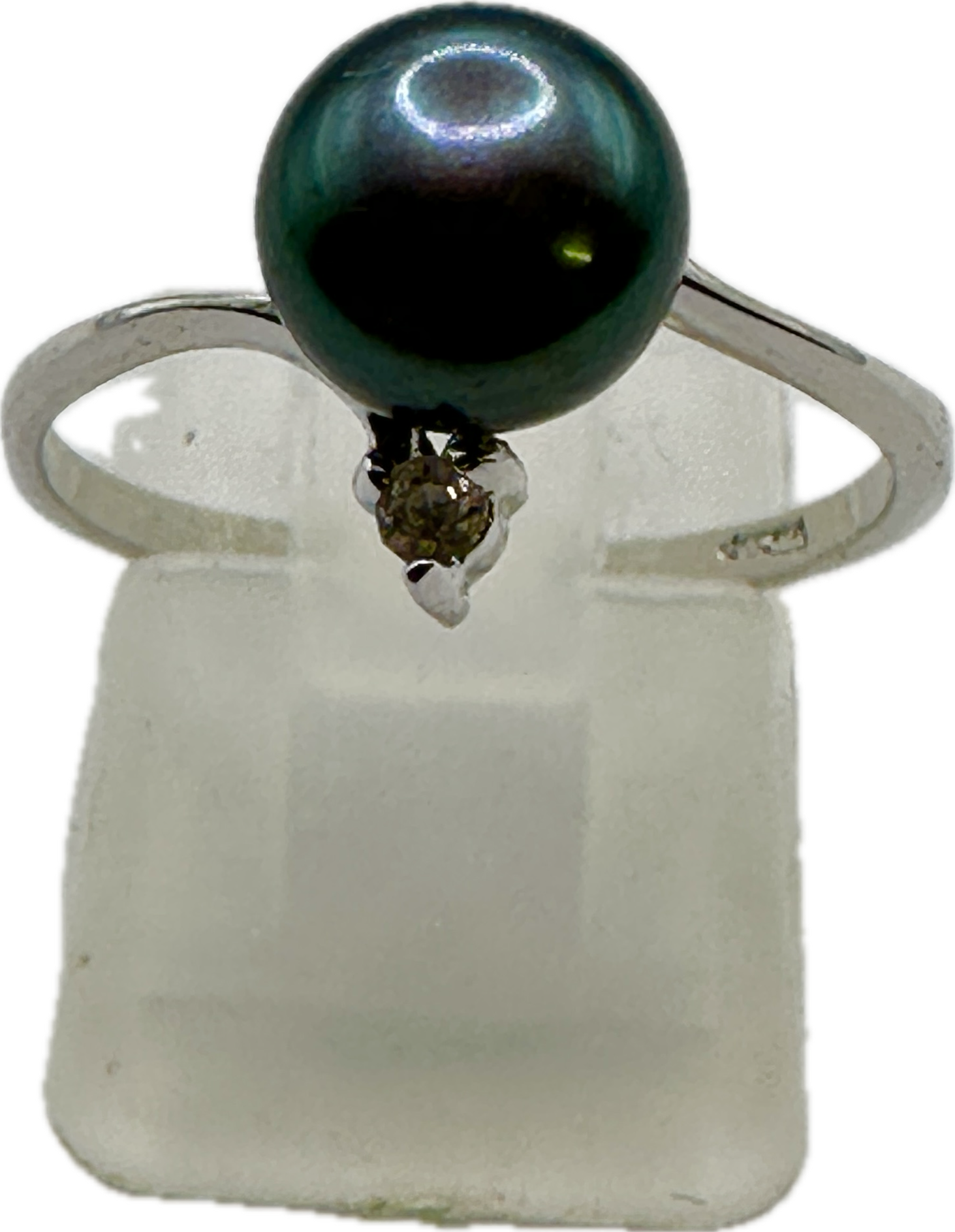 The item is in good overall condition. The pearl surface appears smooth with no significant blemishes or surface reaching inclusions. The silver band shows minimal signs of wear consistent with light use. The setting for both the pearl and the accent stone remains secure.