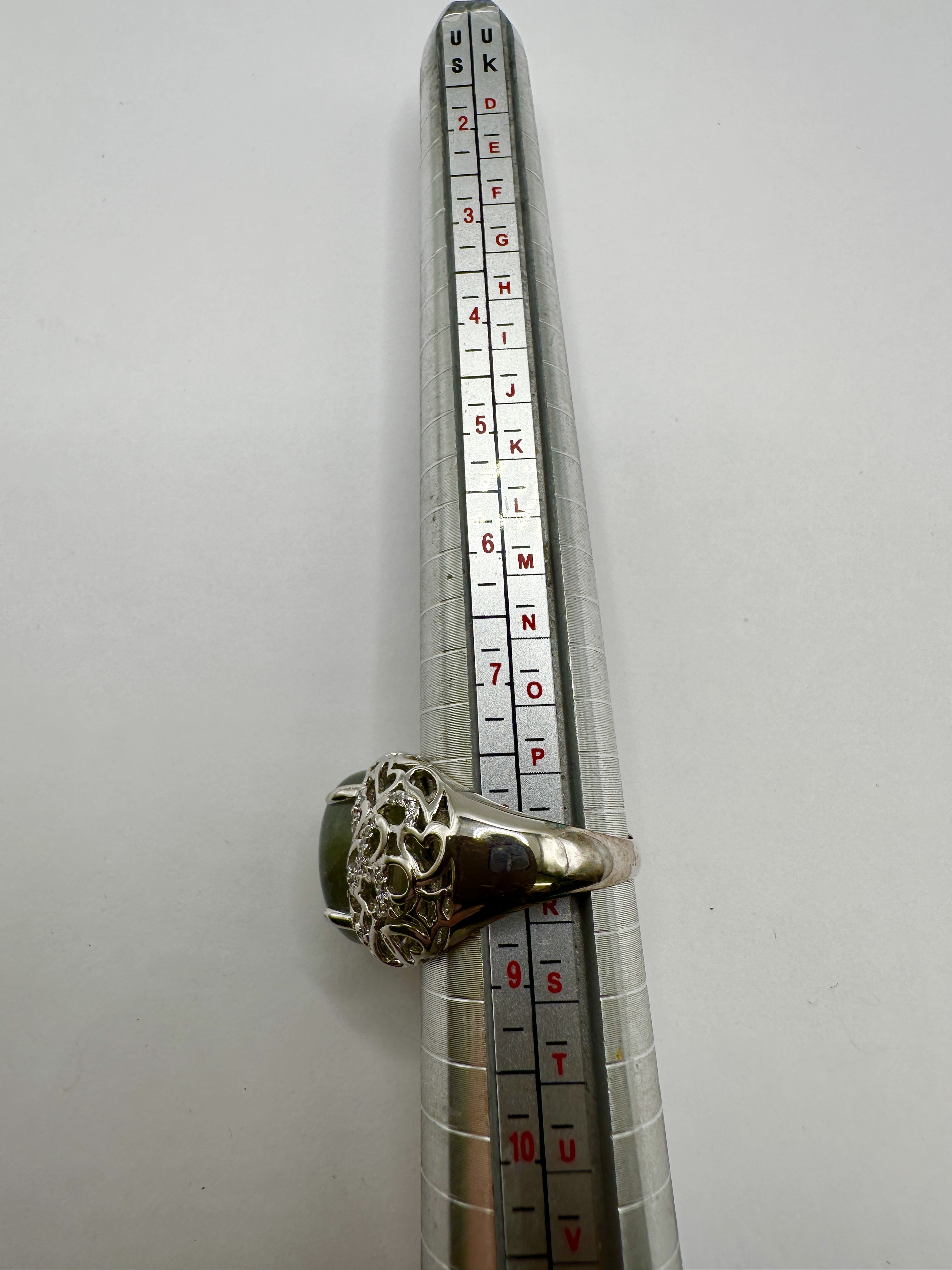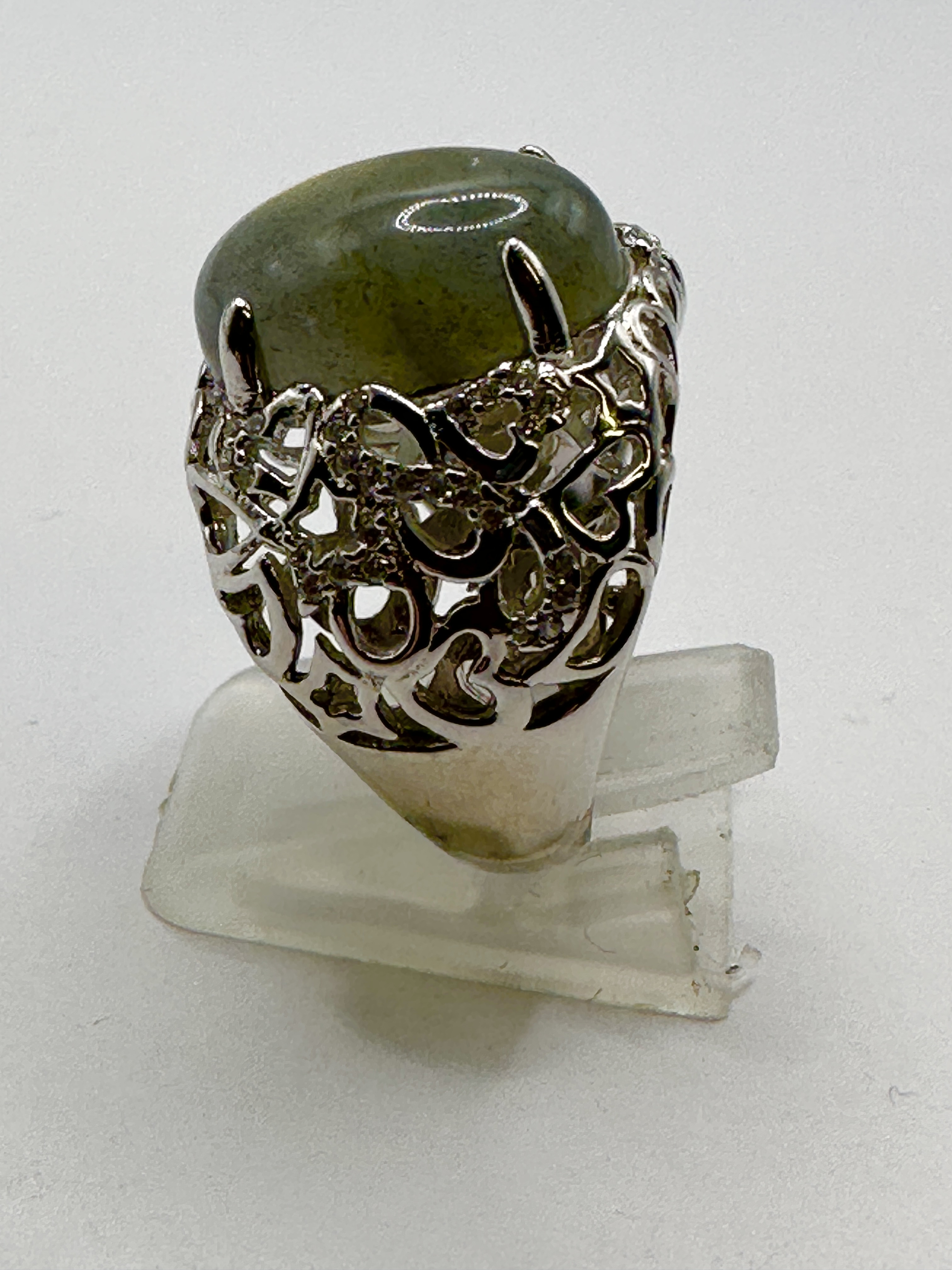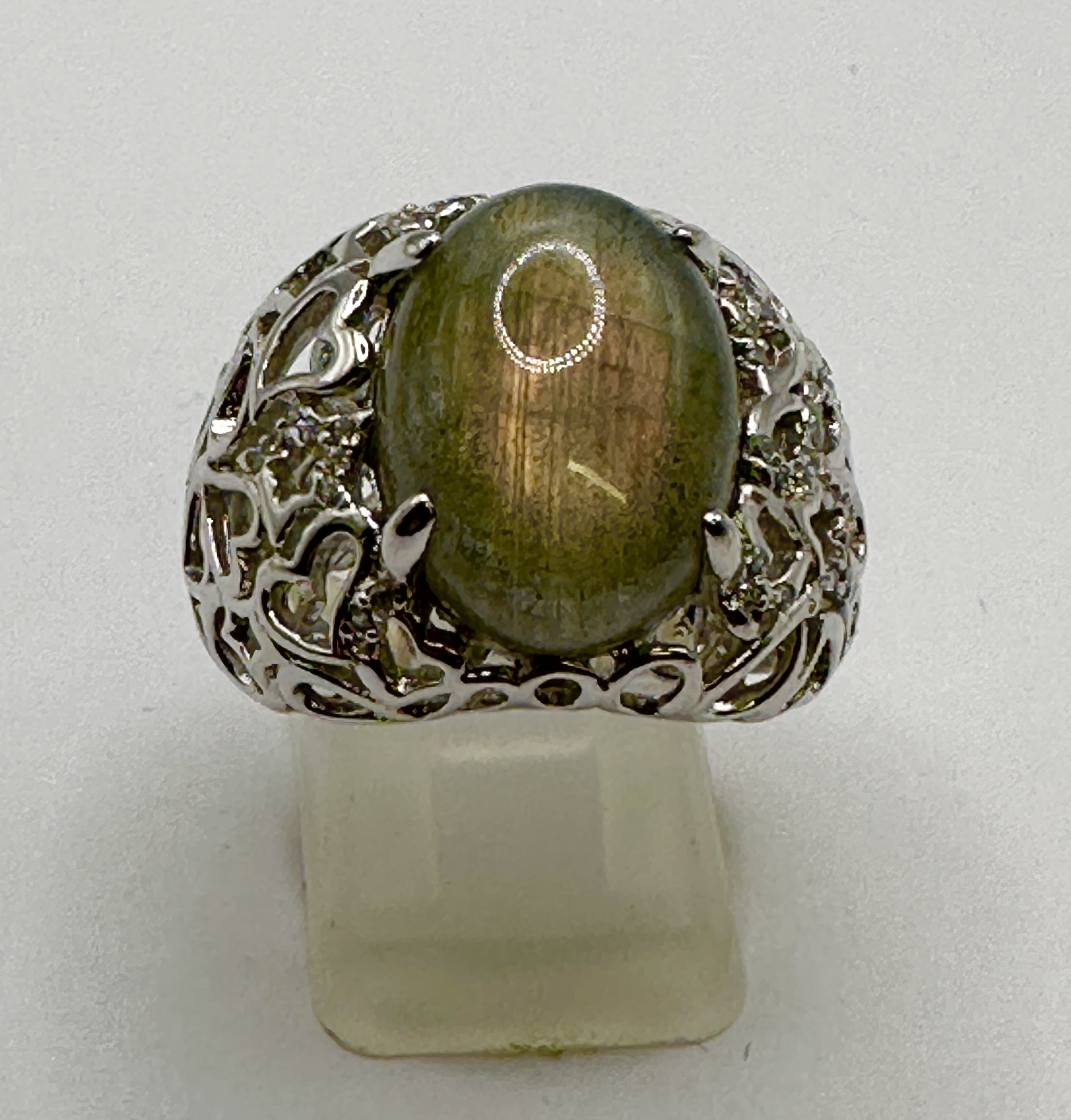 A 925 silver statement ring featuring a large, oval cabochon-cut chrysoberyl. The gemstone is of an olive green hue with subtle chatoyancy, secured in a four-prong setting. The ornate mount displays an intricate openwork filigree design with heart motifs, further accented by small, pavé-set colourless stones. The wide band tapers towards the back and shows a bright, polished finish.