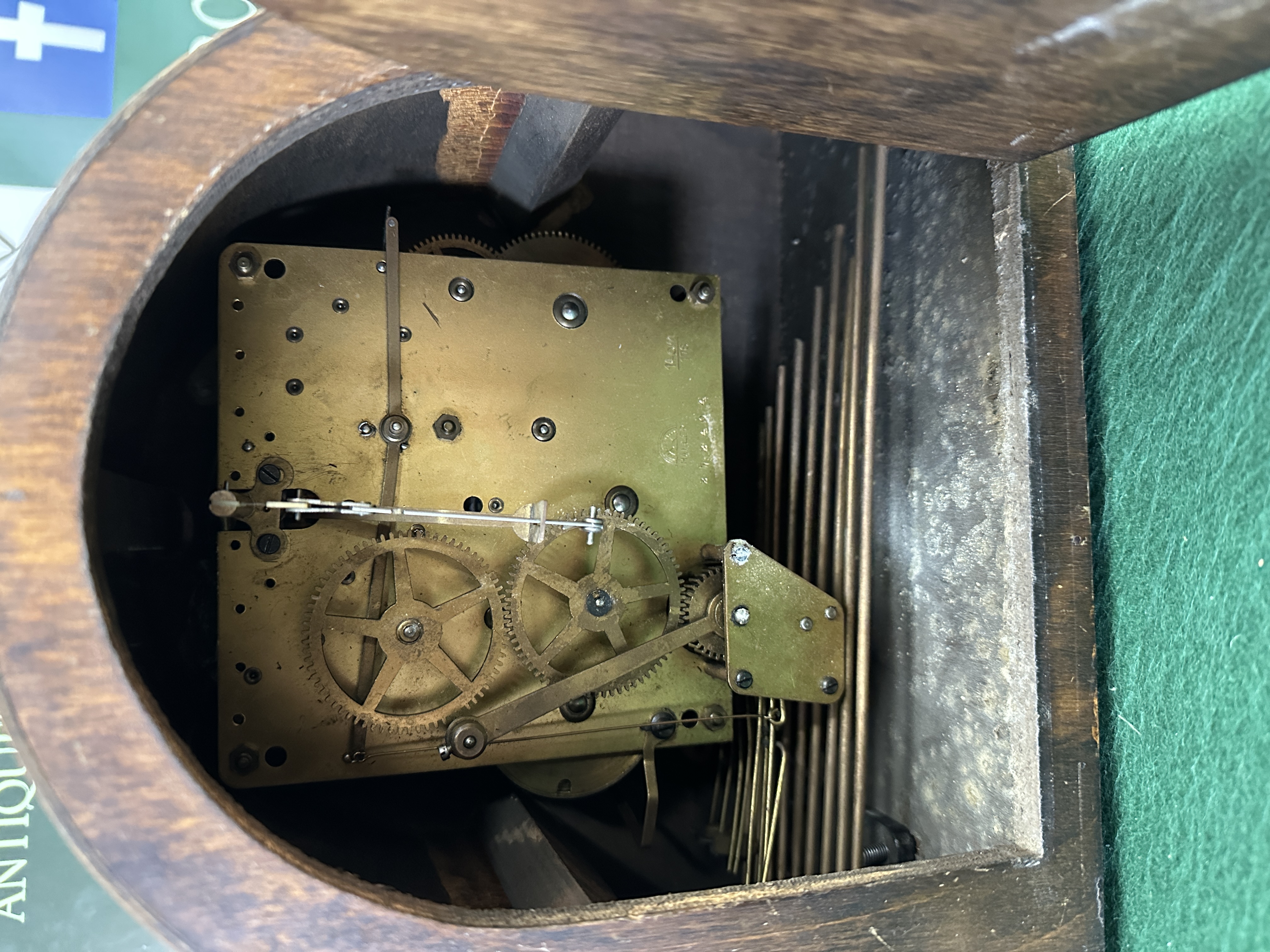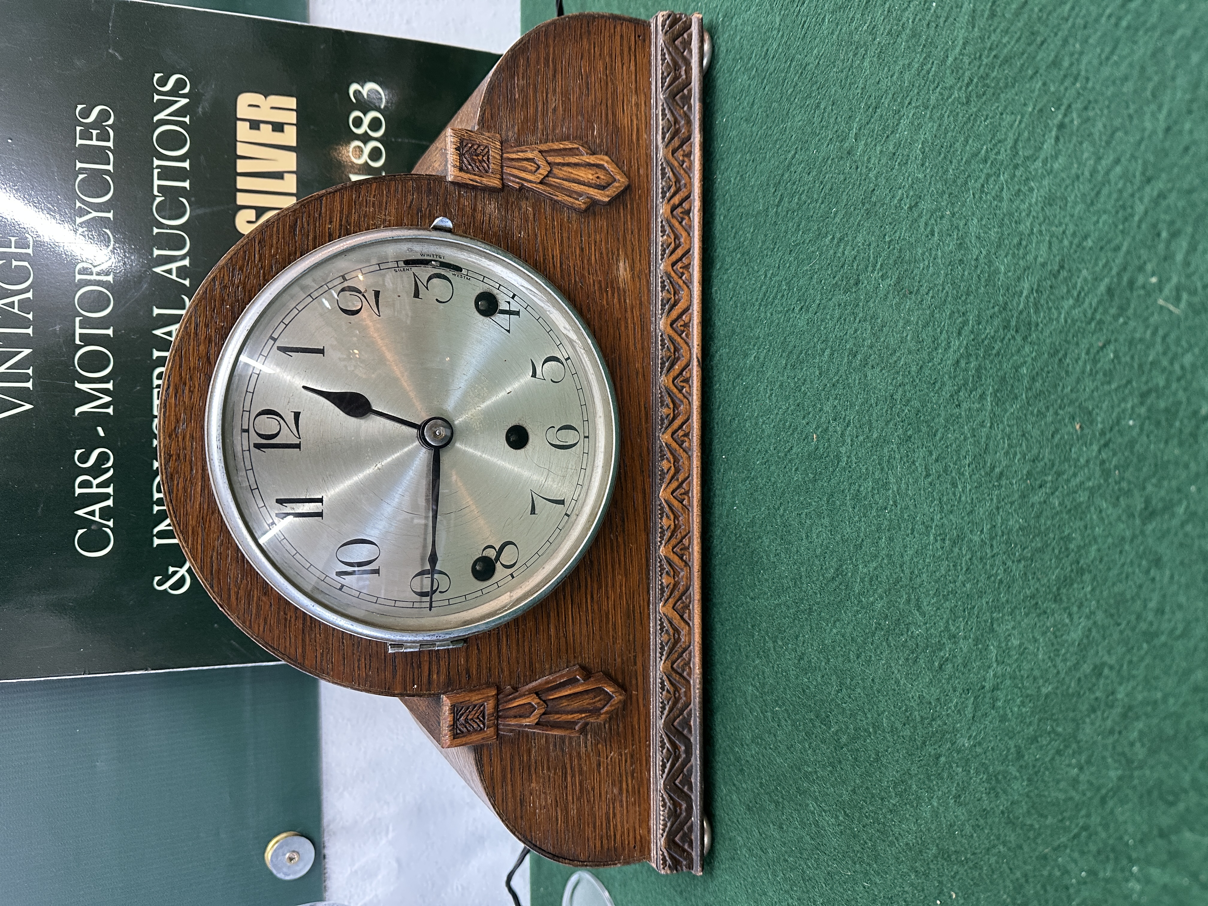 #Art Deco Garrard mantel clock, circa 1930, featuring an arched oak case with carved geometric details and a decorative carved border at the base. The silvered dial displays black Arabic numerals and includes a chime selector for Westminster and Whittington melodies. The clock is powered by a three-train movement.