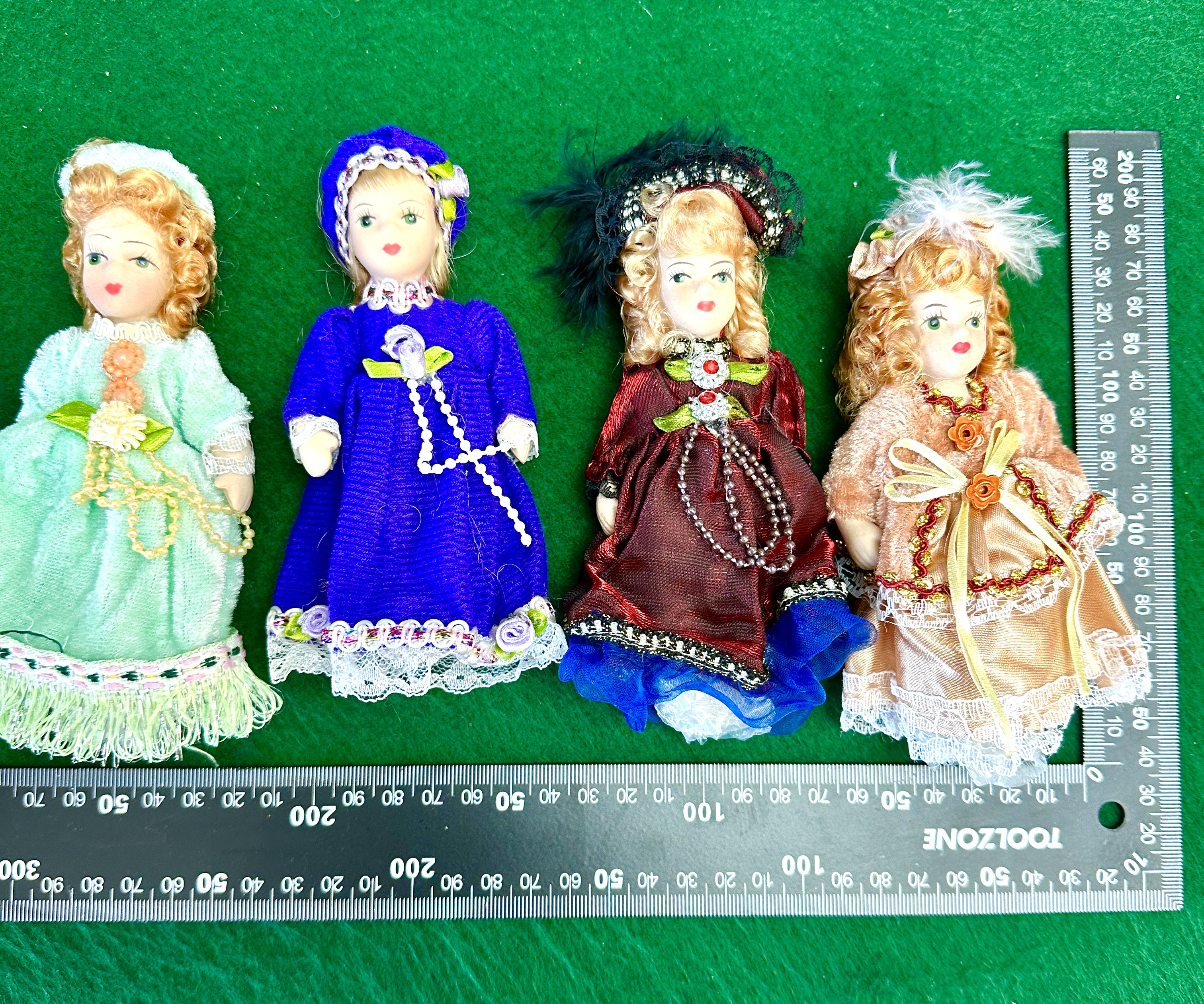 The collection is in good condition. One doll retains original bubble wrap packaging to the lower limbs. Porcelain elements are free from visible chips or cracks. Minor surface wear and light fraying to fabric edges consistent with age and storage.