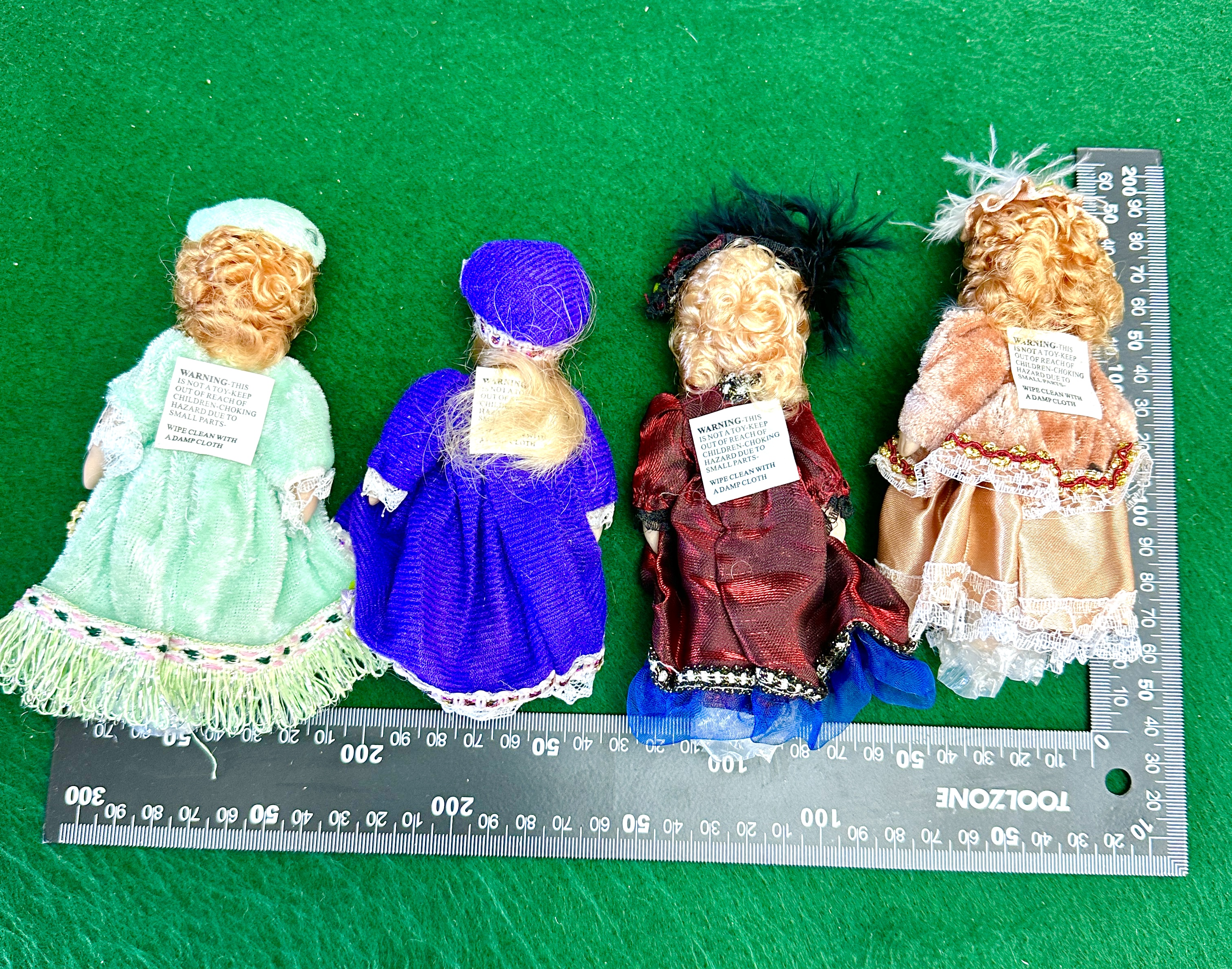 A group of miniature porcelain collector dolls featuring Victorian-inspired styling. Each doll is constructed with painted bisque porcelain heads, hands, and feet. The figures are dressed in elaborate fabric costumes including gowns of mint green, royal blue, burgundy, and peach, accented with lace, ribbons, faux pearls, and feathers. The dolls feature synthetic hair in various shades. Each item retains a manufacturer’s warning label on the reverse stating the item is not a toy and intended for decorative use only.