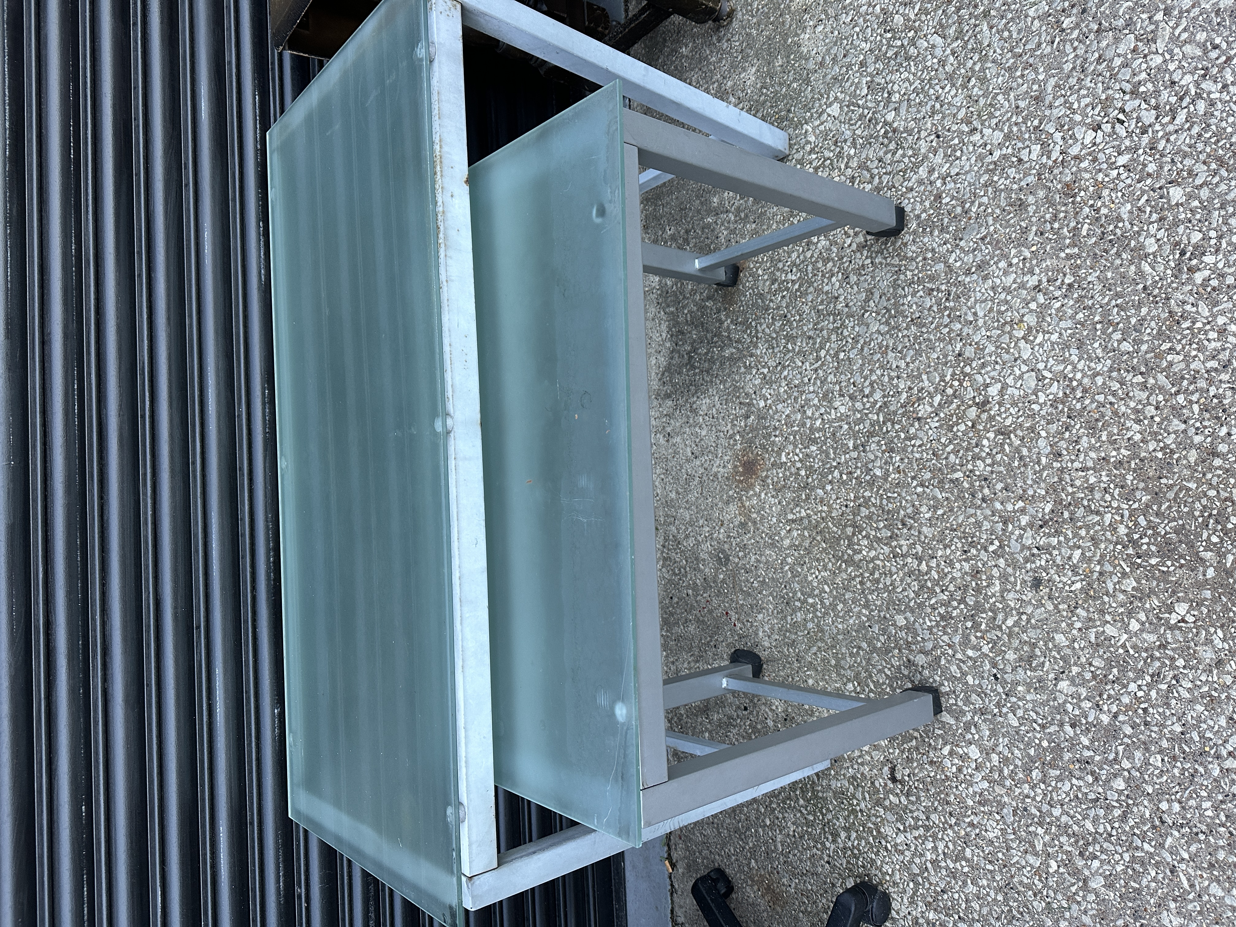 The piece displays signs of surface wear and dust accumulation consistent with prior use and storage. Minor abrasions to the metal frame and light surface scratches to the glass surfaces are present.