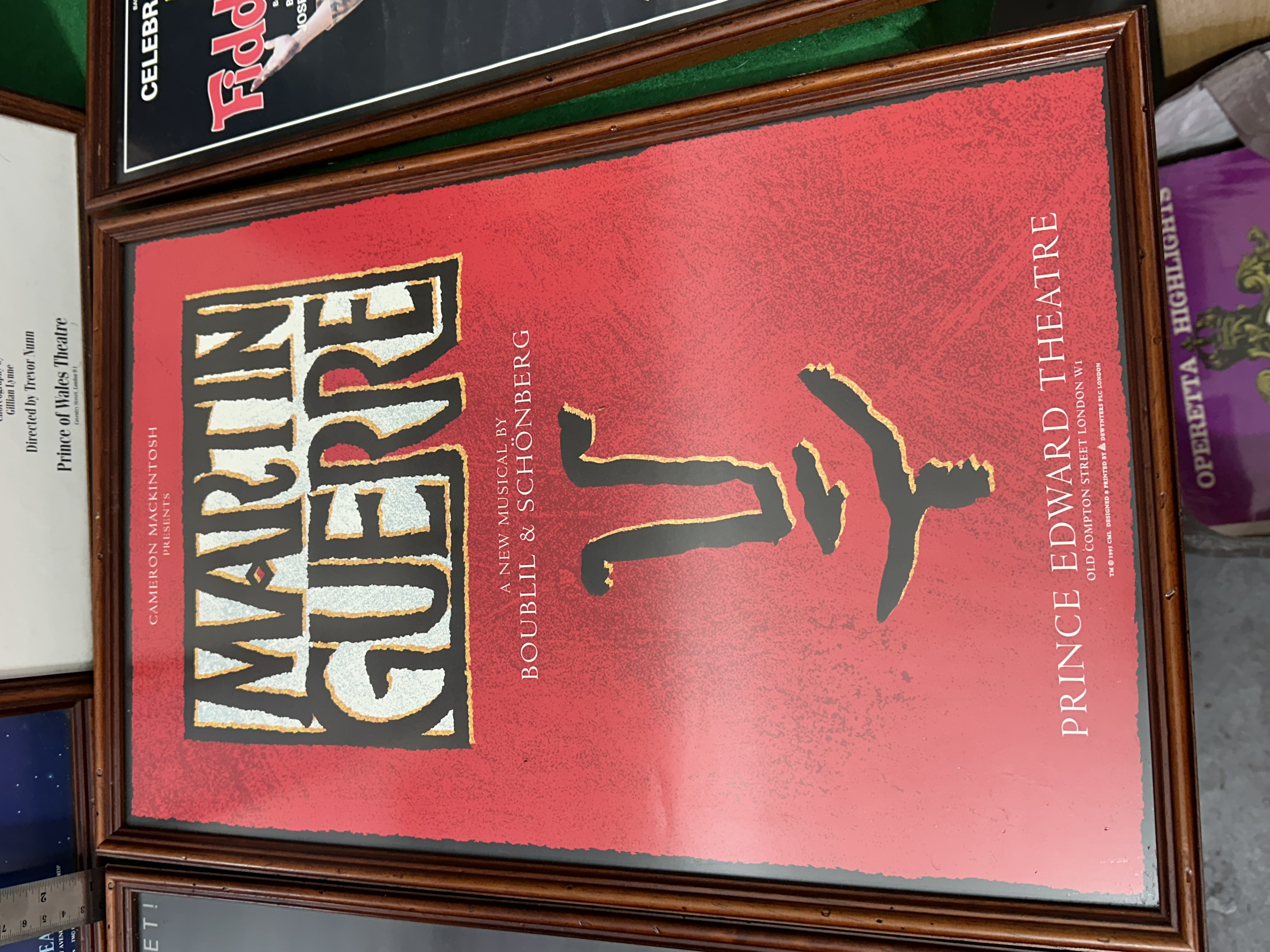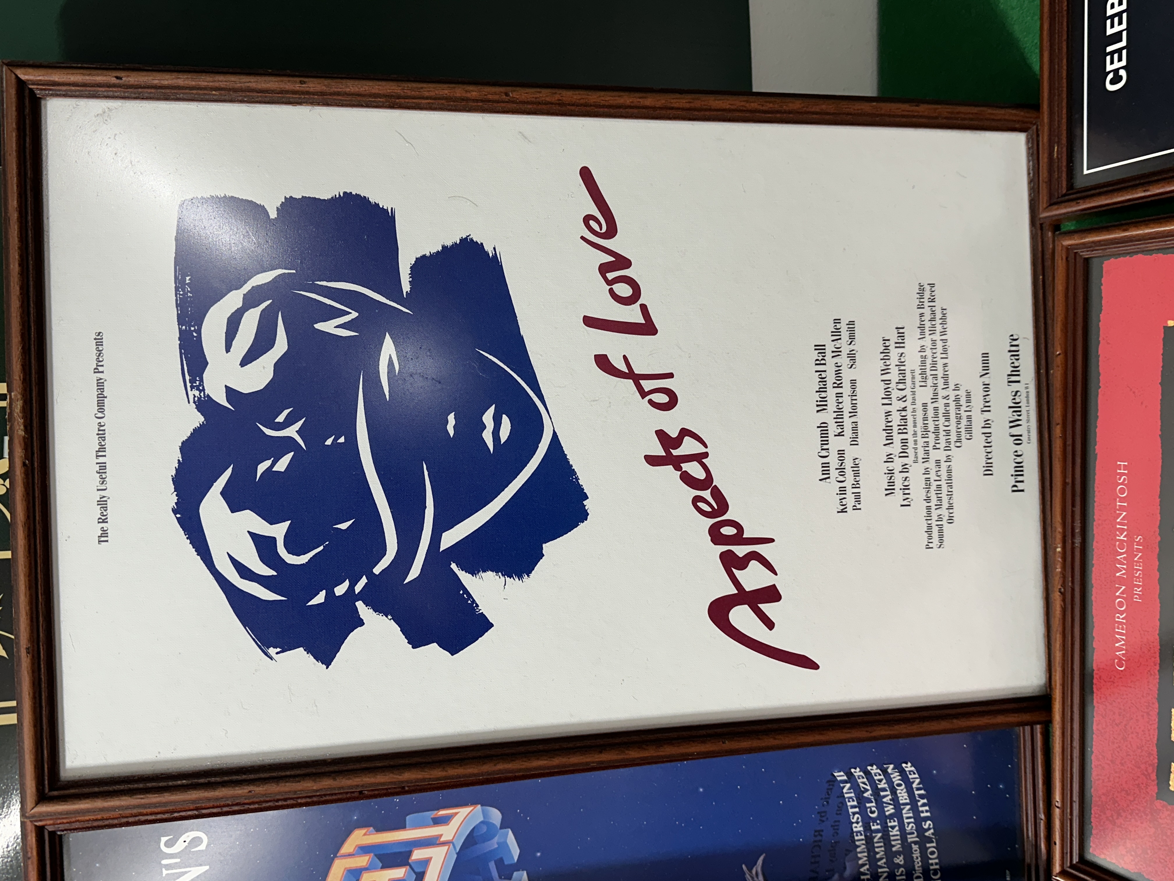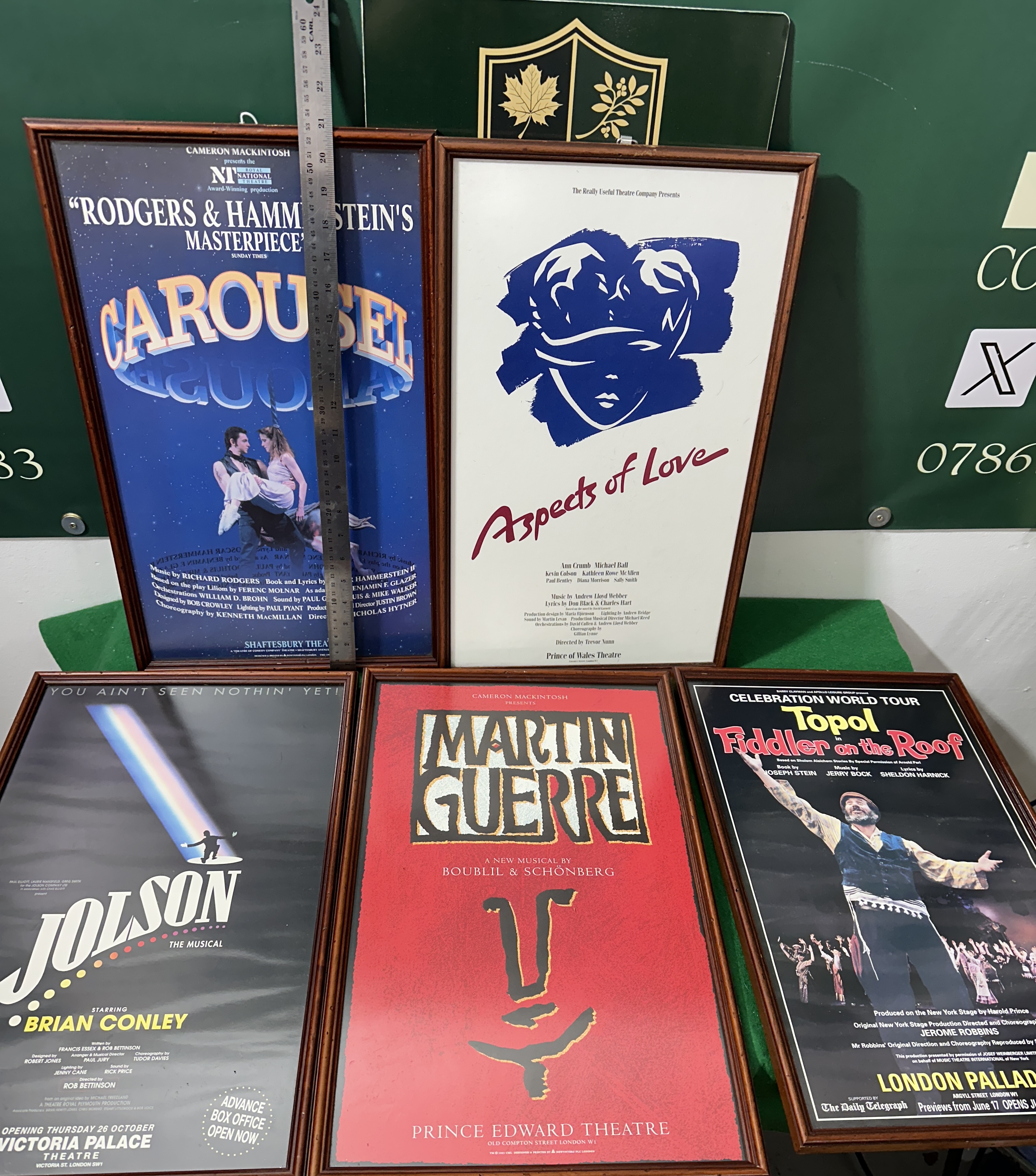 A collection of framed promotional posters for various London West End musical theatre productions, featuring the original 1989 London production of Andrew Lloyd Webber’s Aspects of Love at the Prince of Wales Theatre. The group also includes artwork for the Royal National Theatre production of Carousel at the Shaftesbury Theatre; Jolson starring Brian Conley at the Victoria Palace Theatre; Martin Guerre by Boublil & Schönberg at the Prince Edward Theatre, copyrighted 1995; and the Celebration World Tour of Fiddler on the Roof starring Topol at the London Palladium. Each poster is housed in a matching dark-toned wood frame under glass.