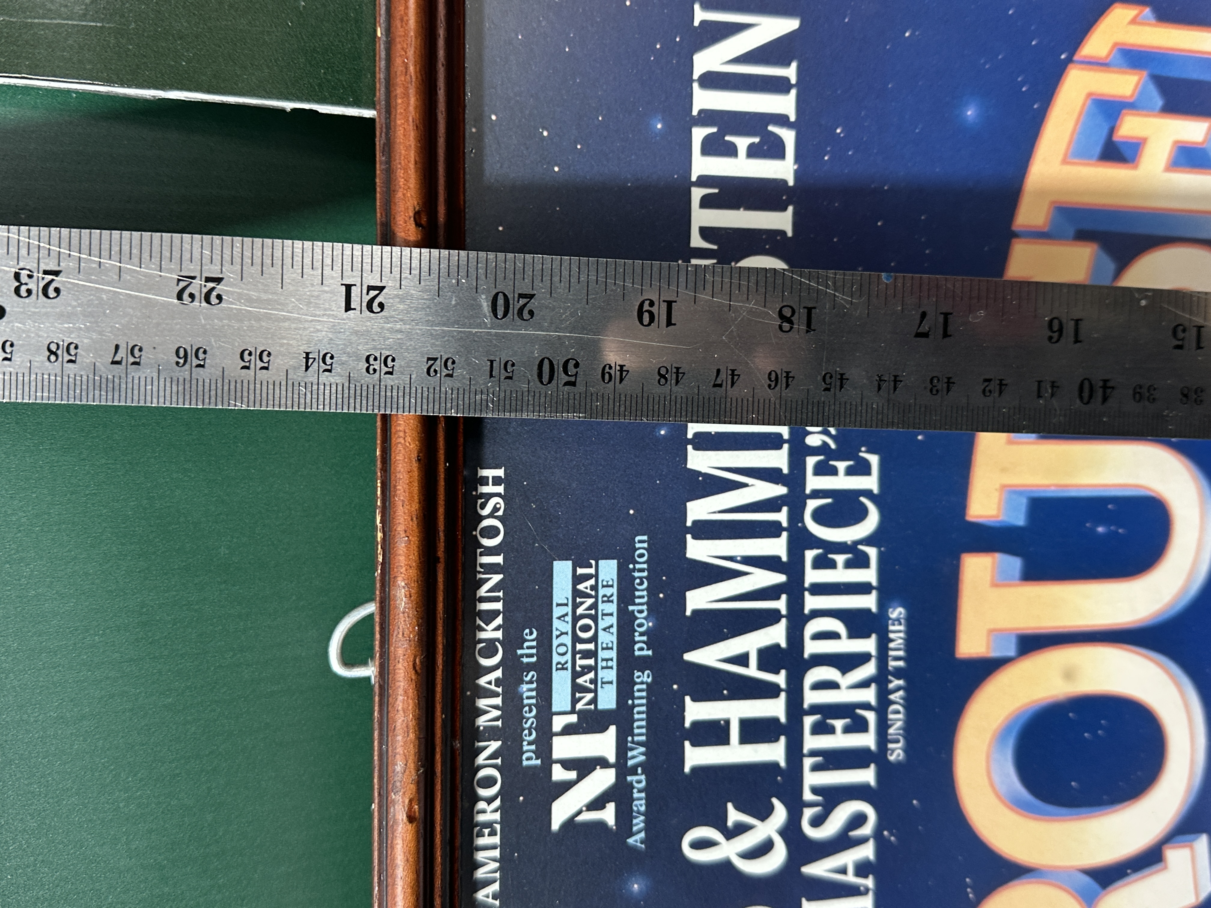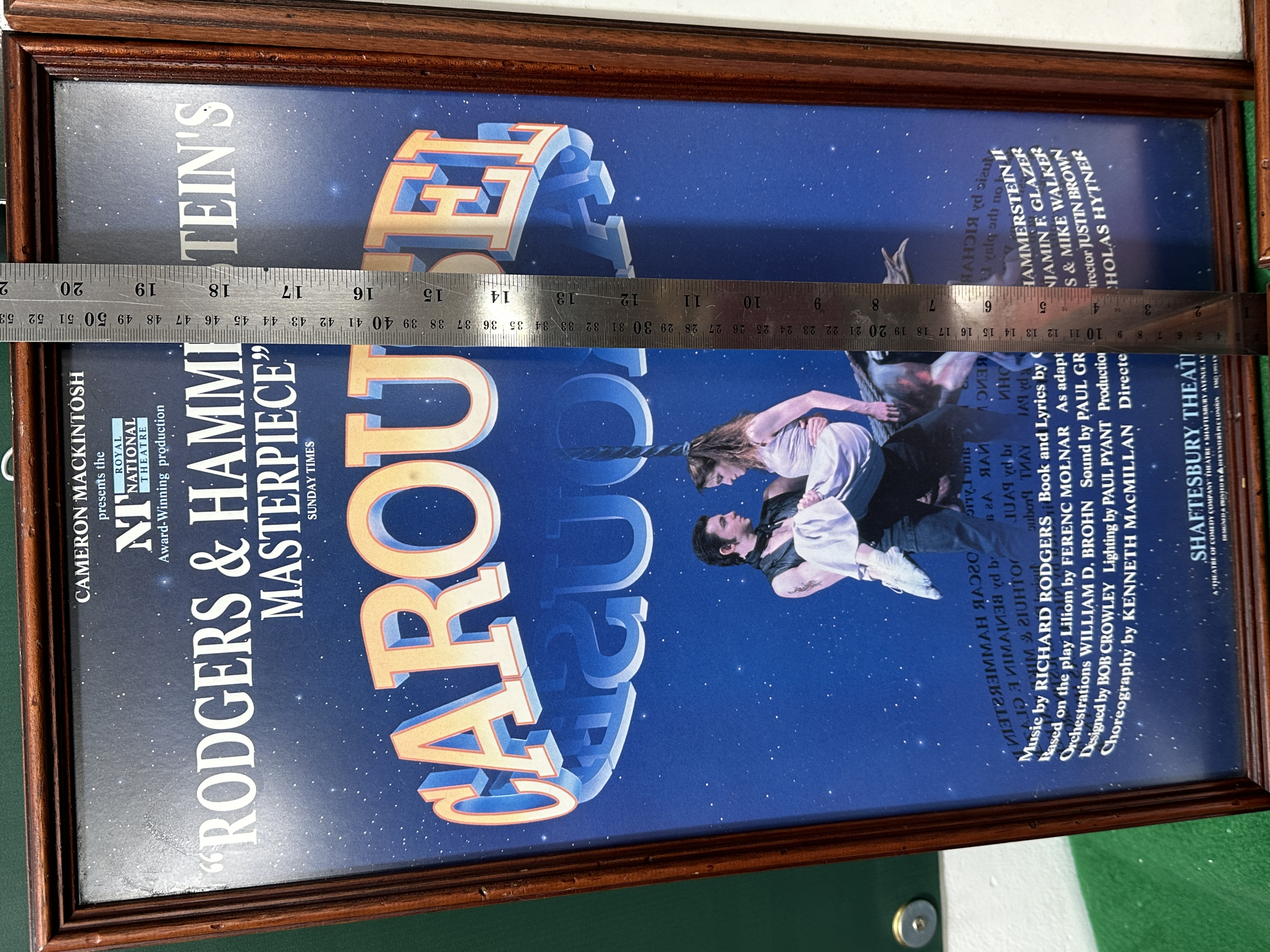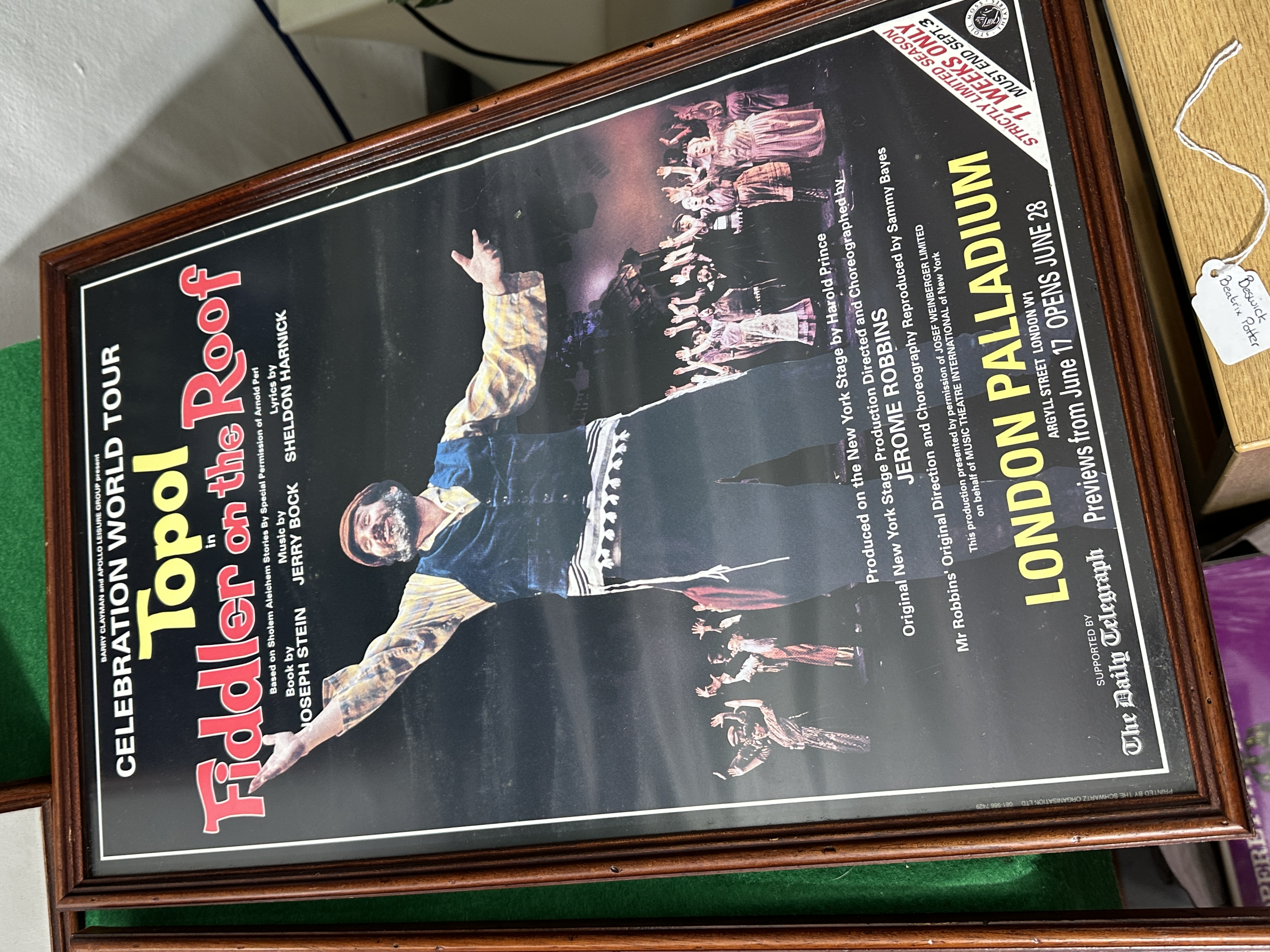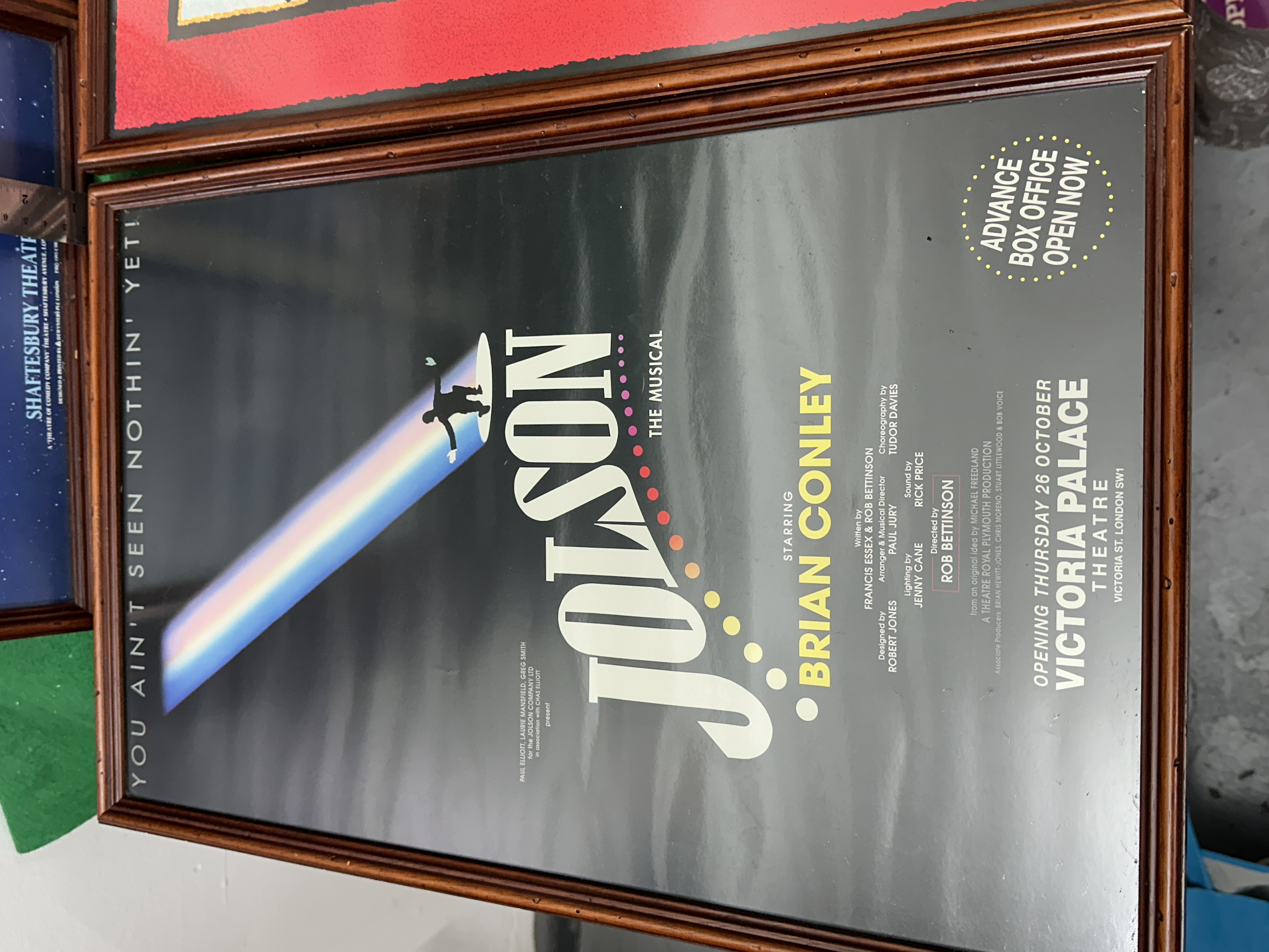 A collection of framed promotional posters for various London West End musical theatre productions, featuring the original 1989 London production of Andrew Lloyd Webber’s Aspects of Love at the Prince of Wales Theatre. The group also includes artwork for the Royal National Theatre production of Carousel at the Shaftesbury Theatre; Jolson starring Brian Conley at the Victoria Palace Theatre; Martin Guerre by Boublil & Schönberg at the Prince Edward Theatre, copyrighted 1995; and the Celebration World Tour of Fiddler on the Roof starring Topol at the London Palladium. Each poster is housed in a matching dark-toned wood frame under glass.