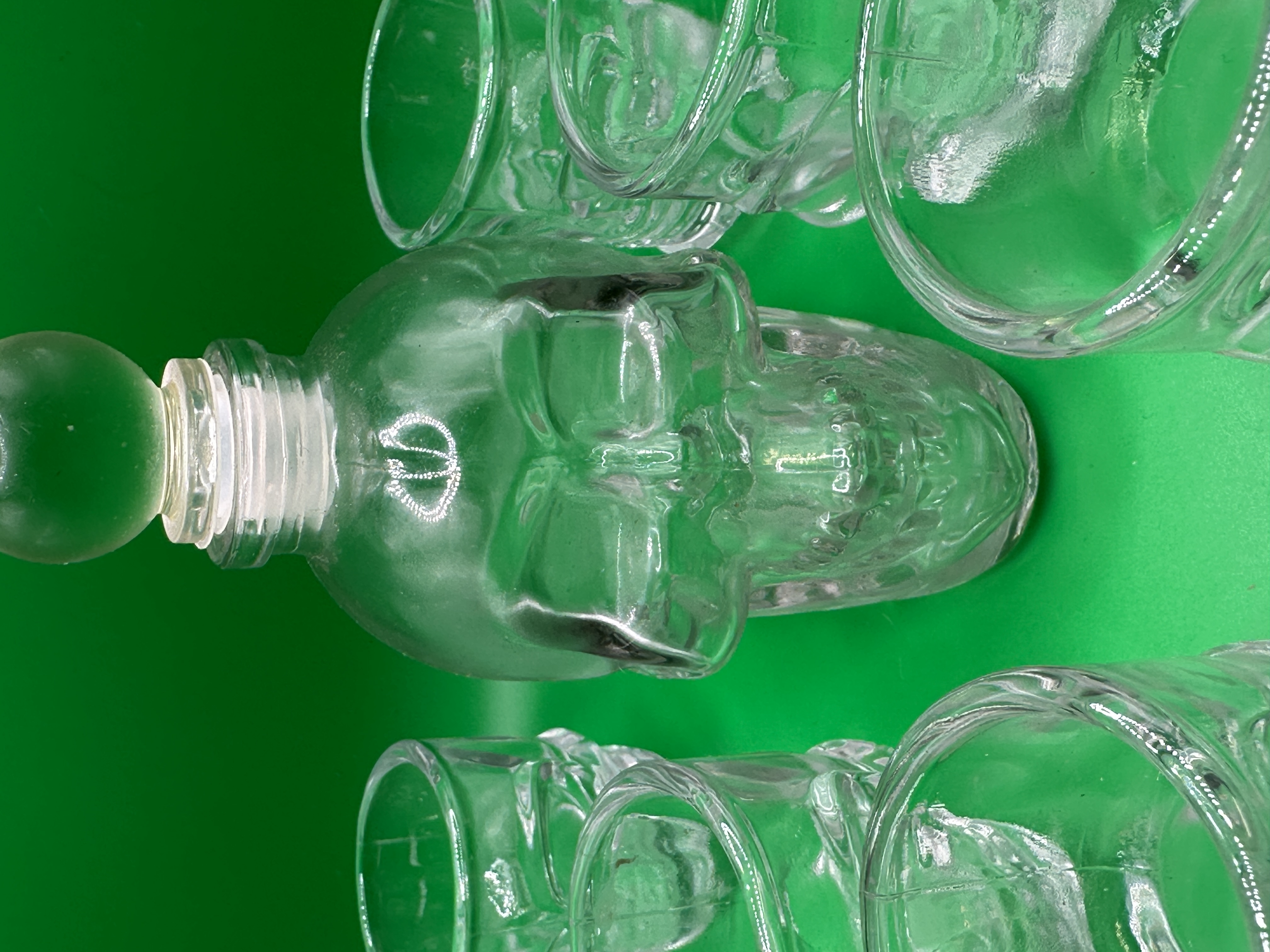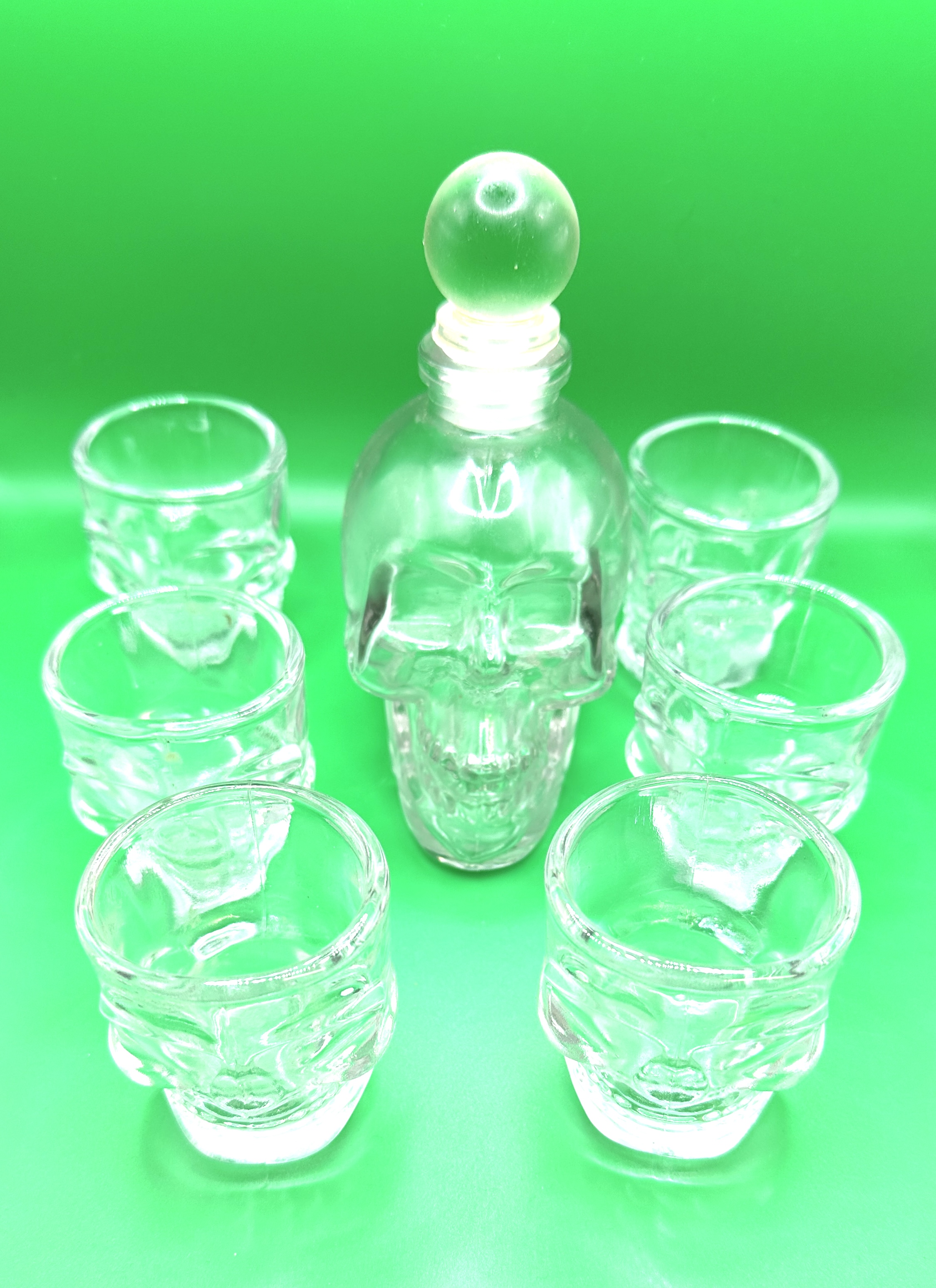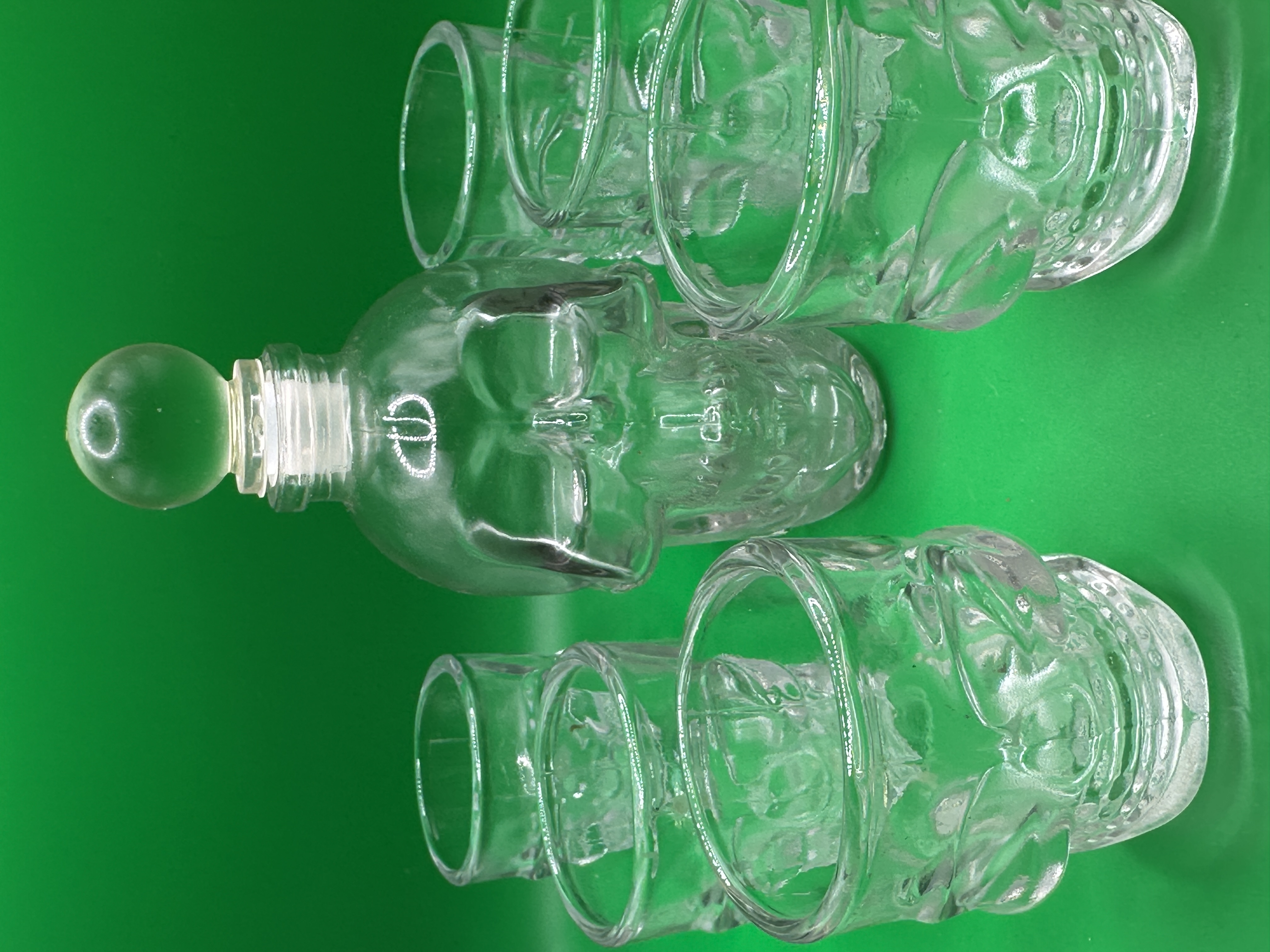 A Godinger glass barware set featuring a decanter and matching shot glasses. Each piece is constructed from clear, moulded glass in a novelty human skull design. The decanter is detailed with anatomical features including eye sockets, nasal cavities, and a defined jawline, and is topped with a clear spherical glass stopper. The coordinating shot glasses repeat the skull motif on a smaller scale. No maker’s marks or inscriptions are visible on the pieces.