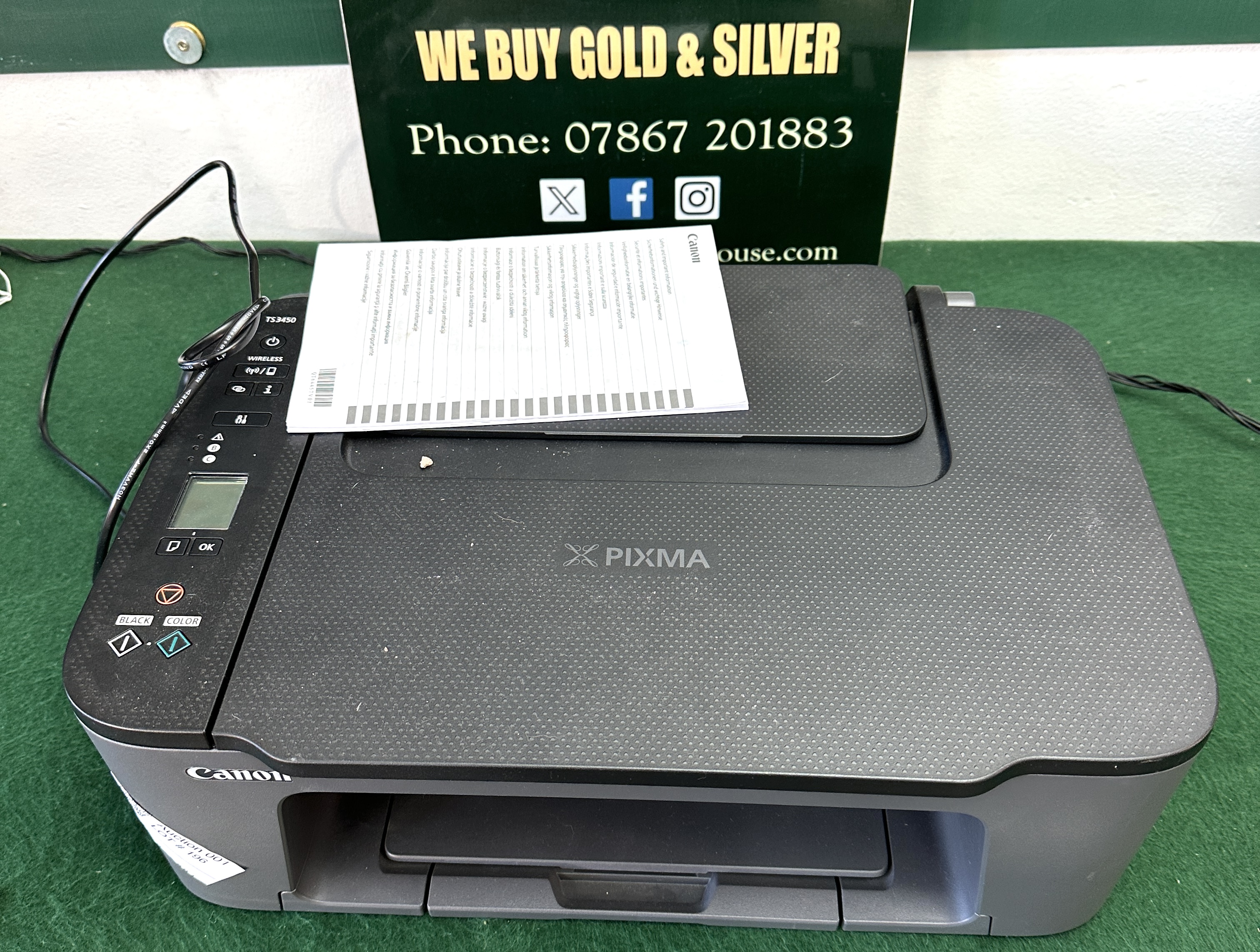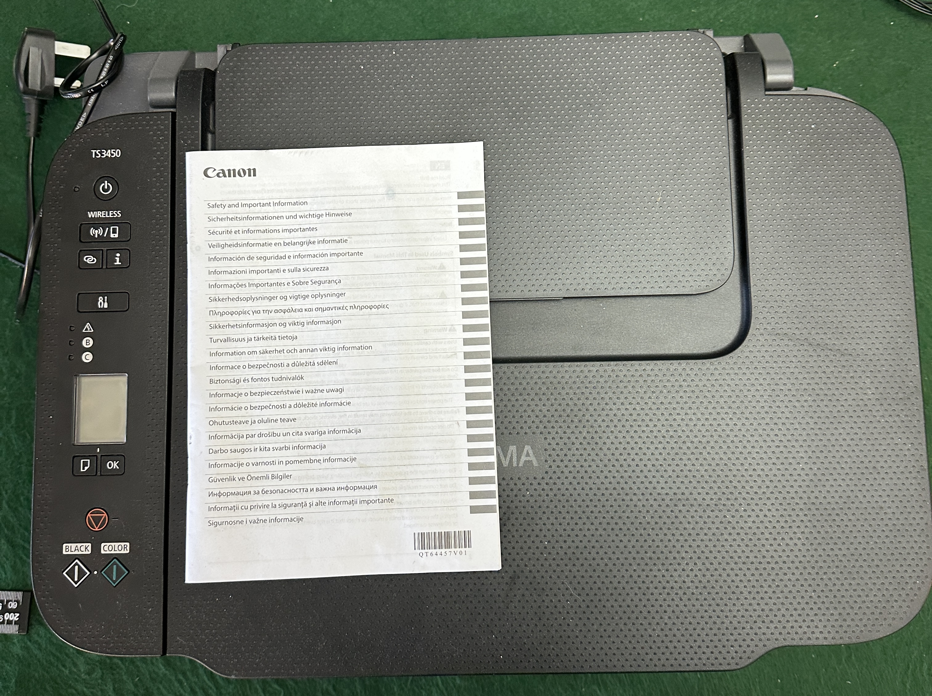 A Canon PIXMA TS3450 all-in-one inkjet printer, featuring a two-tone black and grey plastic housing with a dimpled, textured finish on the top surface. The control panel is situated on the left side, containing an LCD status screen and buttons for power, wireless connectivity, and dedicated black and colour copy functions. The unit displays the Canon and PIXMA brand markings along with the model number TS3450. It is accompanied by an attached power cable with a three-pin UK plug and a Safety and Important Information instructional sheet.