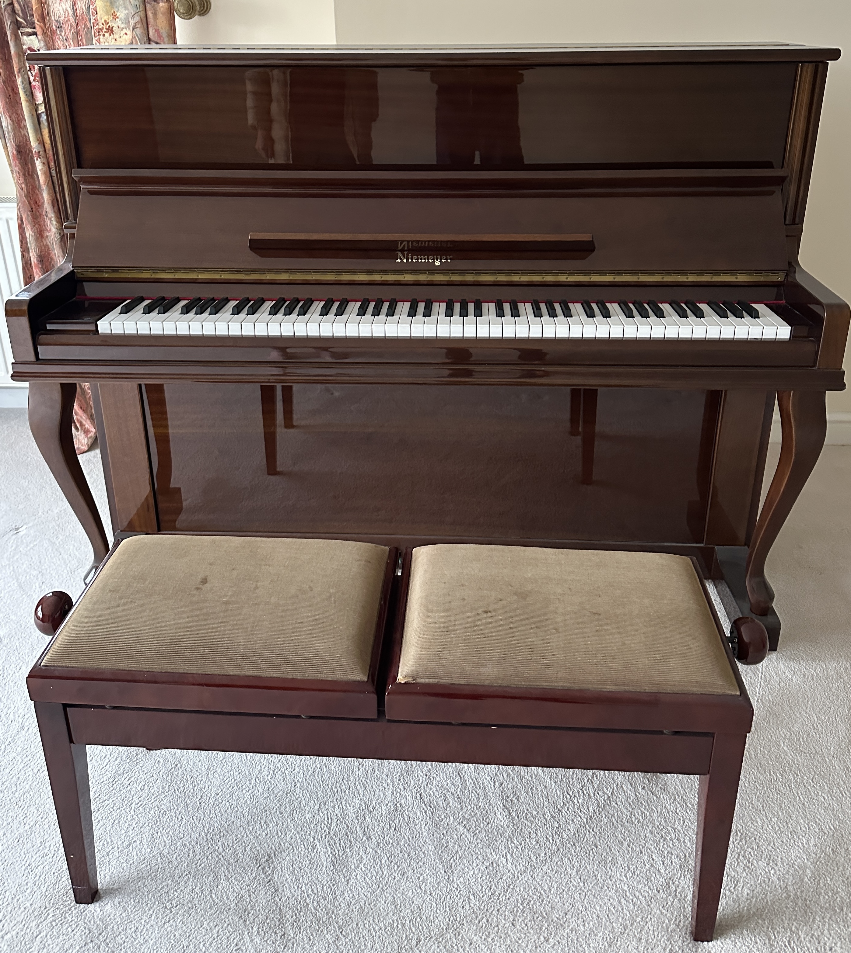 A trio of furniture items featuring a Pearl River manufactured upright piano, branded Niemeyer on the fallboard. The piano is finished in a high-gloss dark wood-tone casing with gilt lettering. The interior mechanism includes hammers, strings, and a soundboard of standard construction. Accompanying the piano is a matching bench with a coordinating dark wood finish and a tan-coloured, two-section upholstered seat. Also included is a vintage chest of drawers constructed with burl wood veneers and dark-patinated metal pull handles. The drawers are of solid wood construction.
