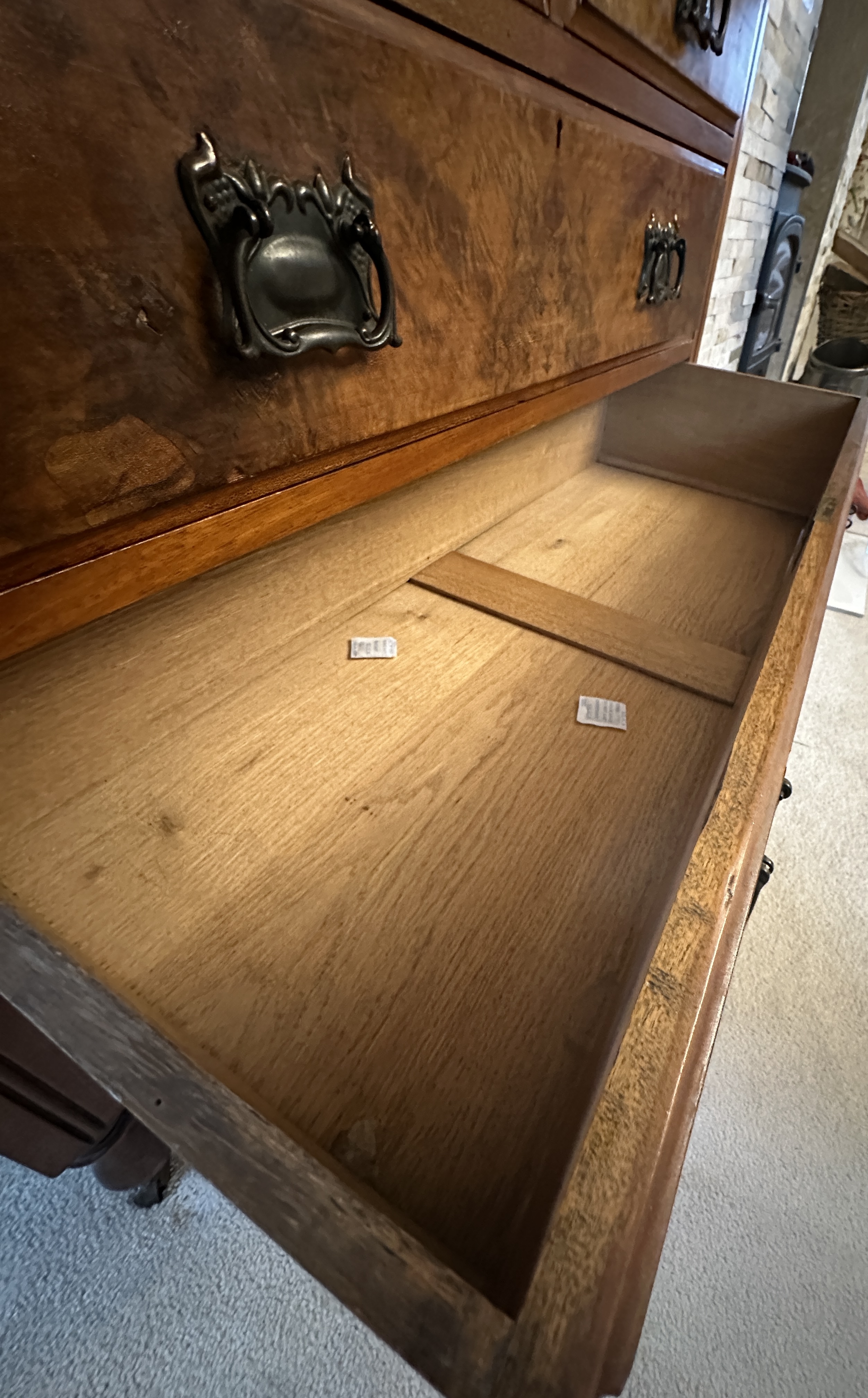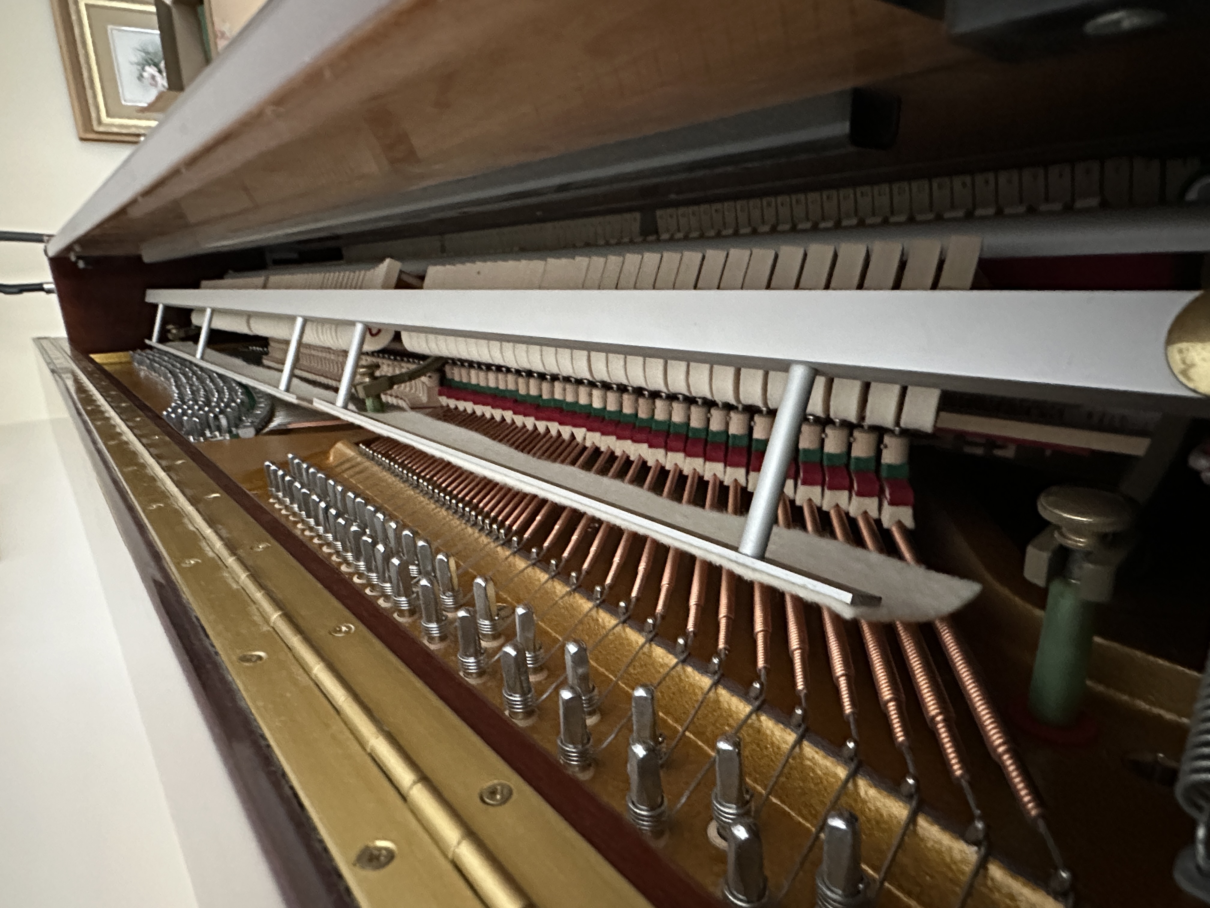 The piano exterior finish is well-preserved with the interior components including hammers and strings appearing in good order. The piano bench shows minor surface marks to the upholstery. The chest of drawers exhibits age-appropriate wear, including minor losses and scuffs to the veneer, while the drawer interiors remain in clean condition.