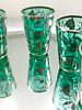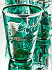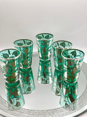 A set of vintage drinking glasses of tapered cylindrical form, crafted from vibrant teal-coloured glass. Each glass features an extensive silver overlay or deposit design in a floral and foliate pattern with scrolling vine accents, finished with a silver-wrapped rim. The collection is accompanied by a circular mirrored tray featuring a textured border. The silver decoration is applied to the exterior of the translucent coloured glass.