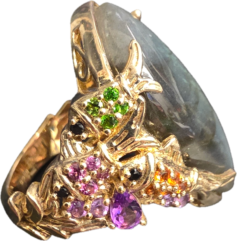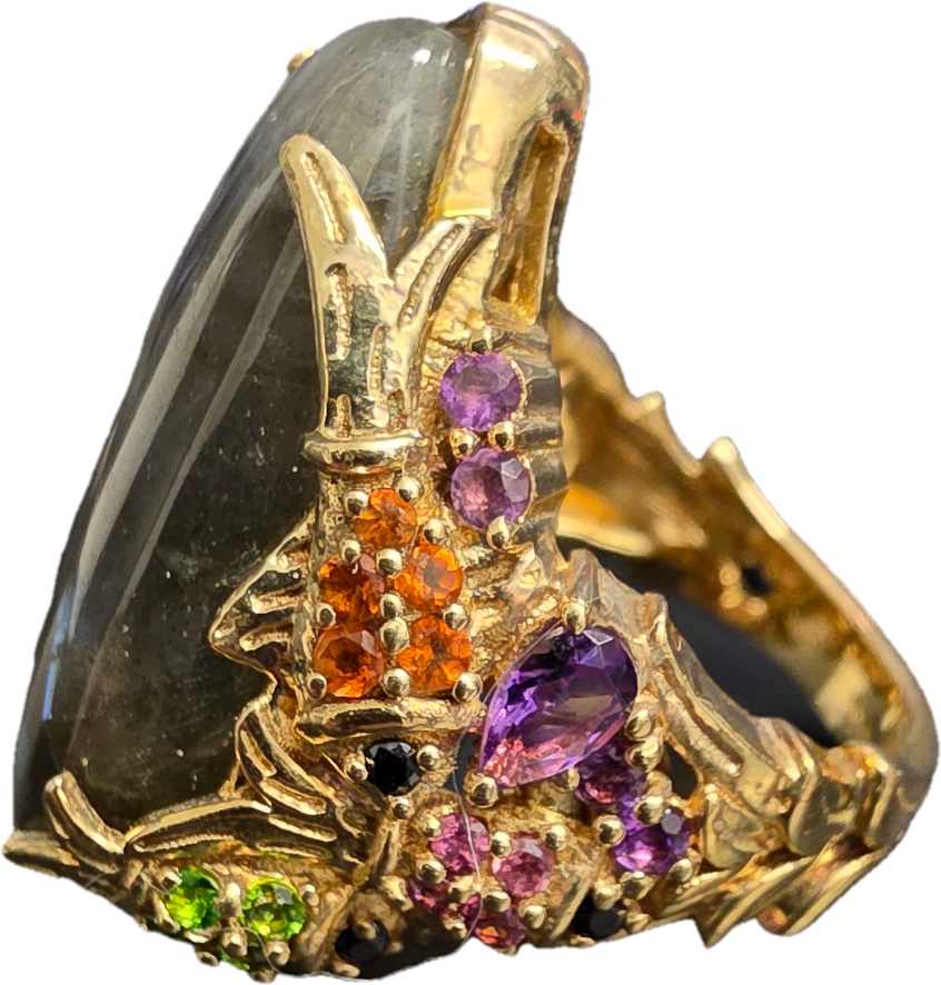 A statement ring featuring a large free-form labradorite cabochon as the central focus. The labradorite exhibits characteristic labradorescence with visible flashes of green and blue. The gemstone is held within a highly textured 925 silver-gilt setting, designed with whimsical or mythical animal motifs including stylized scaly elements reminiscent of fish or dragons. The setting and shank are further embellished with an assortment of multi-coloured accent gemstones, including round and pear-cut stones in shades of purple, pink, orange, green, and black. The piece demonstrates complex artisan construction with a textured finish throughout the metalwork. No hallmarks or maker marks are visible.